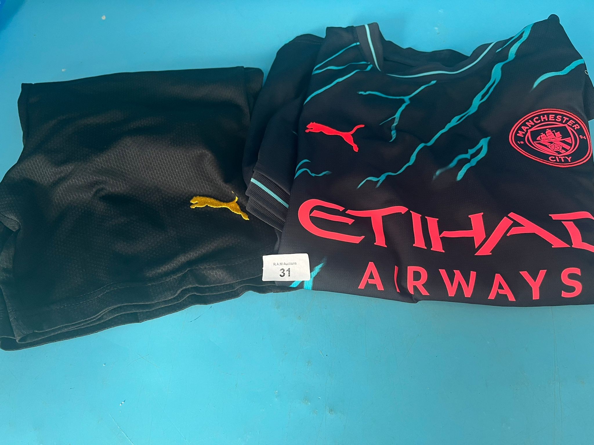 Black athletic apparel set with teal lightning bolt pattern, pink lettering, and Manchester City crest.
