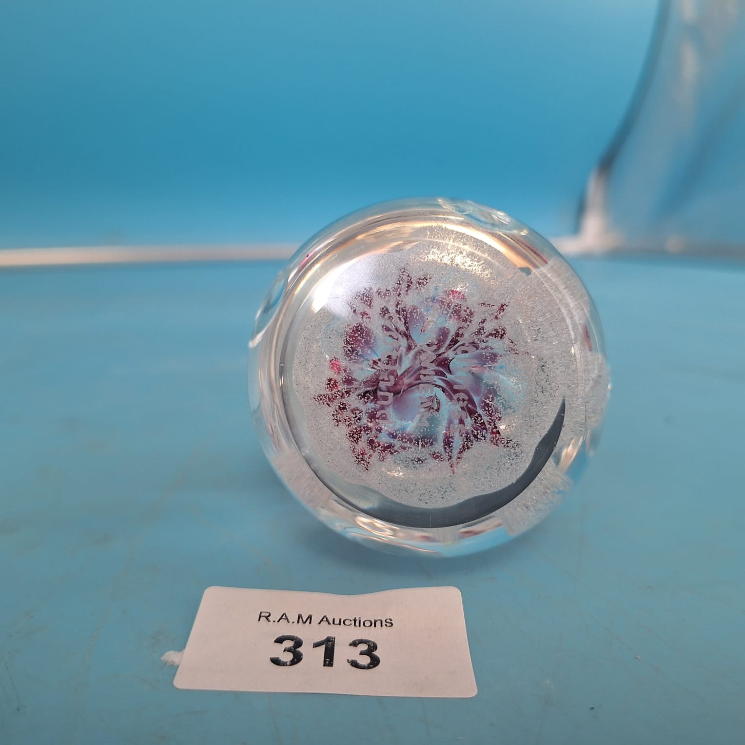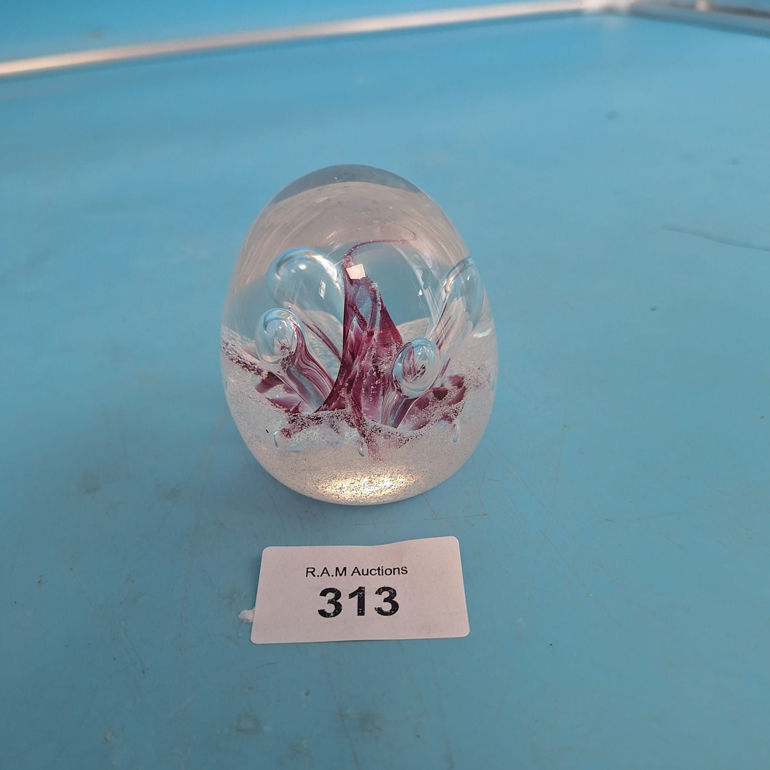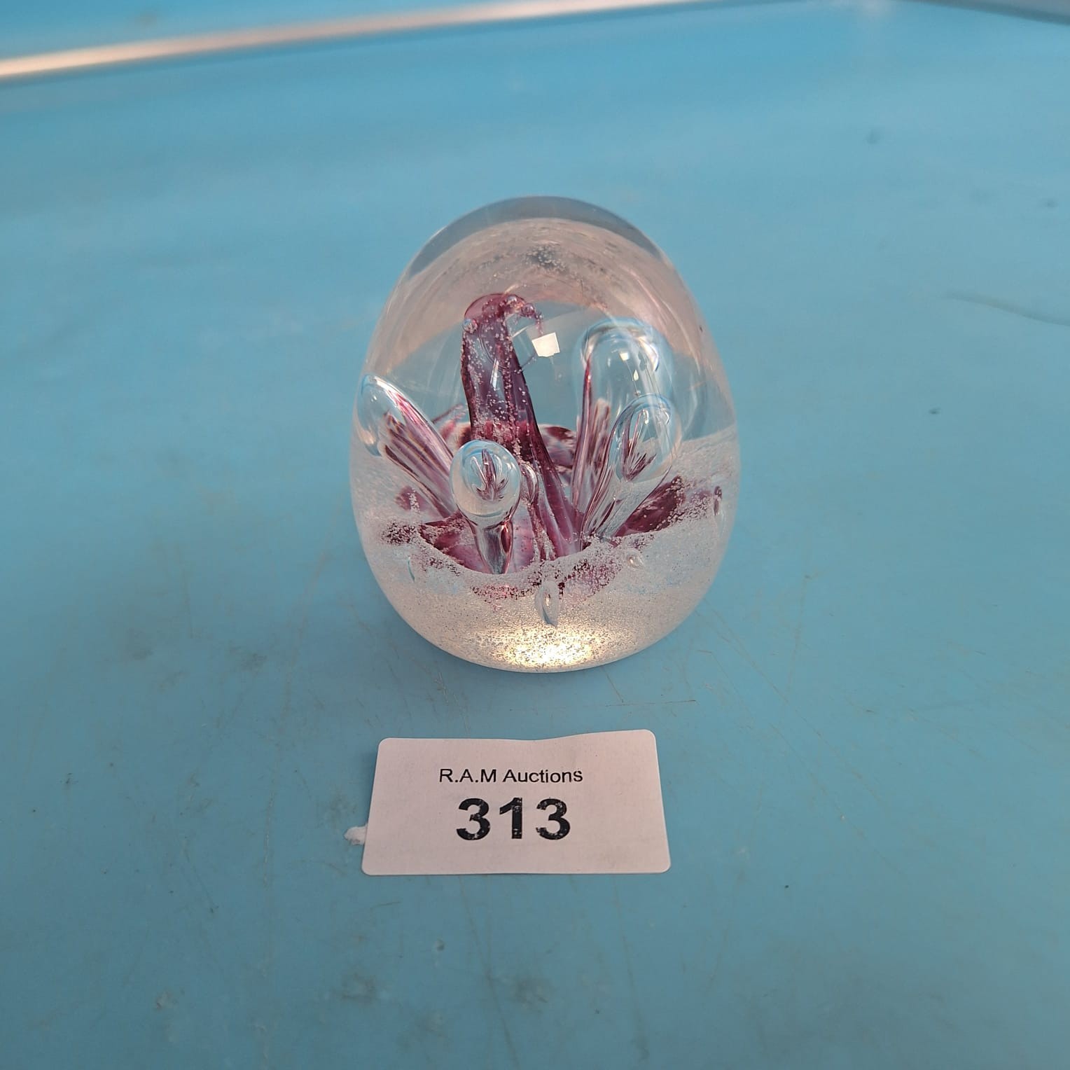 Ovoid clear glass paperweight with internal purple-pink swirl and visible bubbles, featuring an iridescent base.