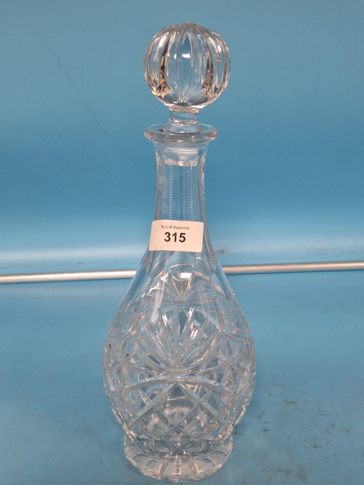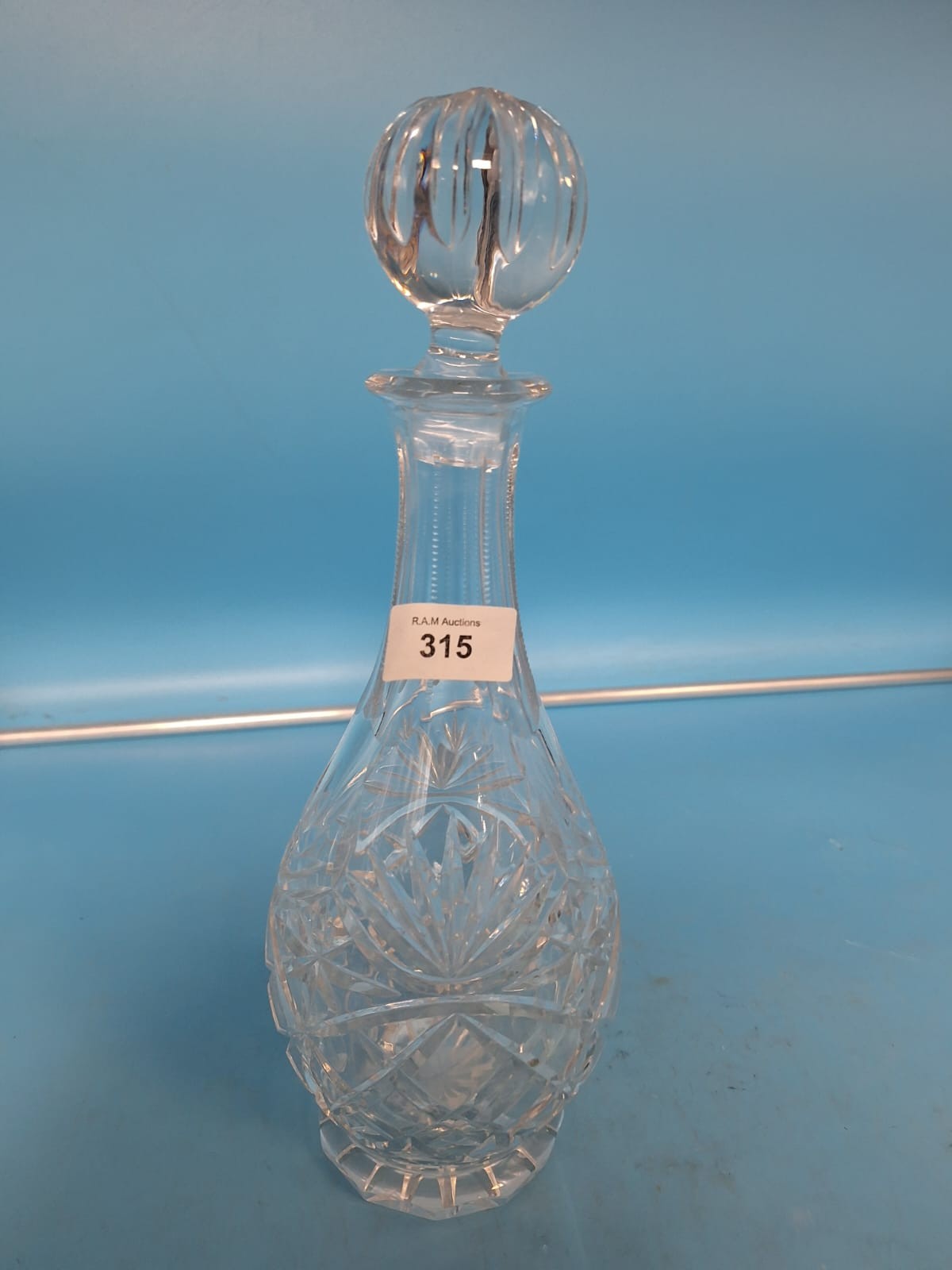 Clear glass decanter with a pear-shaped body and a faceted, spherical stopper, featuring radiating geometric cut-glass patterns.