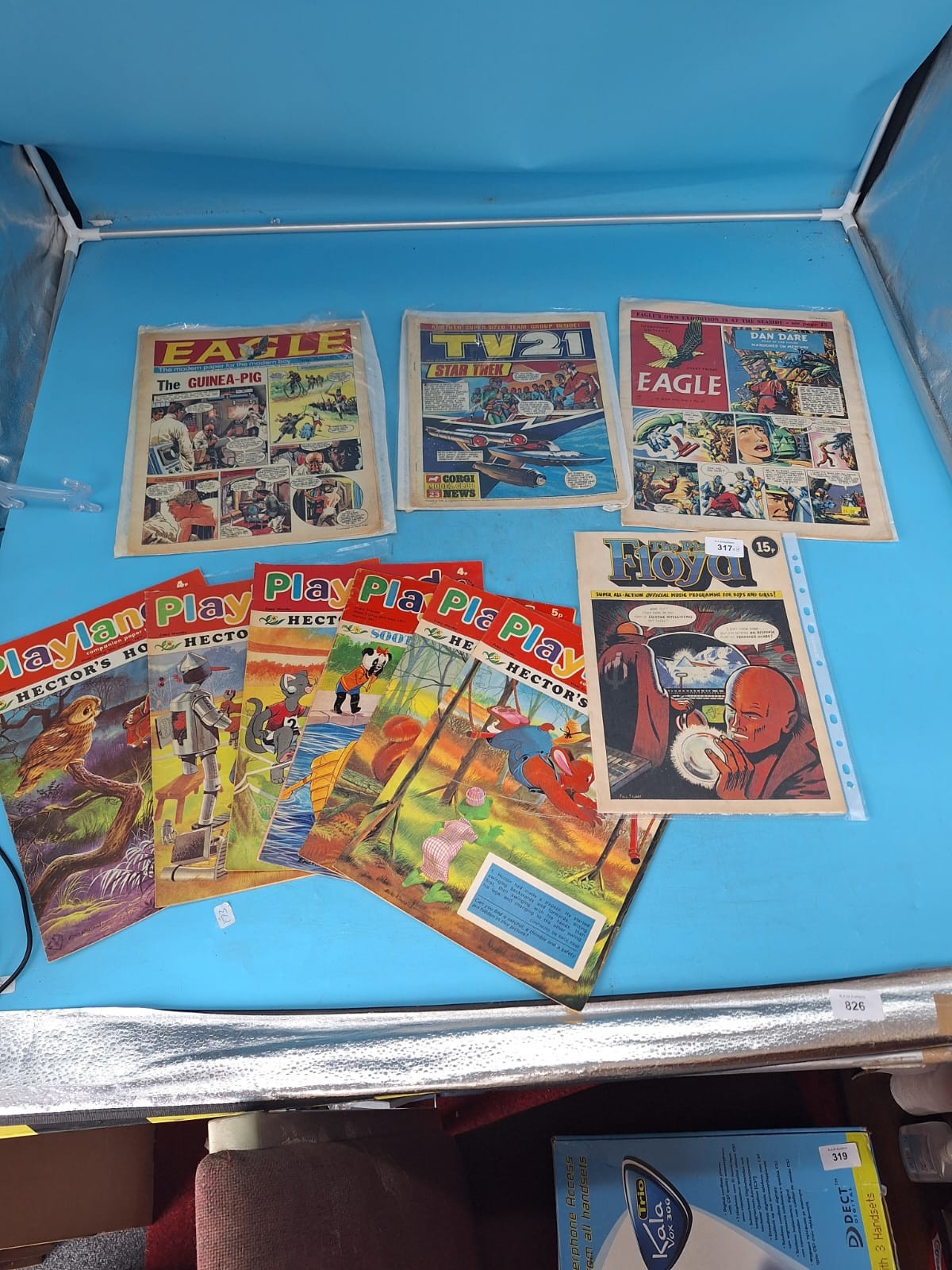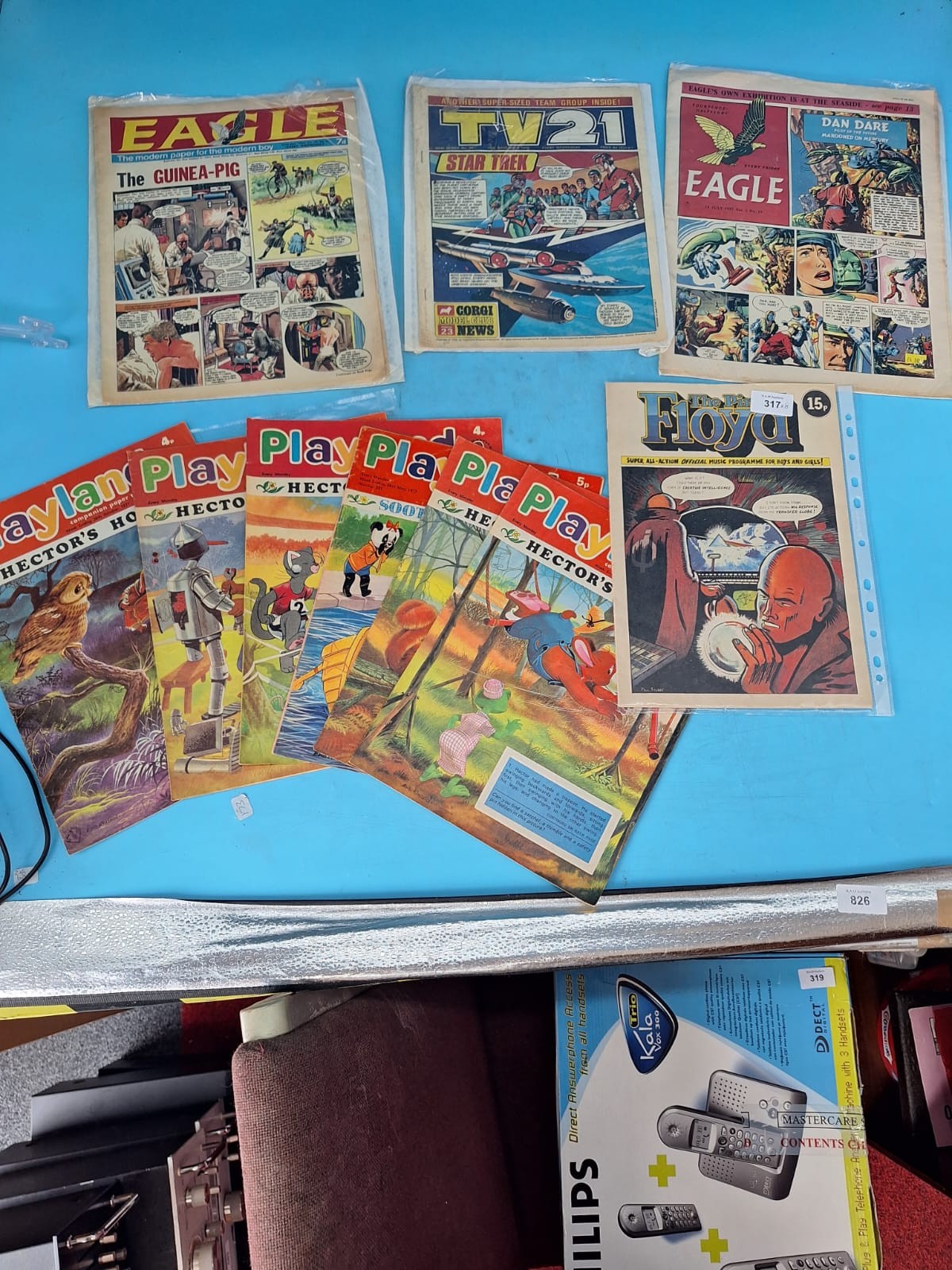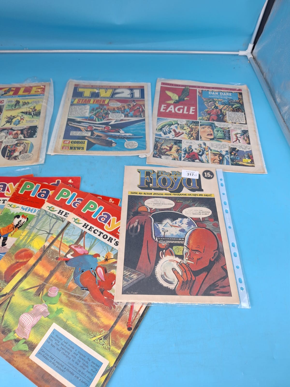Collection of vintage British comics including Eagle, TV21 Star Trek, Dan Dare, Play Floyd, and Play Play Hector comics.