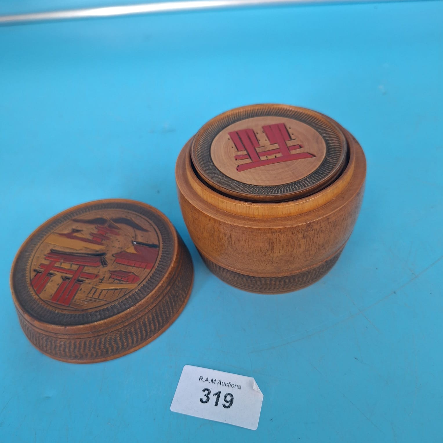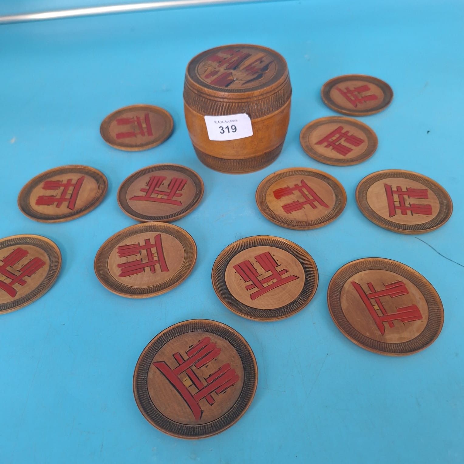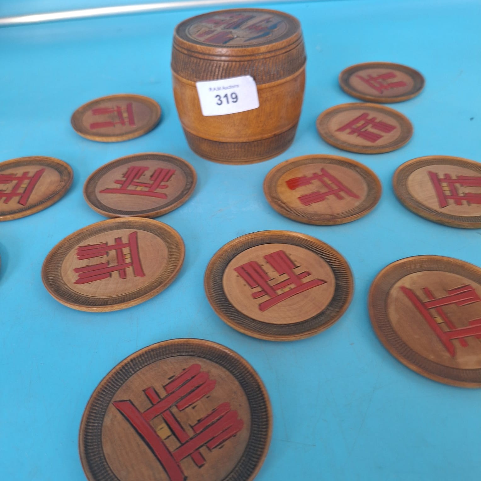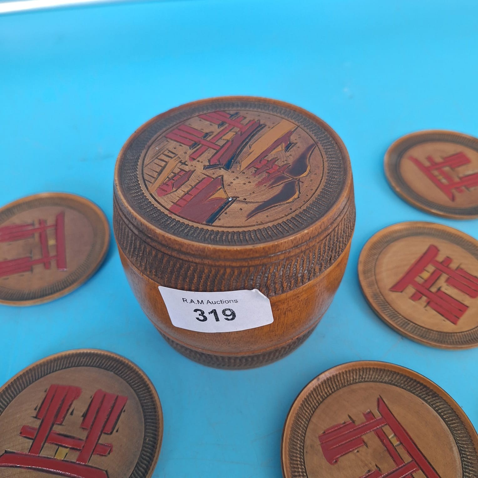 Round wooden coasters with stylized designs in a cylindrical wooden container featuring a painted lid.