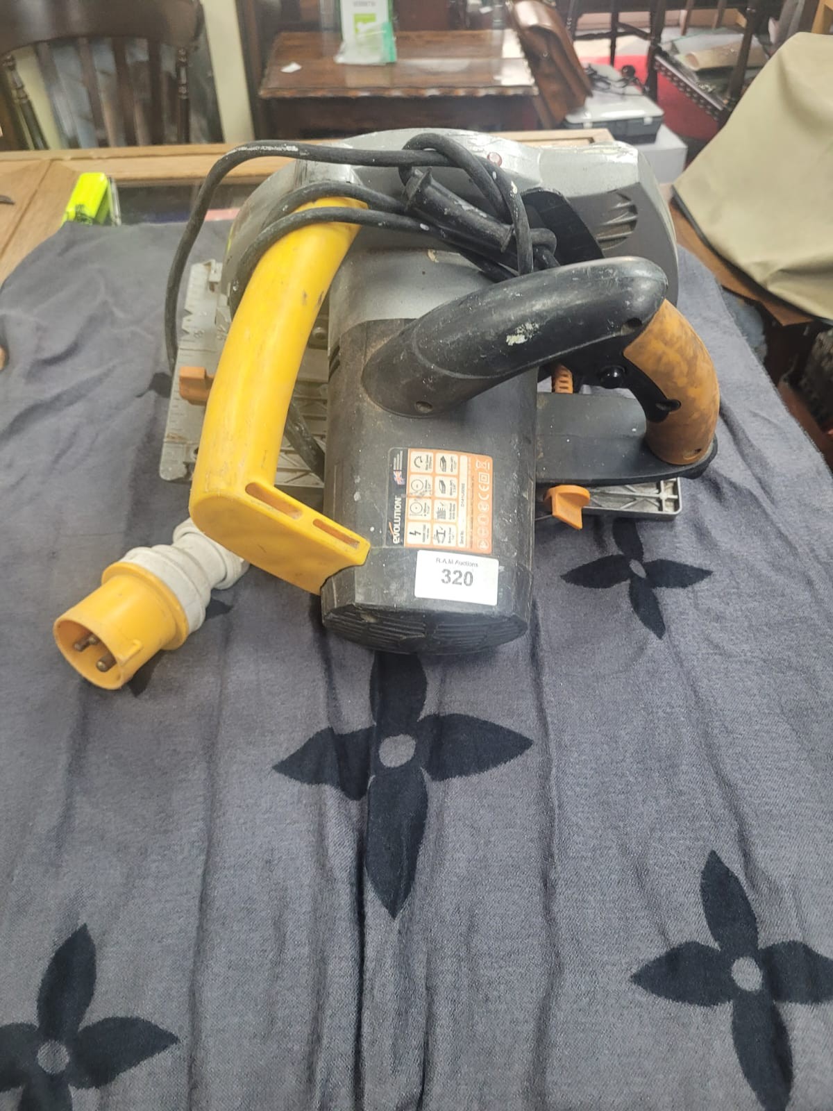 Gray and yellow electric circular saw with yellow auxiliary handle and power cord.