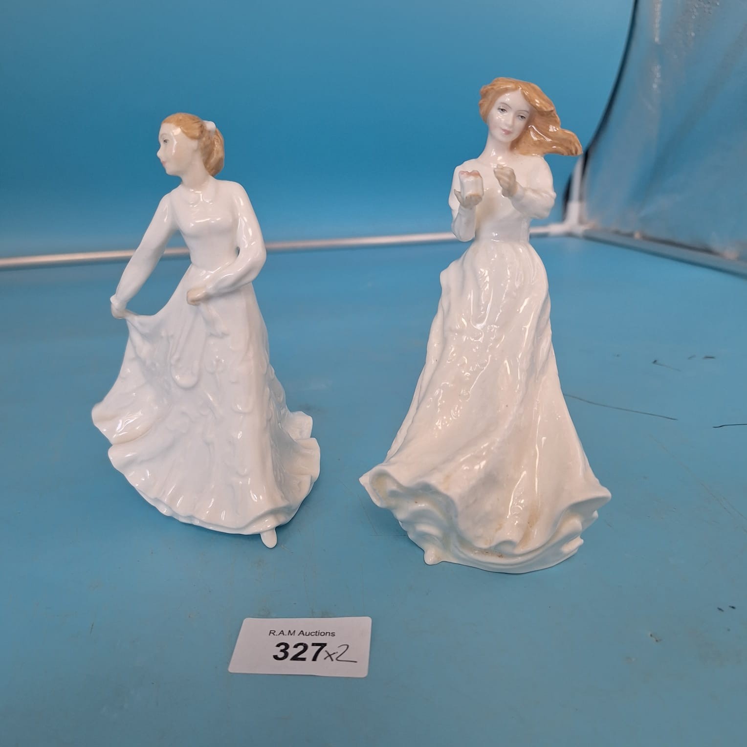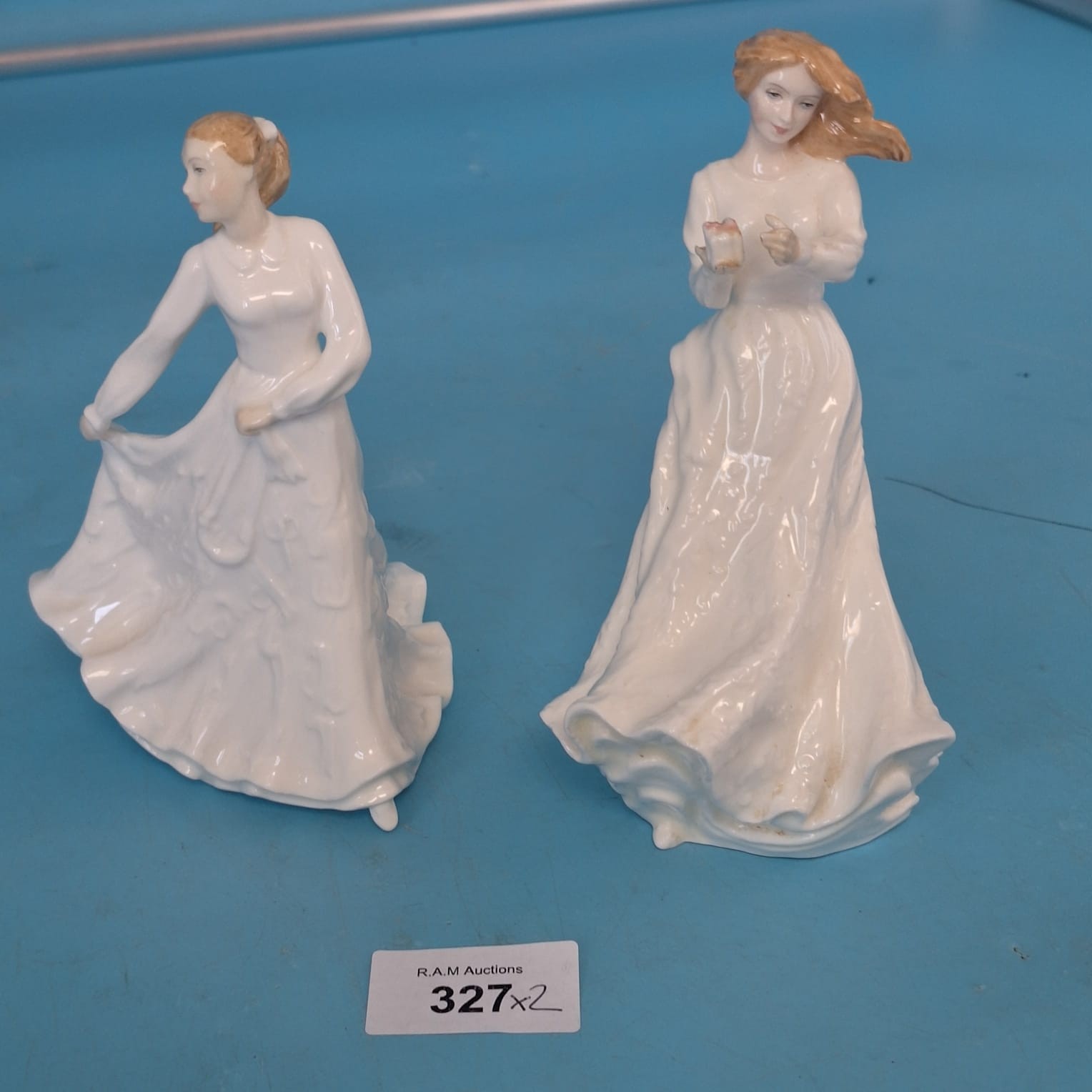 Pair of white porcelain Royal Doulton figurines depicting women in flowing dresses.