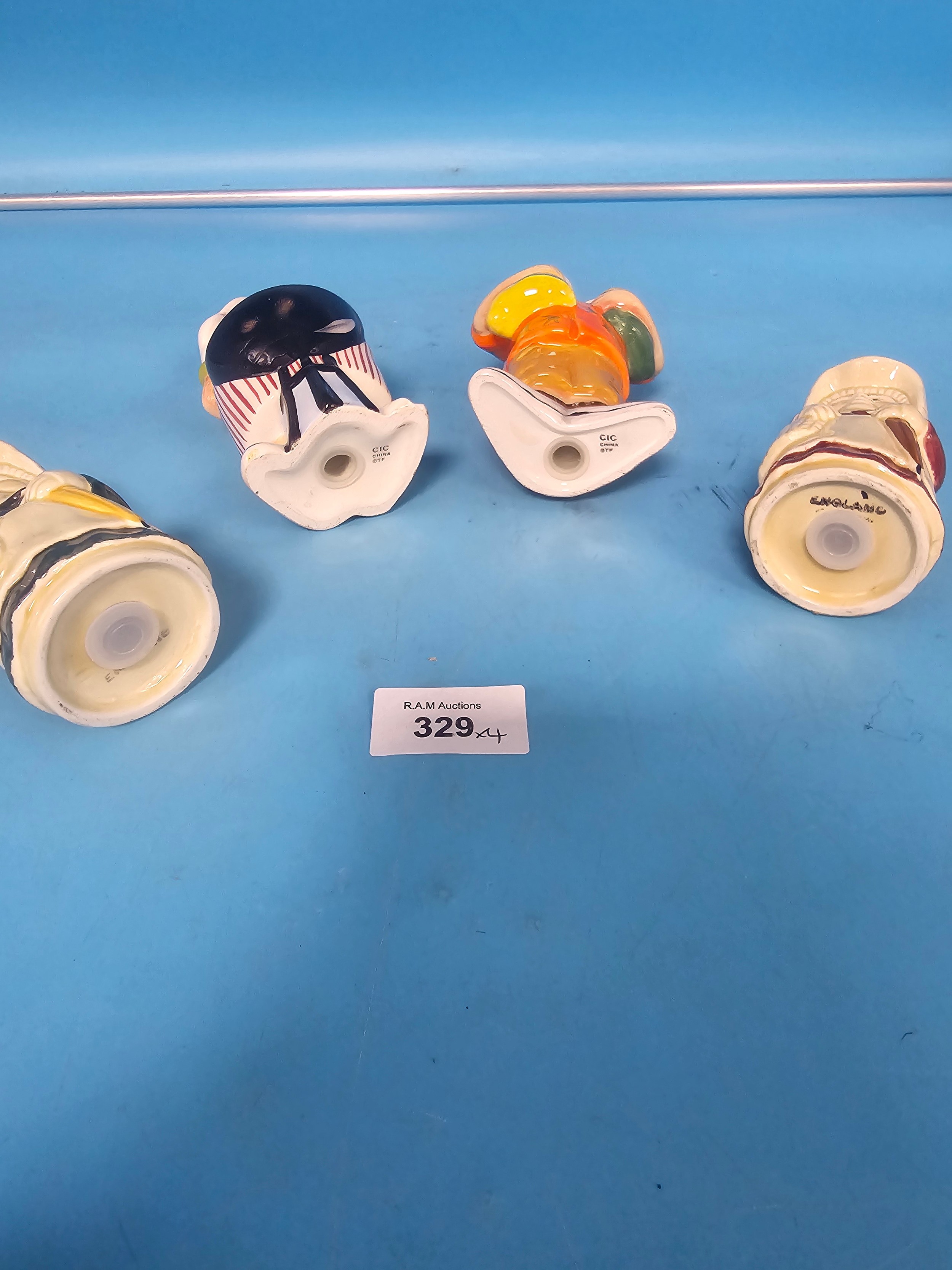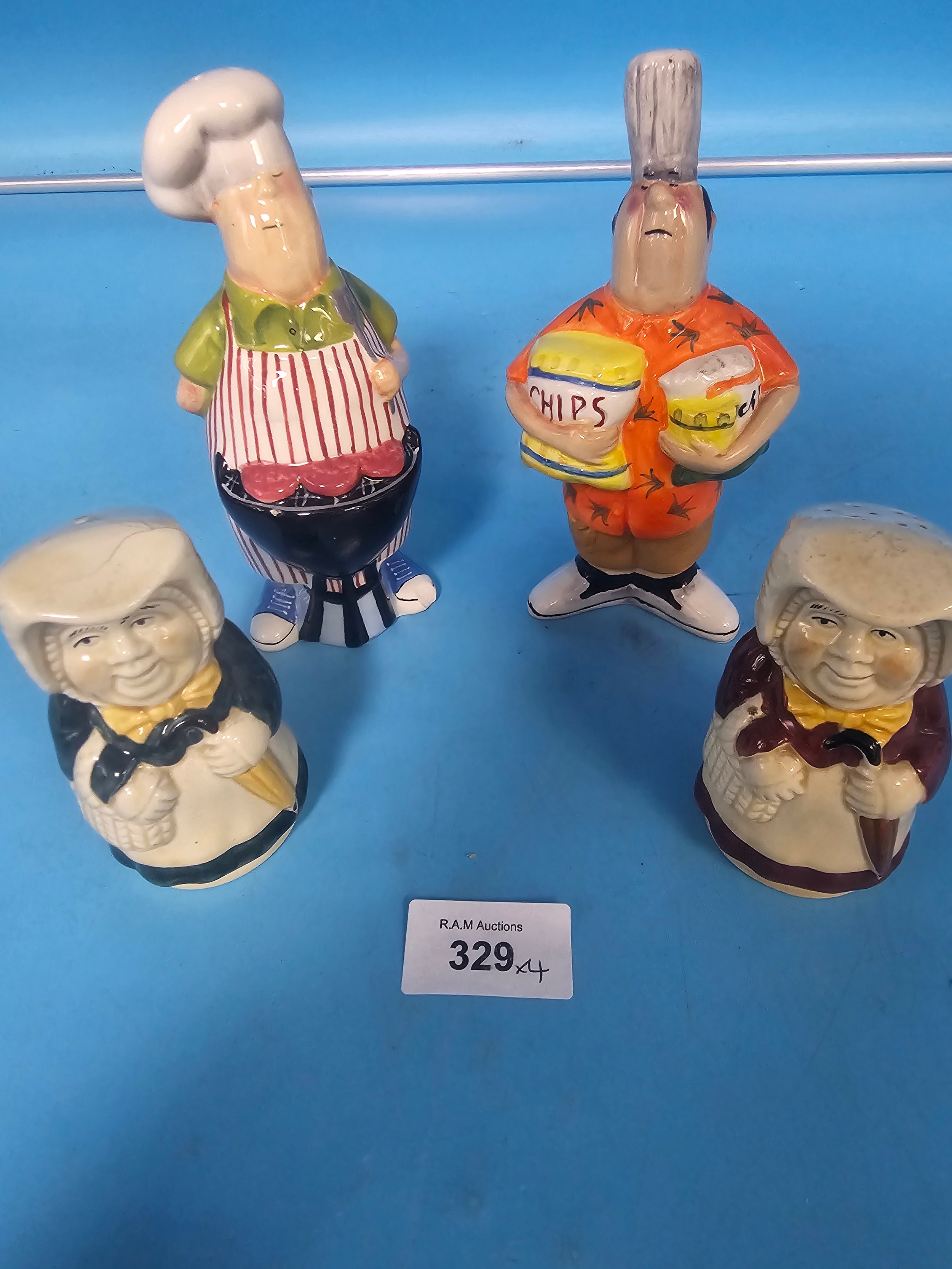 Hand-painted ceramic salt and pepper shakers featuring caricatured figures.