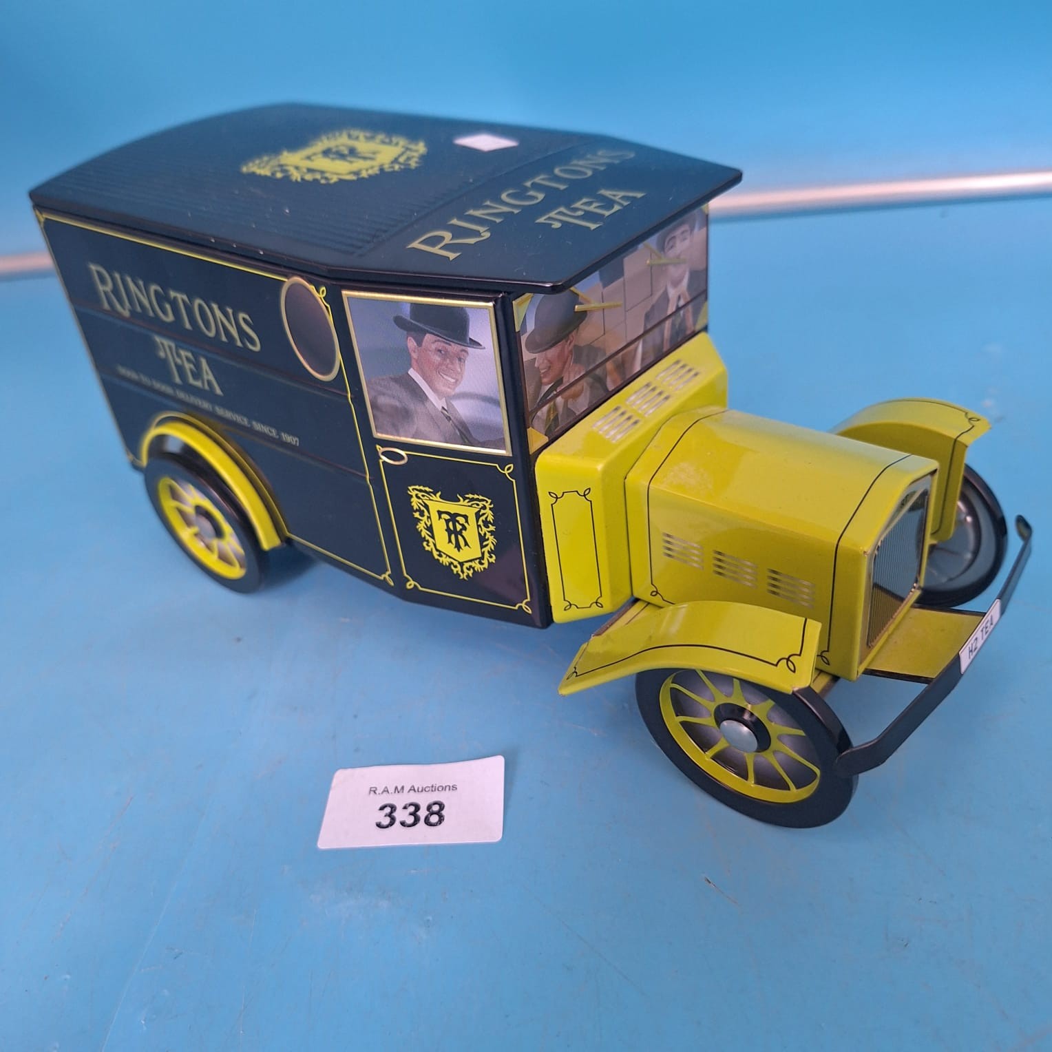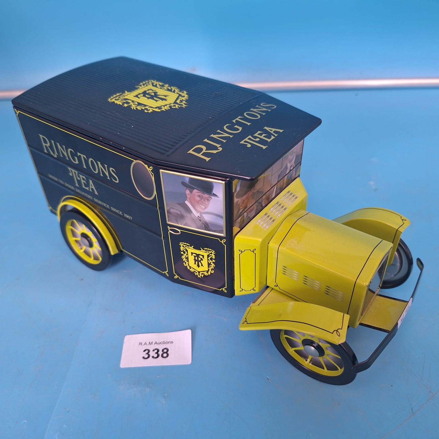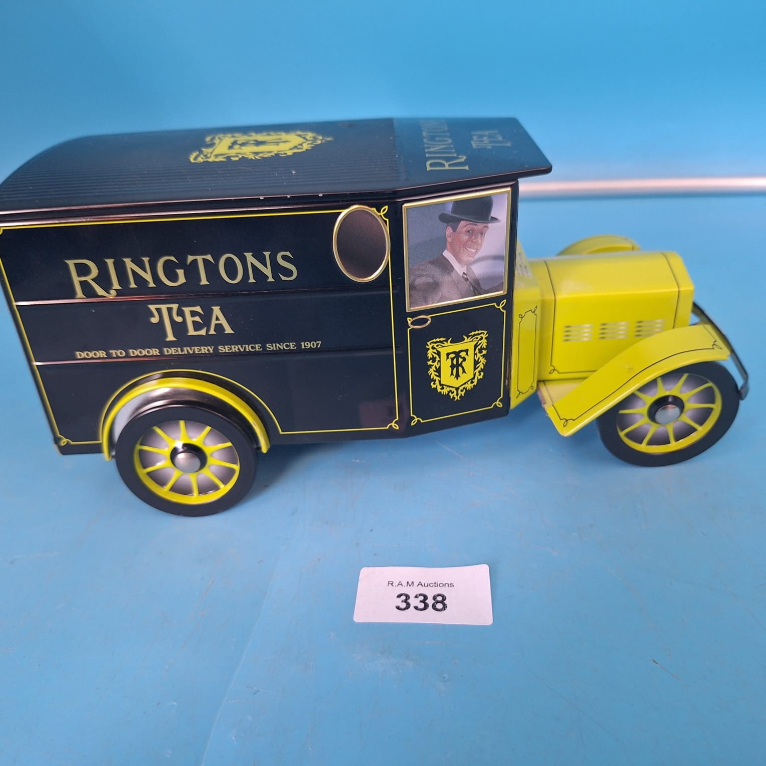 Collectible tin model of a black Ringtons Tea delivery van with yellow wheels and gold lettering.