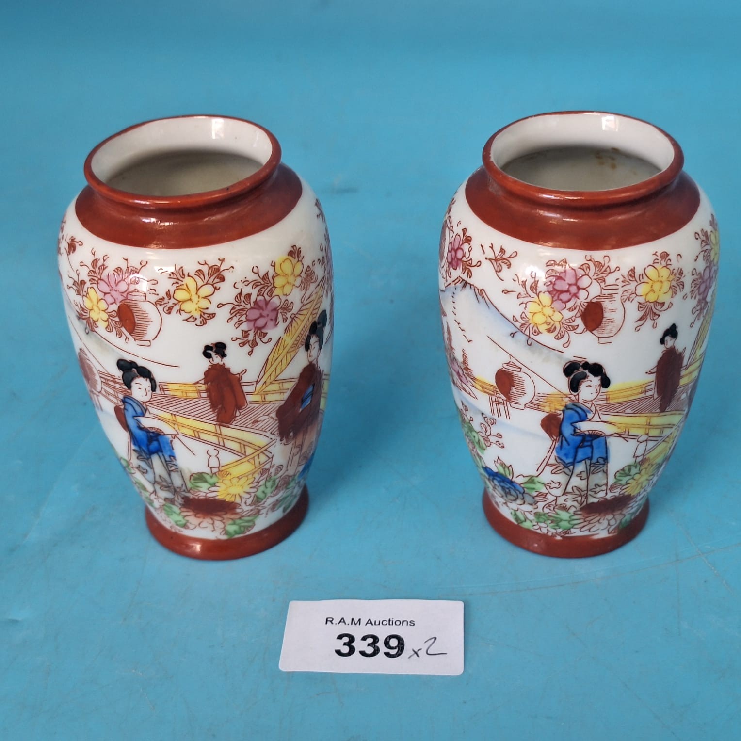 Two porcelain vases decorated with floral motifs and figures in traditional Japanese clothing.