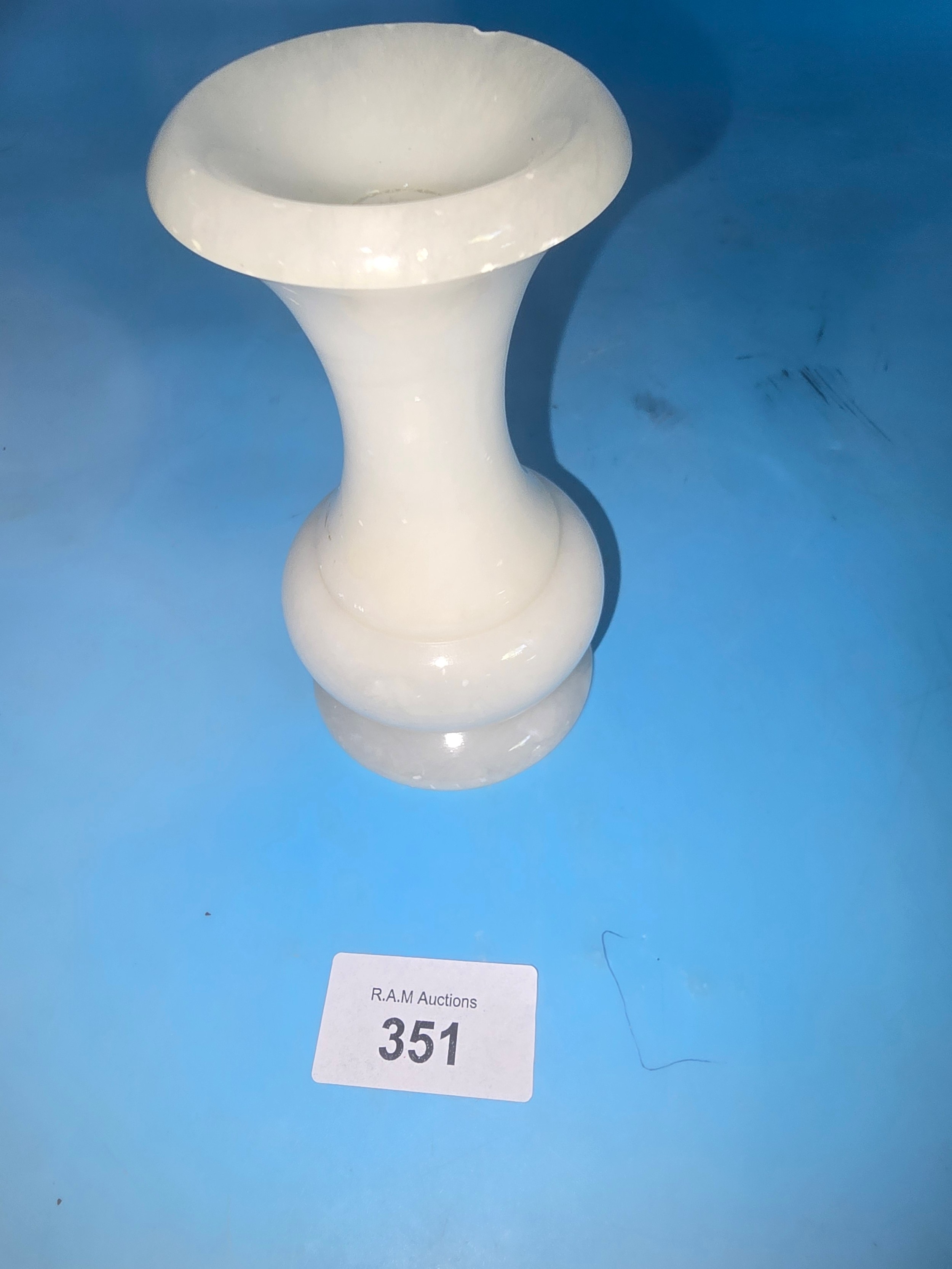 White alabaster vase with a flared rim, bulbous body, and slightly waisted shape.