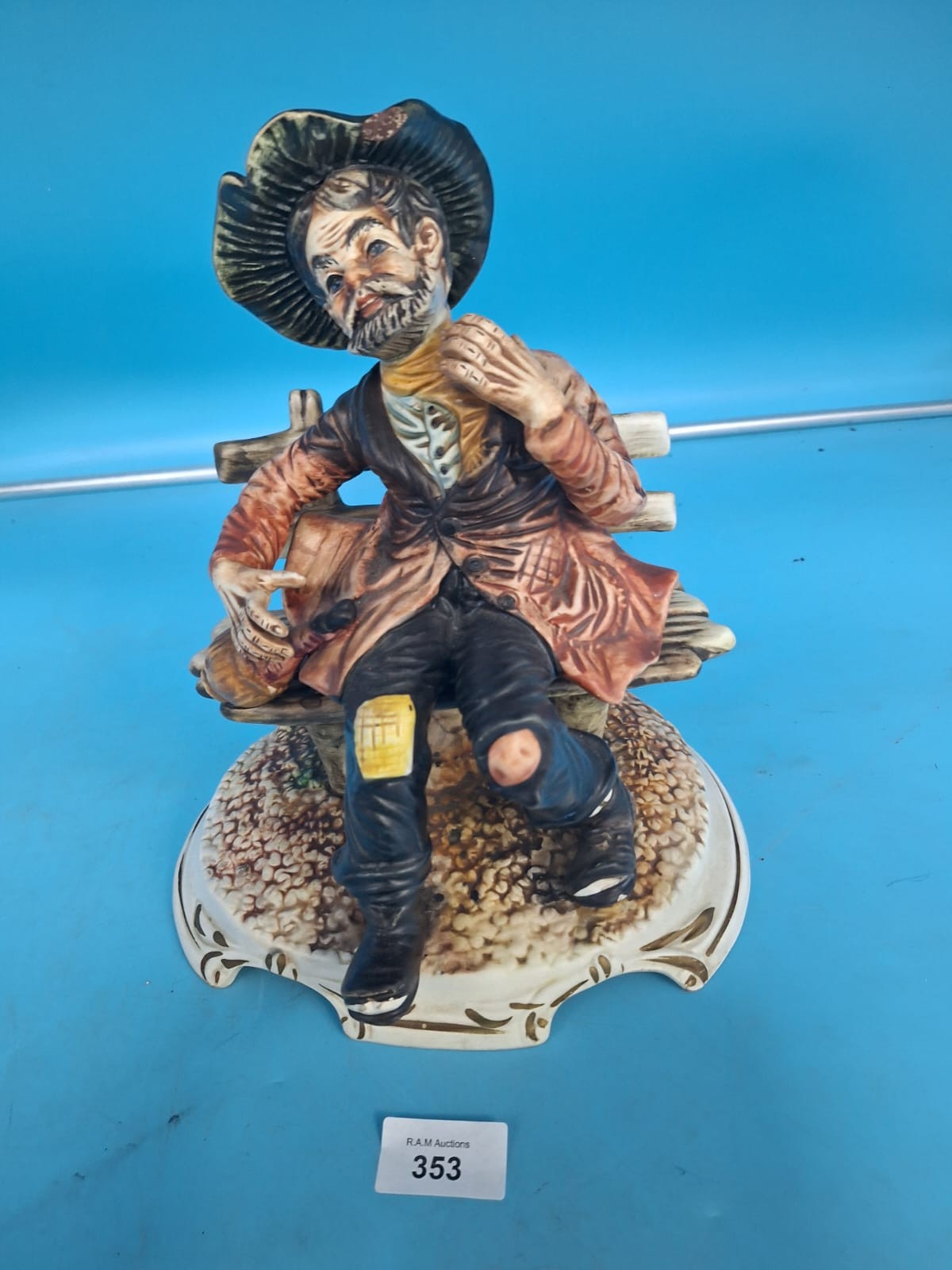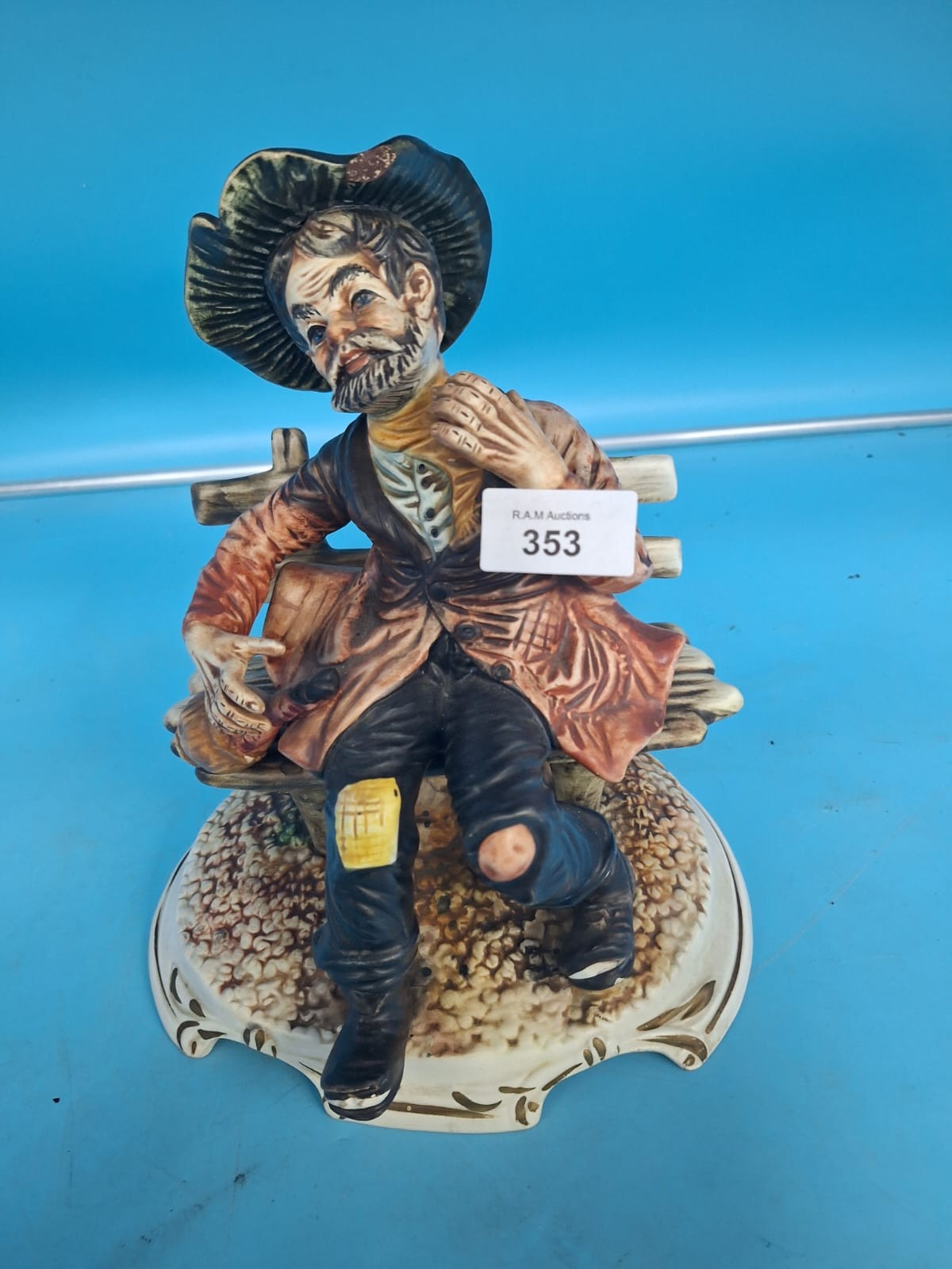 Ceramic figurine of a man in tattered clothing with a hat, seated on a bench, on a decorative base.
