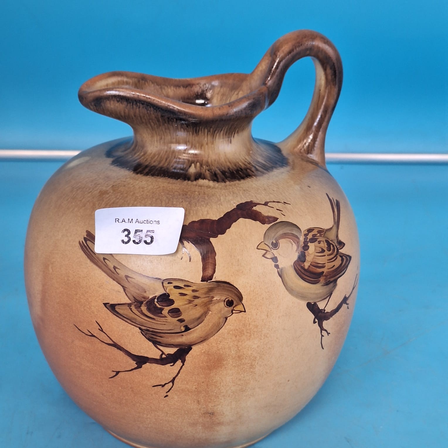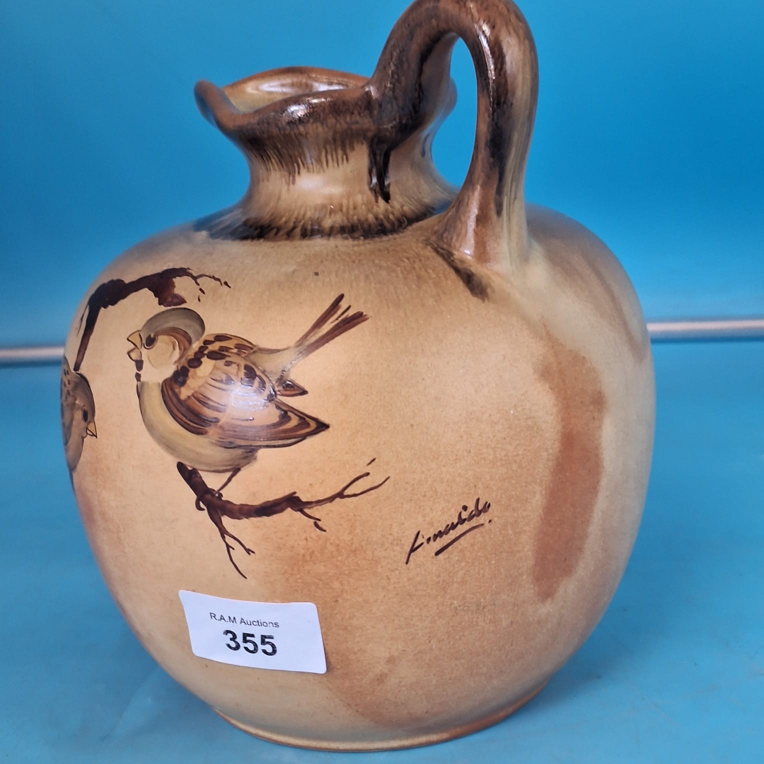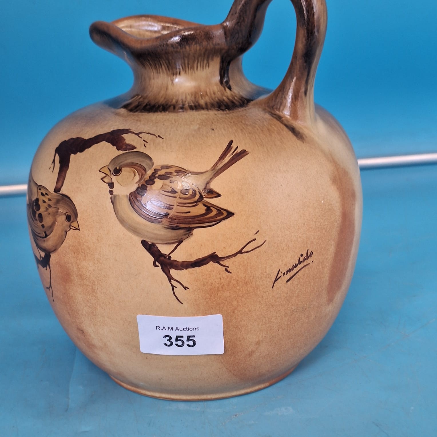 A light beige ceramic pitcher with brown bird and branch accents, signed “Amabile.”