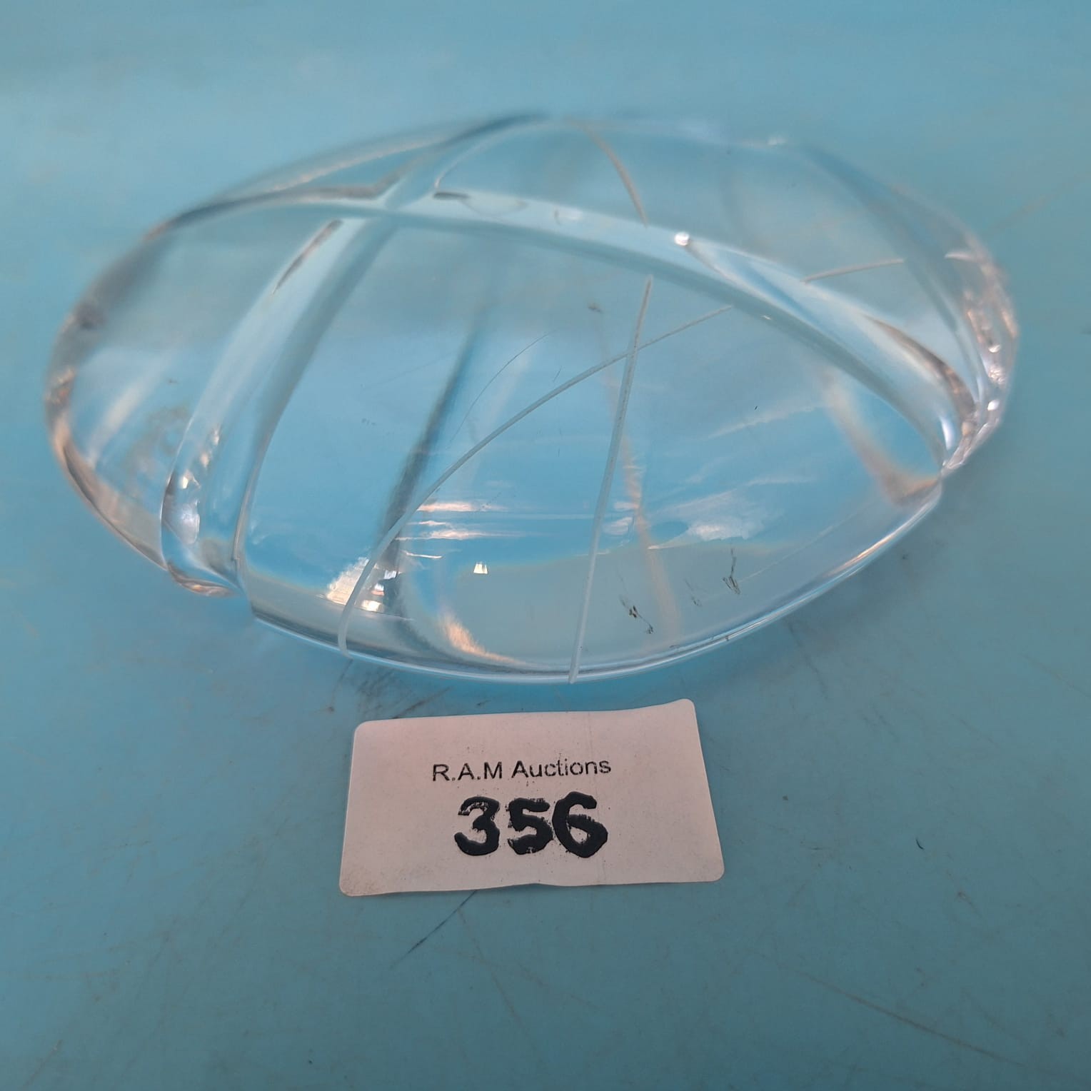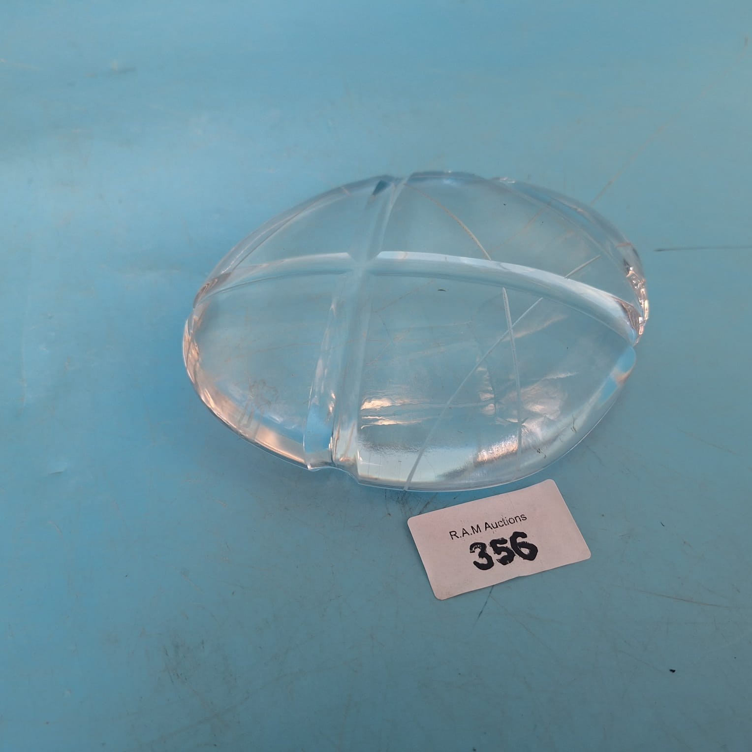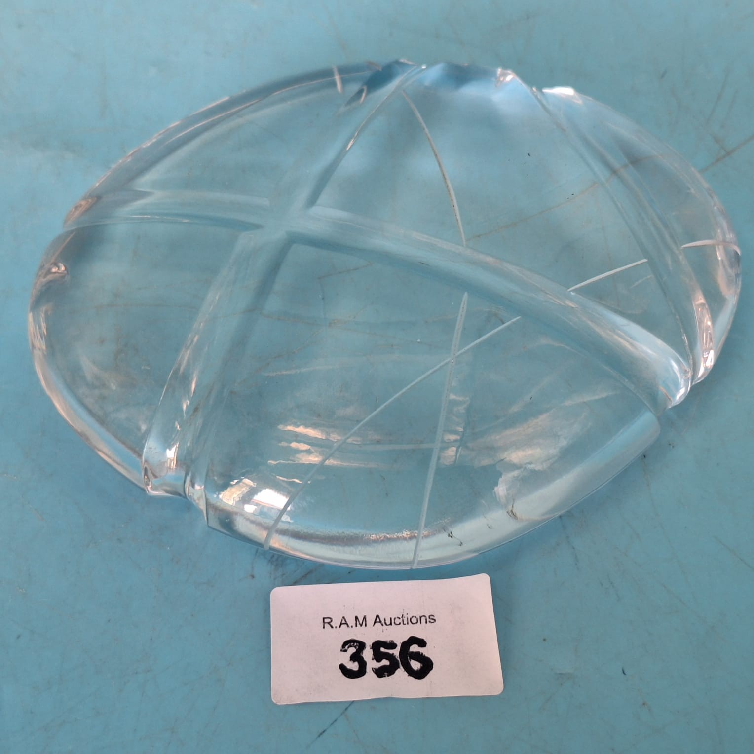 A clear glass object, oval or oblong with a convex surface, featuring an etched cross-like pattern.