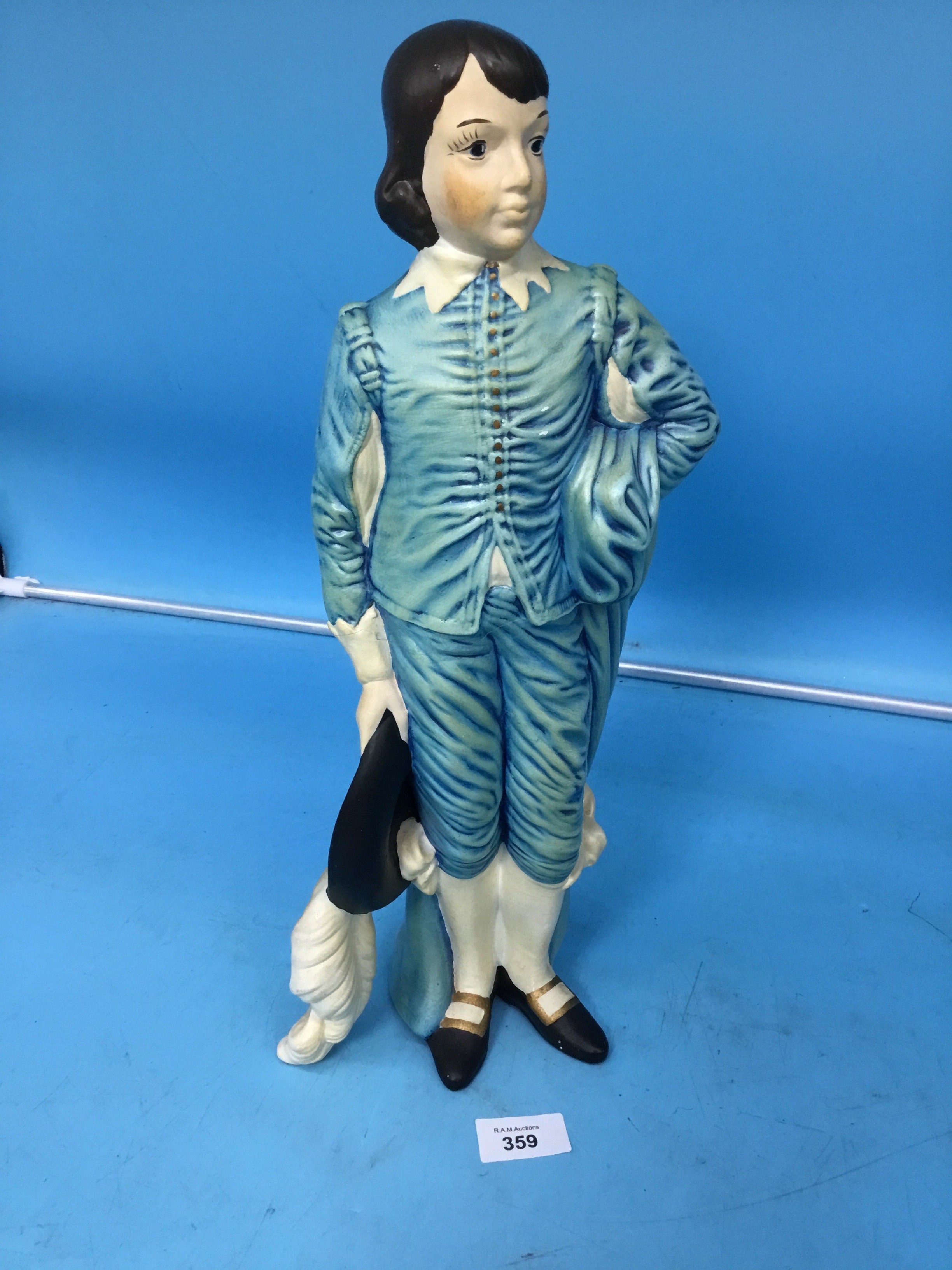 Ceramic figurine of a boy in a colonial-style suit holding a feathered hat.