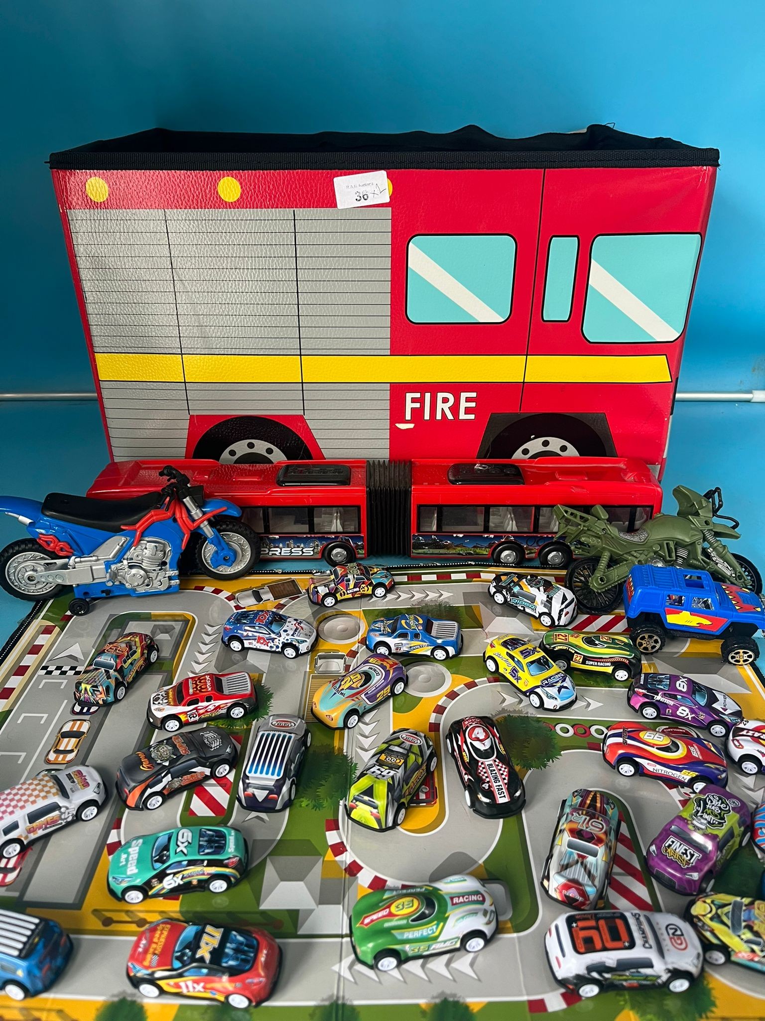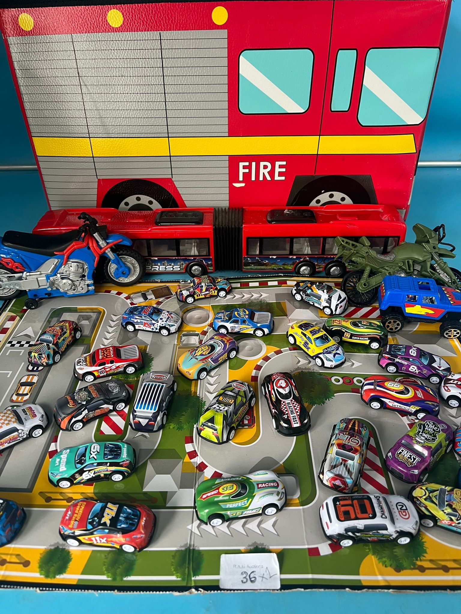 Lot of children’s toys including a firetruck storage bin, a double-decker bus, a military vehicle, a dirt bike, a blue truck, and die-cast cars on a race track playmat.