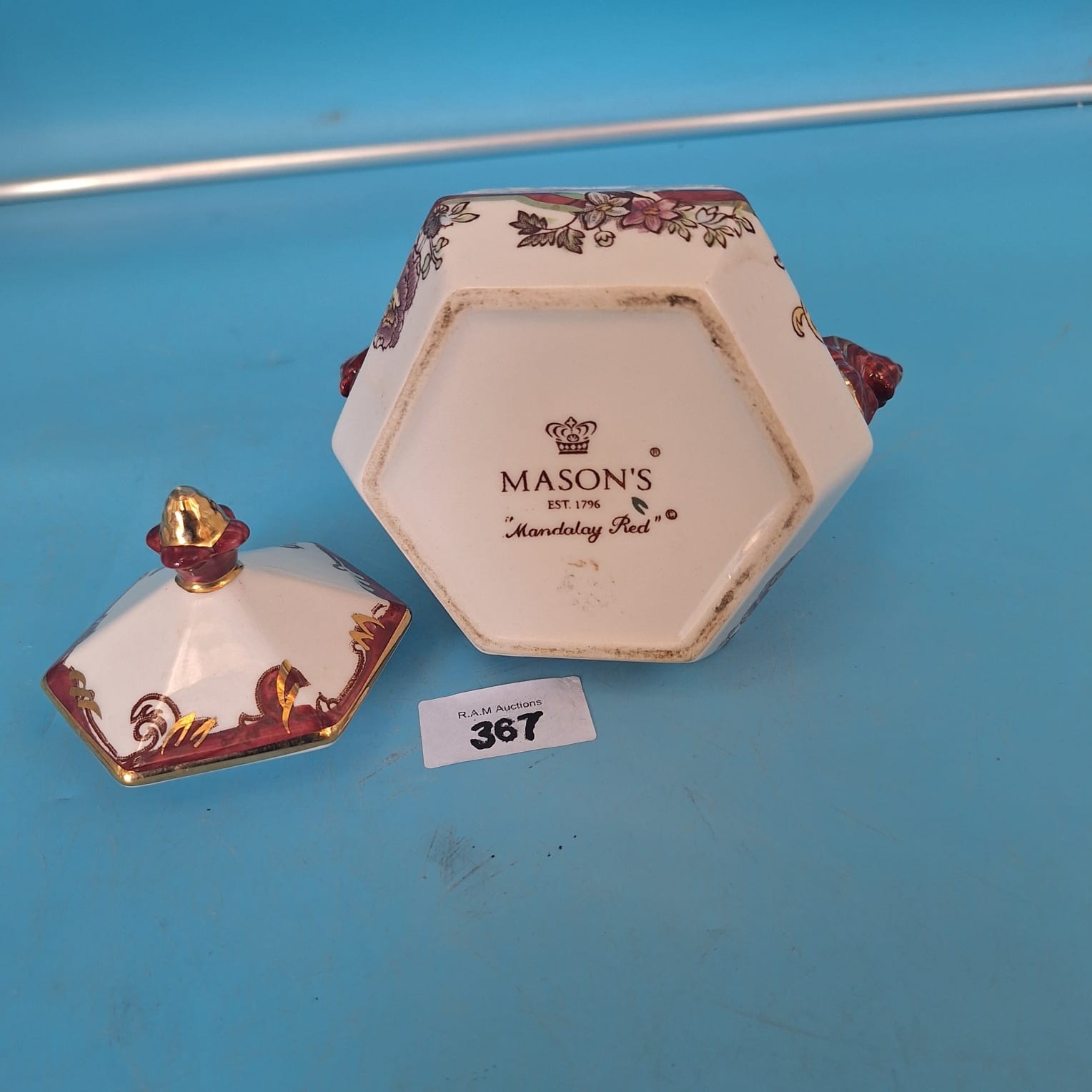 Octagonal porcelain sugar bowl and lid with lion-head handles, featuring a maroon and green floral pattern with gold trim.