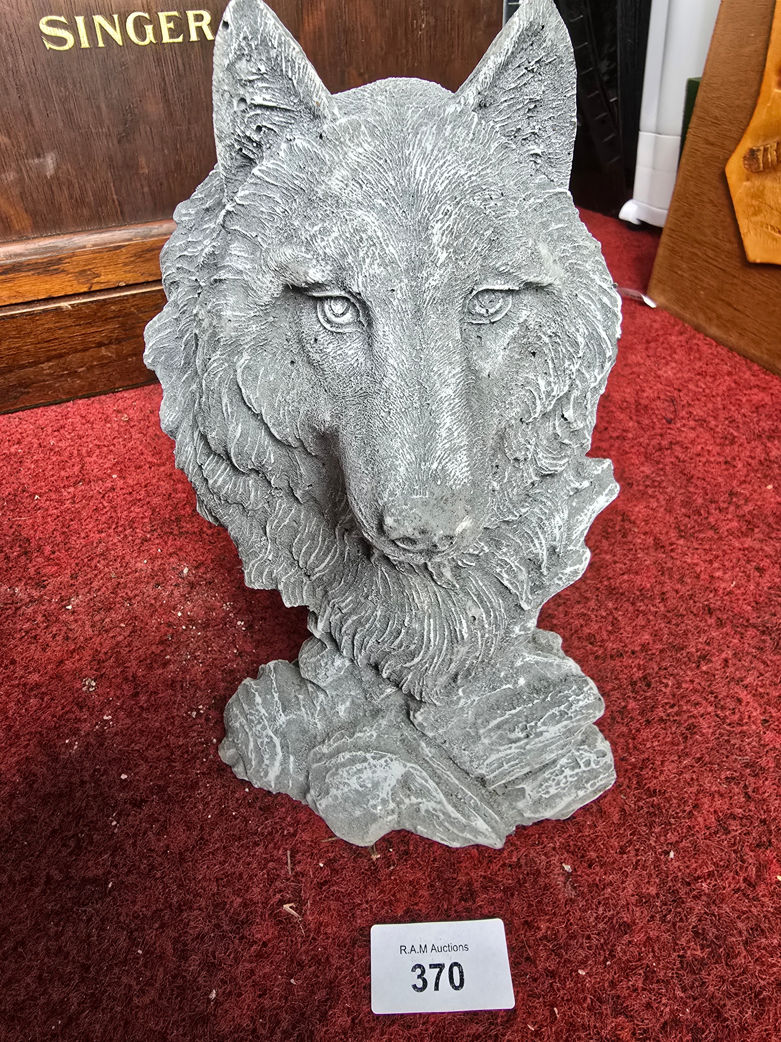 A gray stone statue depicts a wolf’s head and shoulders with textured fur and recessed dark eyes, set on a rock-like base.