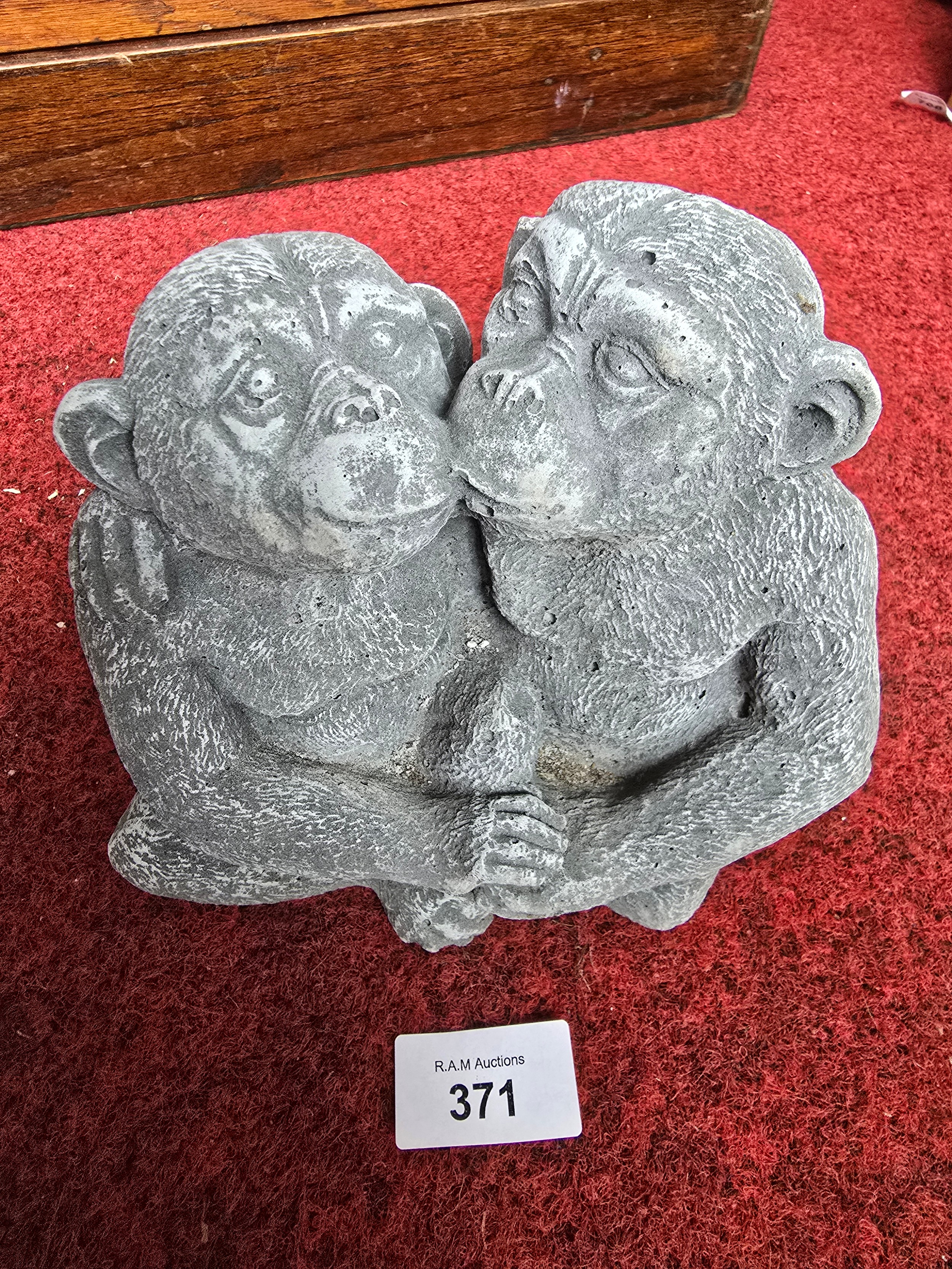 A gray stone sculpture depicts two monkeys in a seated embrace with a rough, textured surface.