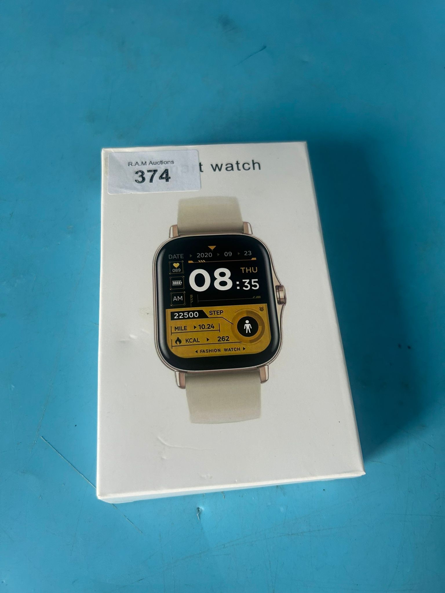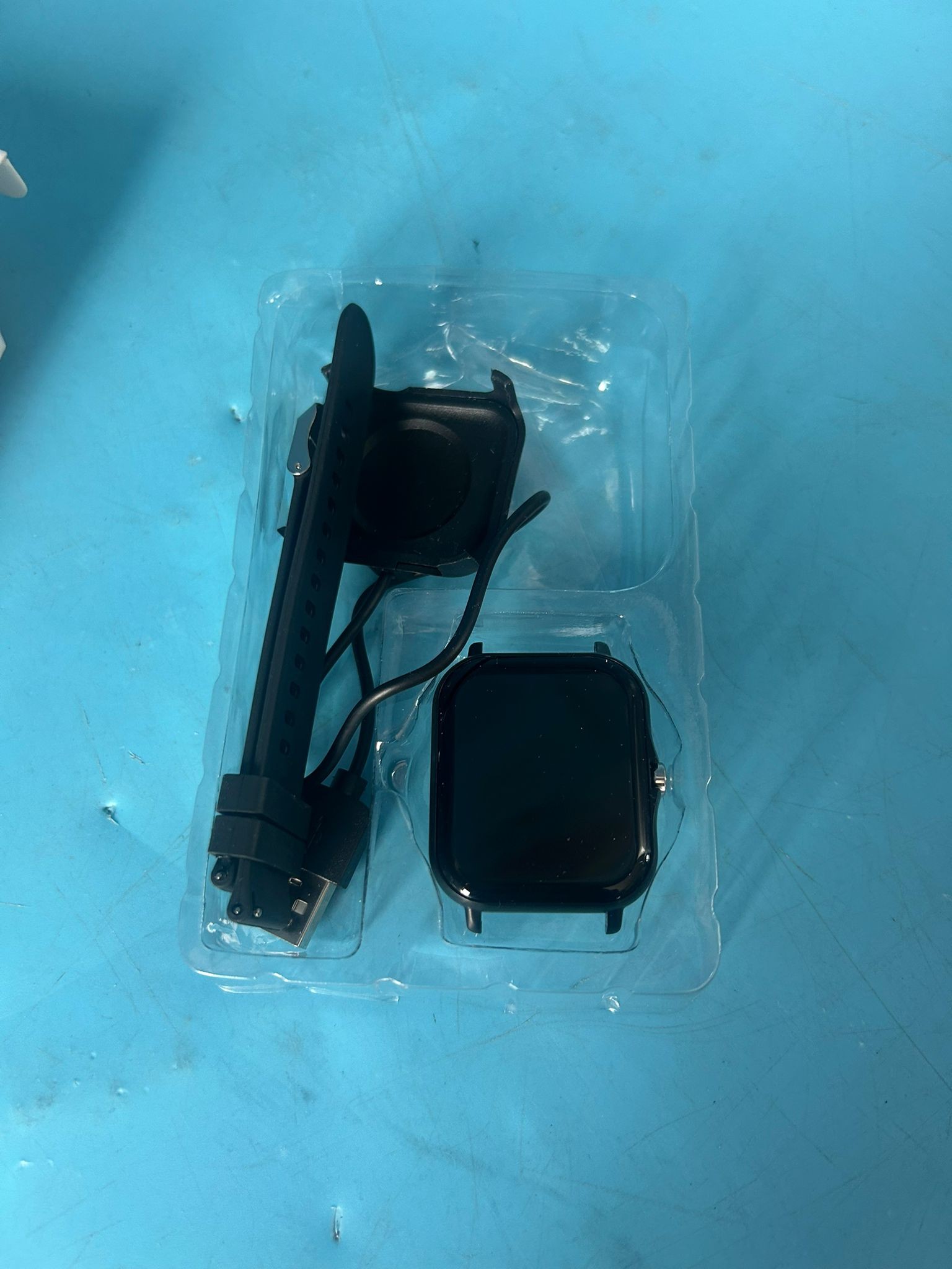 New in box smart watch with a rectangular black face and black band, includes charging cradle.