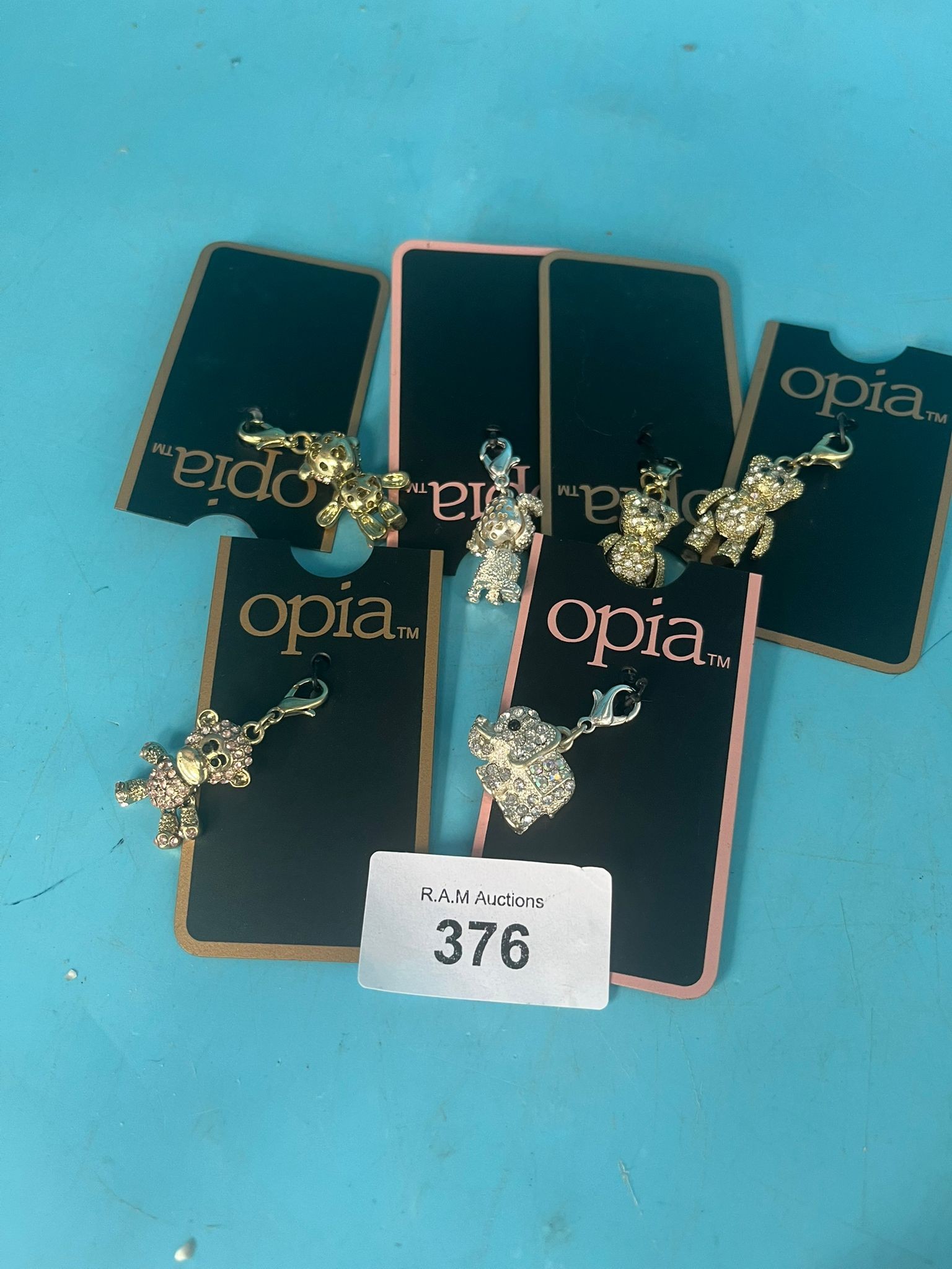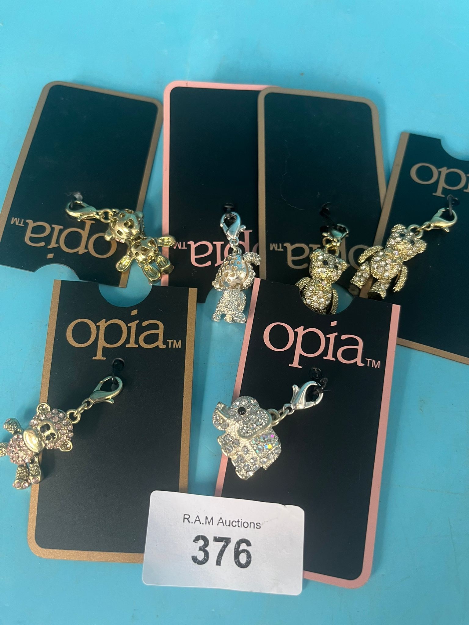 Metallic charms with rhinestone embellishments feature animal shapes and a heart design, each attached to a card.