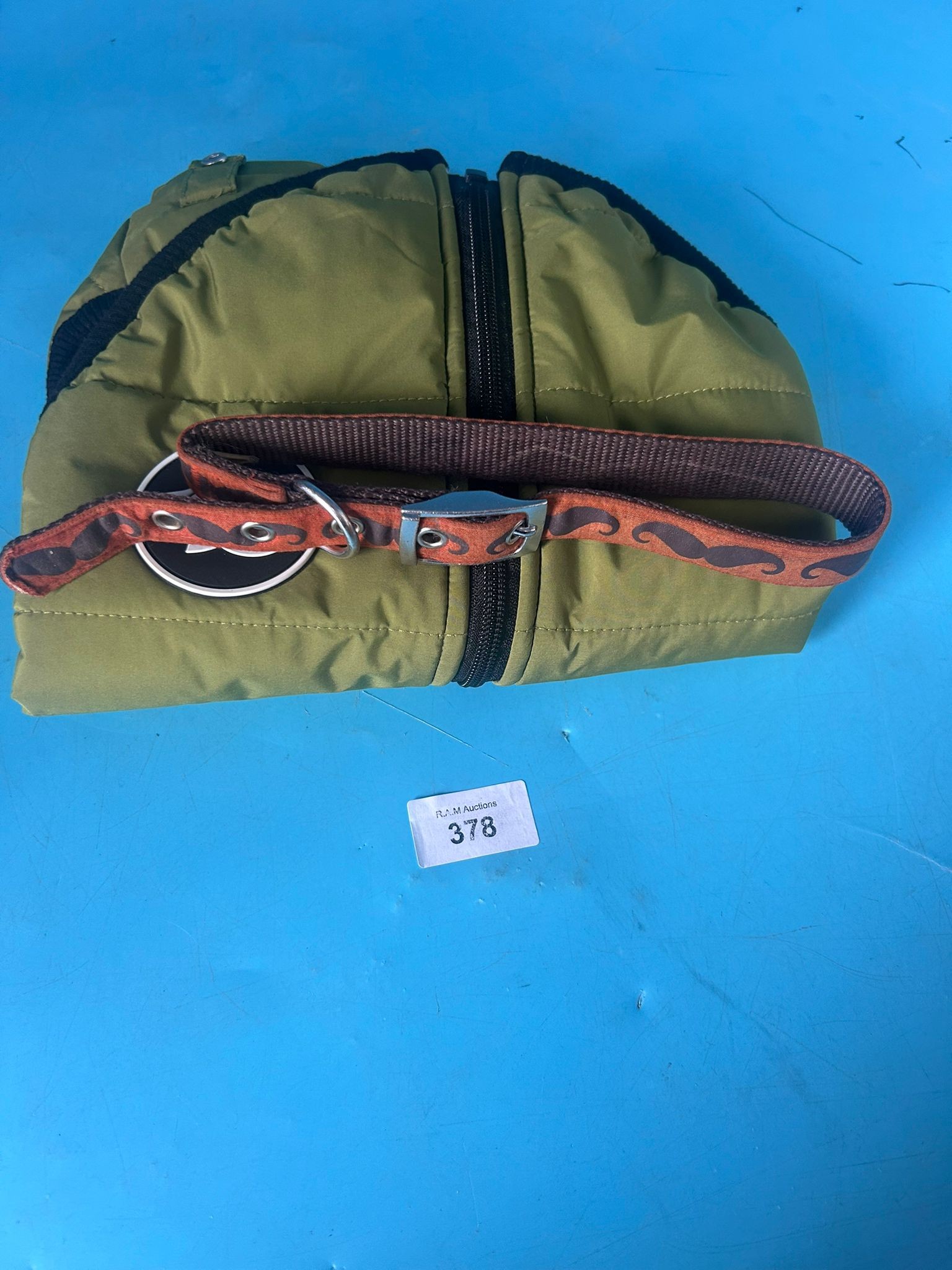Olive green quilted dog carrier with black piping, double zipper closure, and a brown dog collar with a repeating orange mustache pattern.