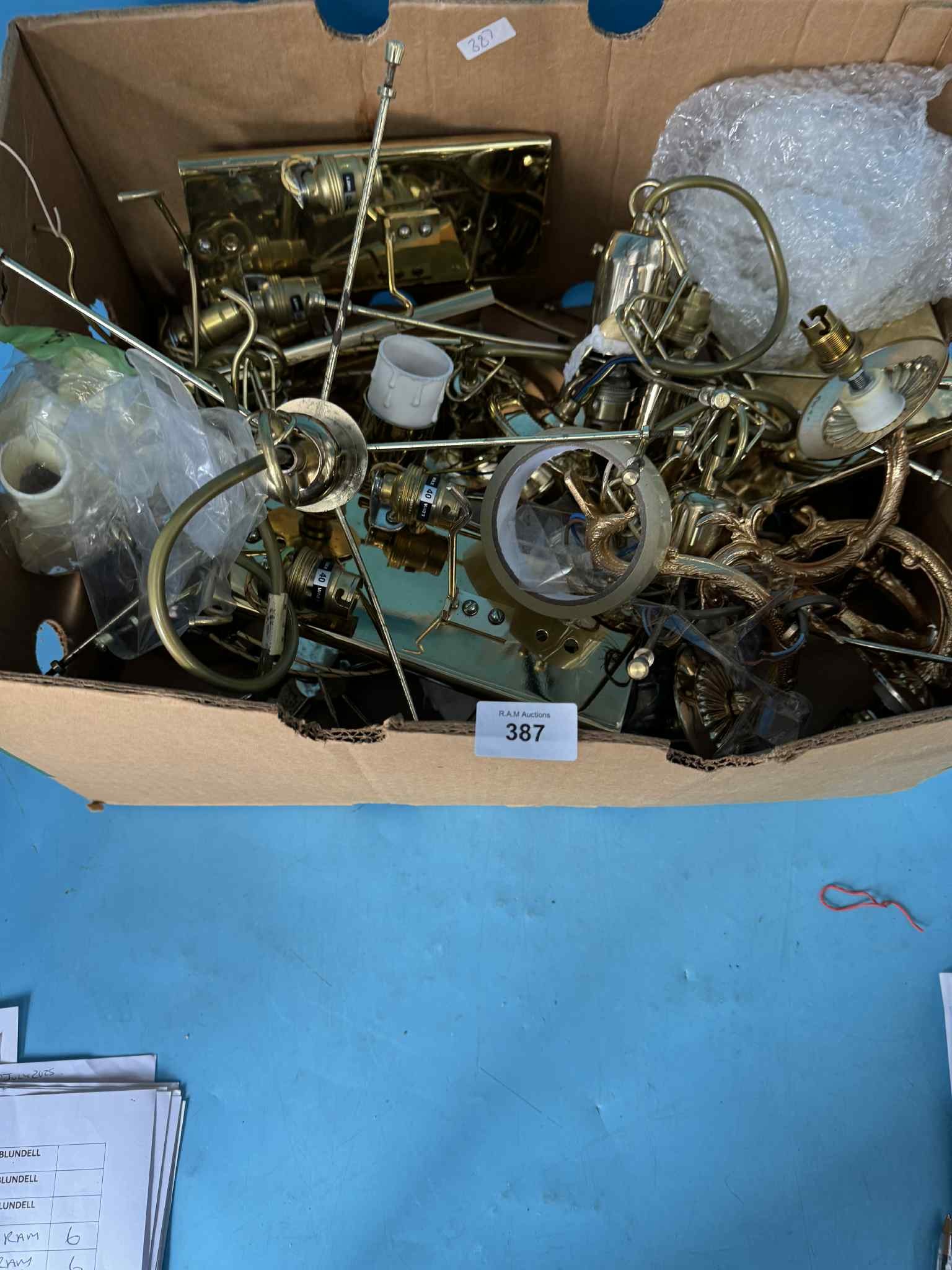 Disassembled brass-colored light fixture parts with ornate detailing.