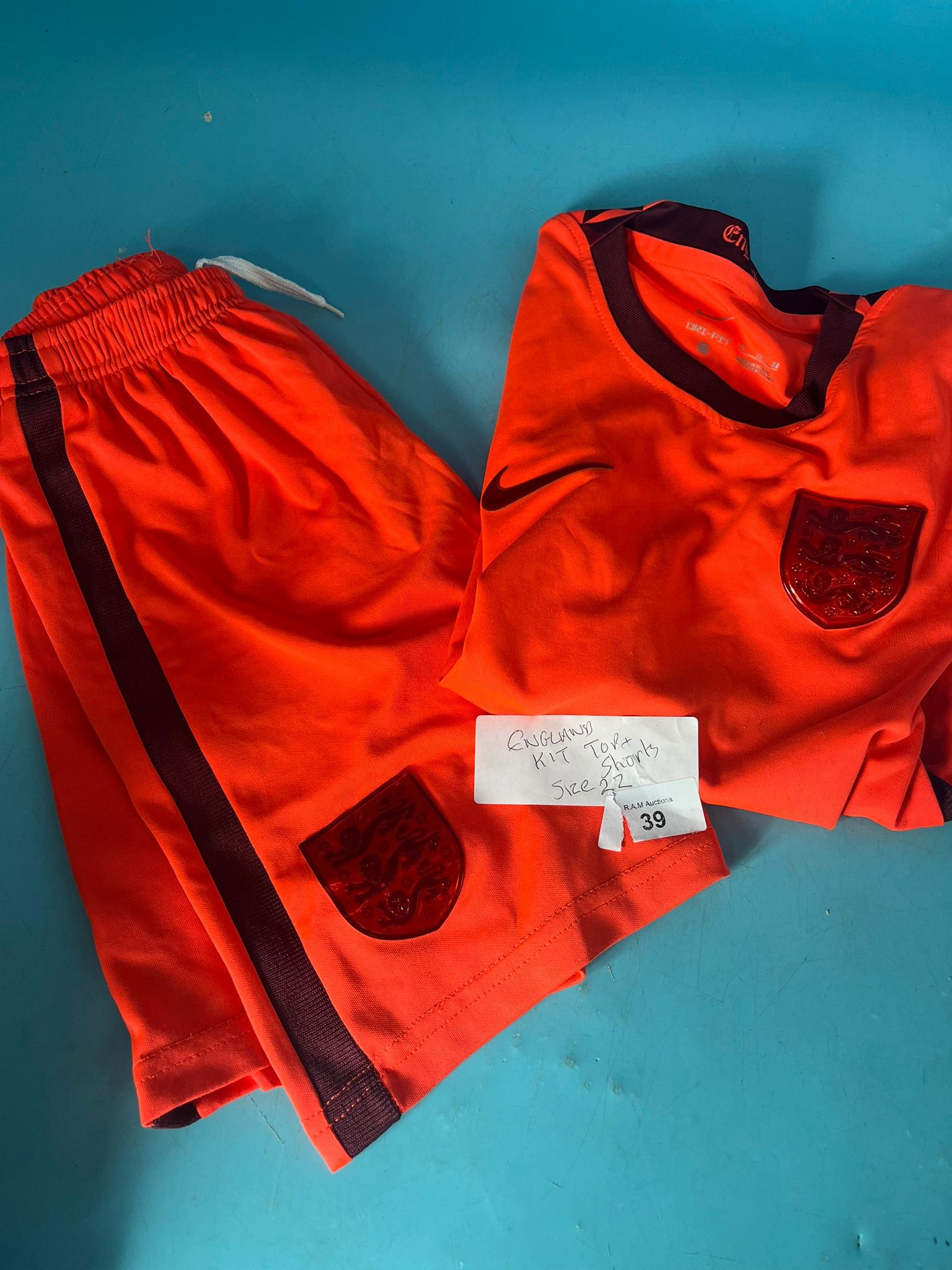 Two-piece bright orange athletic outfit with maroon accents and an England crest.