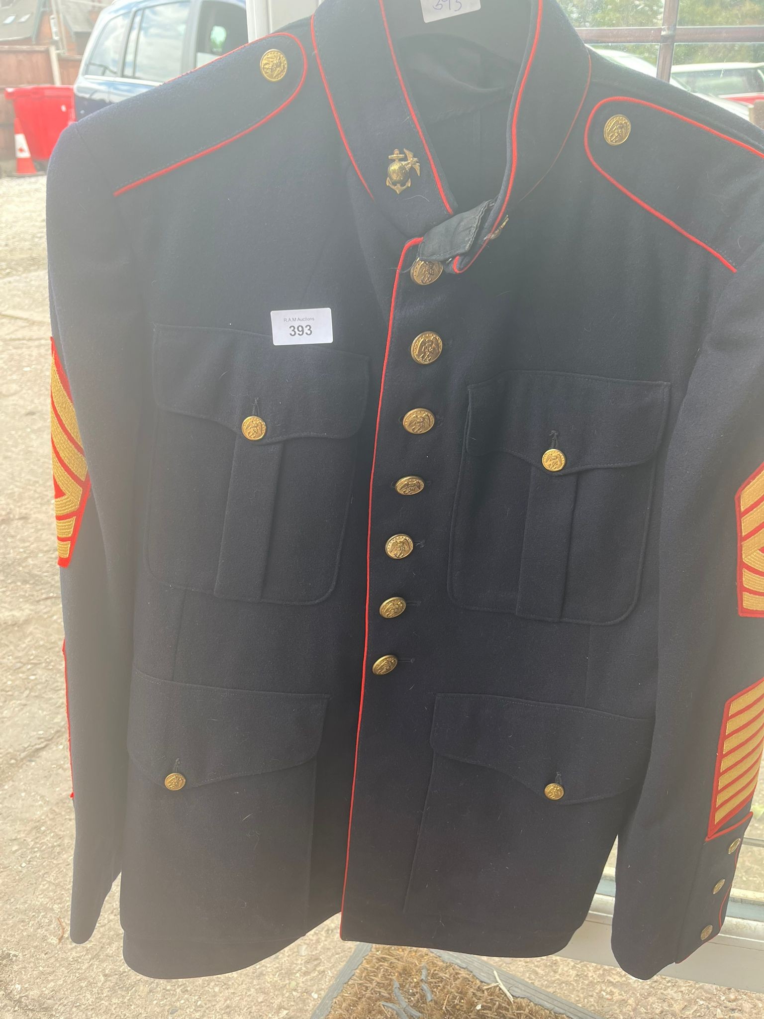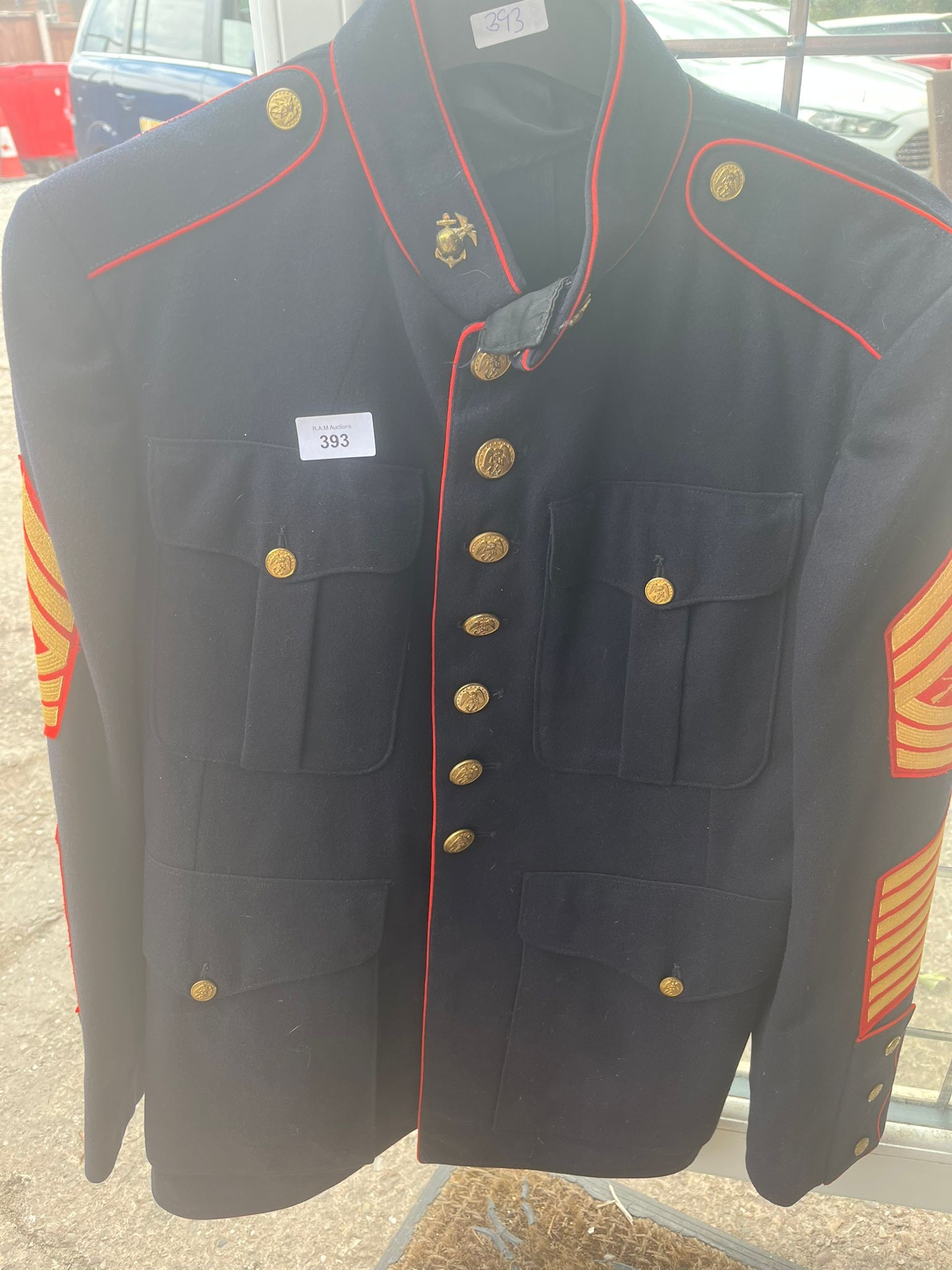 Navy blue military-style jacket with red piping, gold buttons, epaulets, and a mandarin collar.