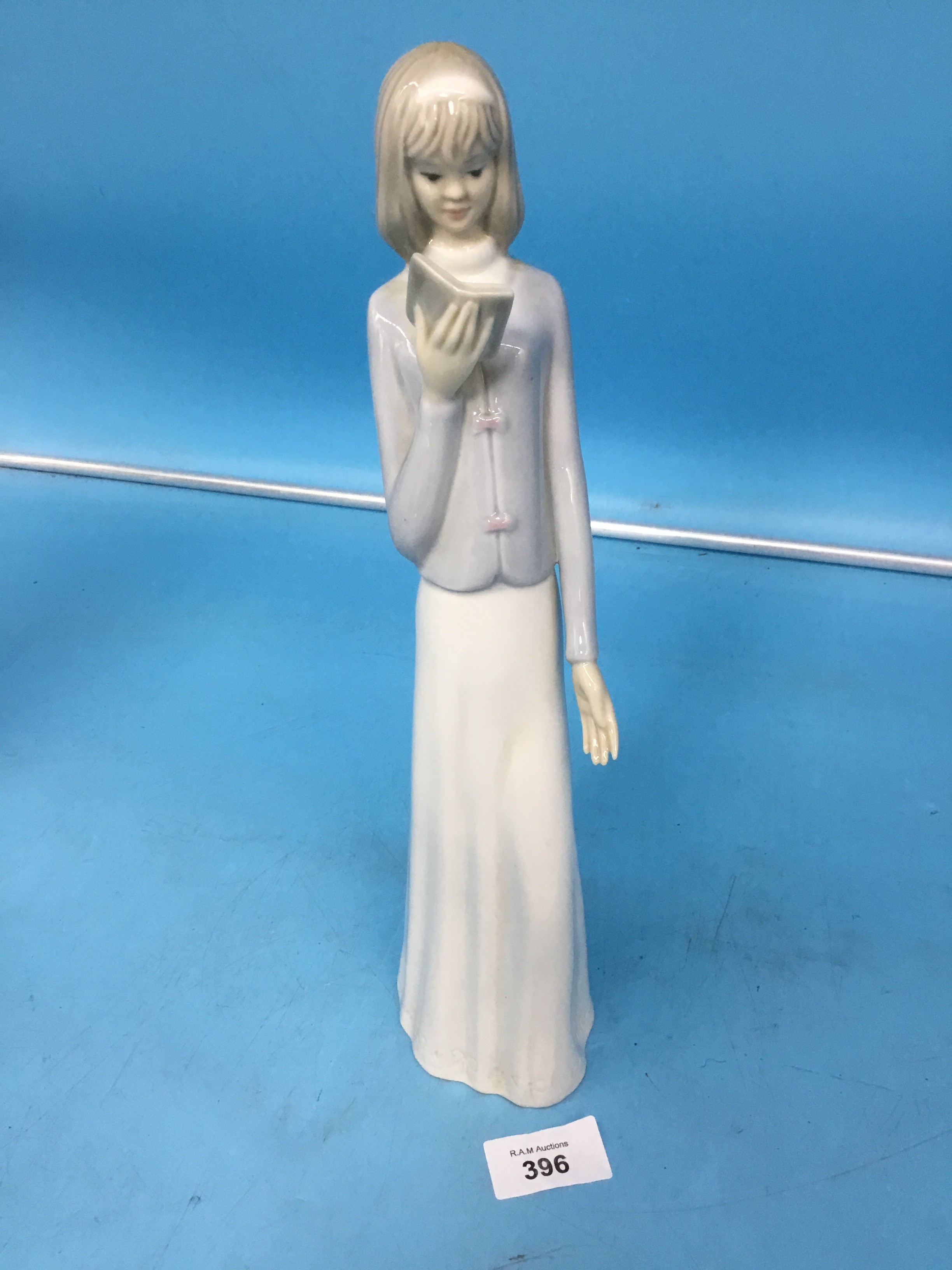 Porcelain figurine of a girl in a long dress holding a book.