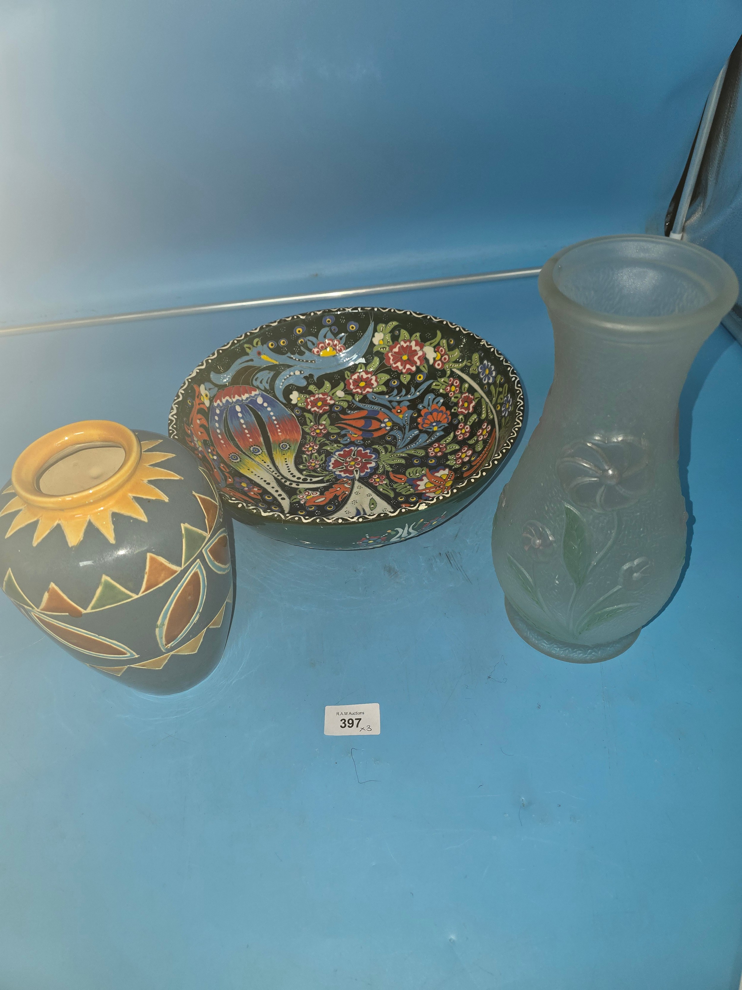 Lot of three decorative vessels including a teal and yellow geometric vase, a floral patterned bowl, and a frosted glass vase with etched floral design.