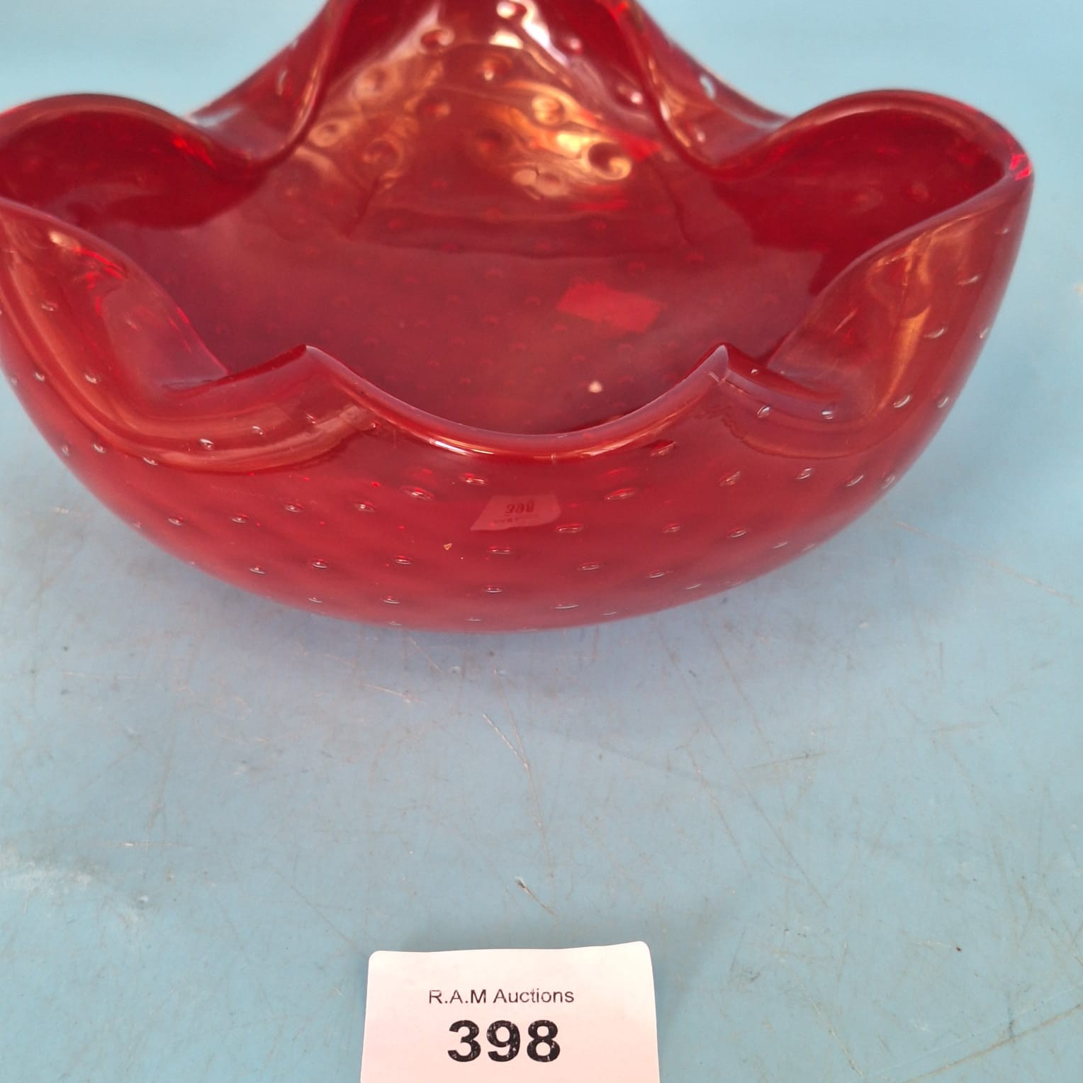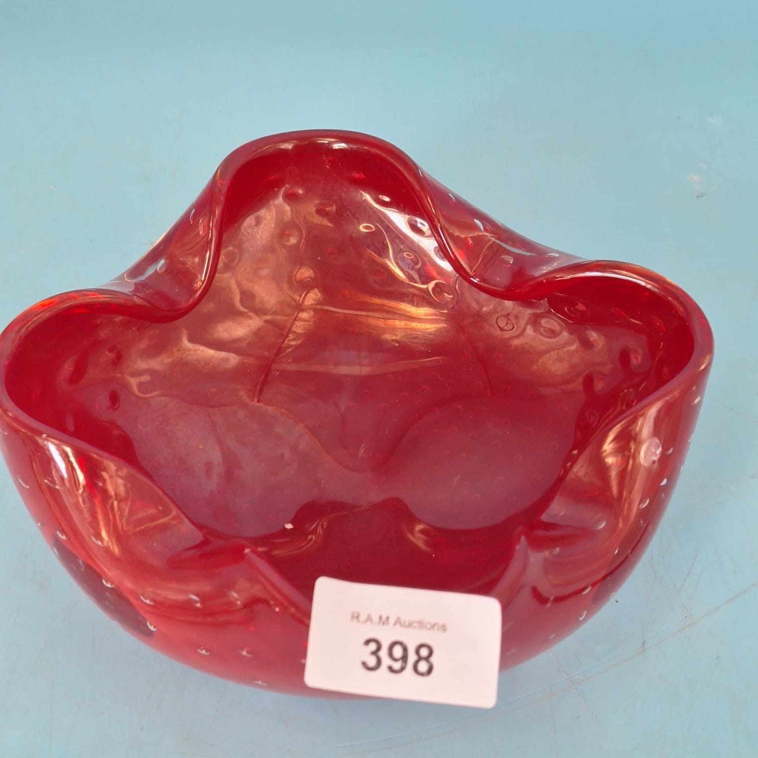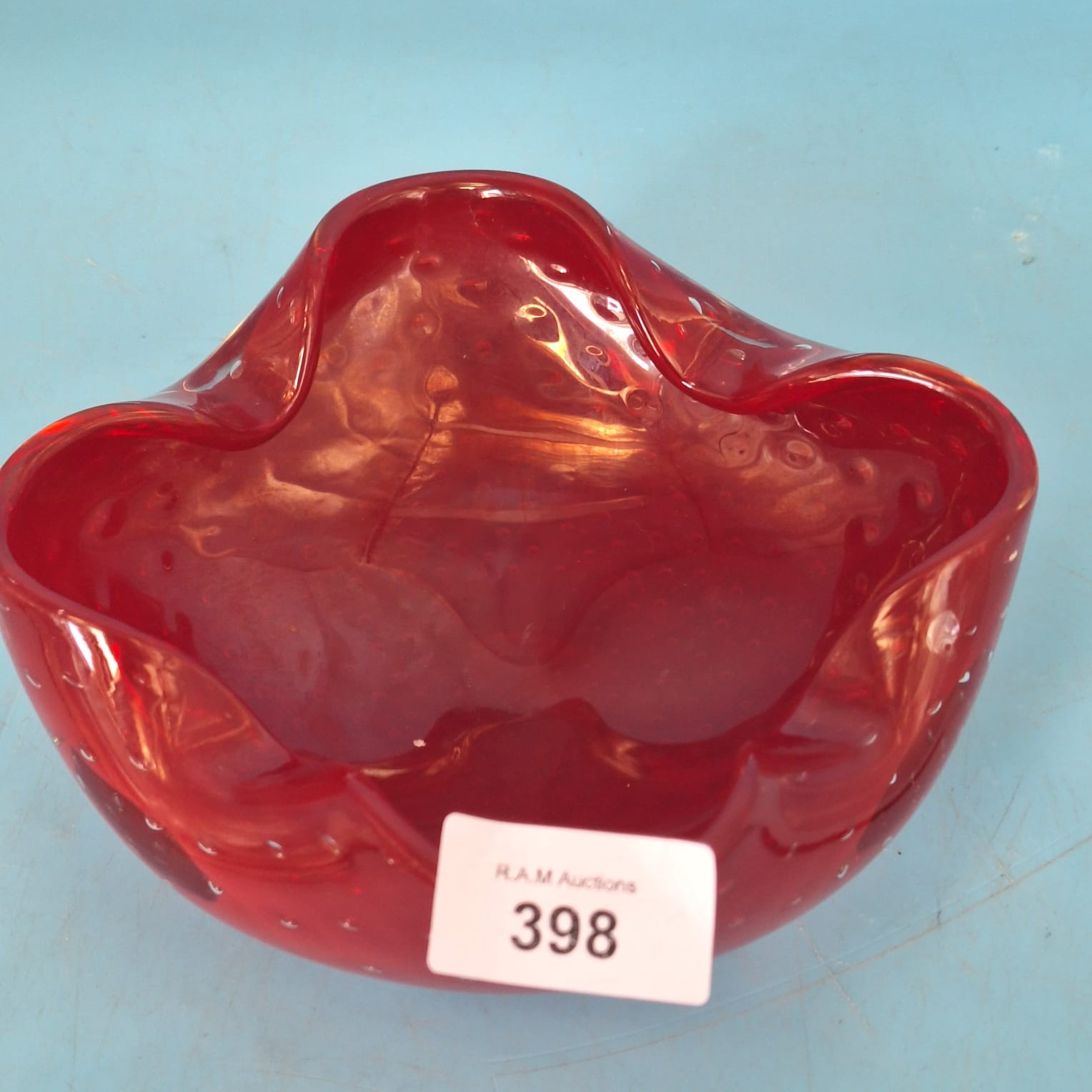 Translucent red glass bowl with a five-lobed, wavy rim and evenly distributed bubbles.