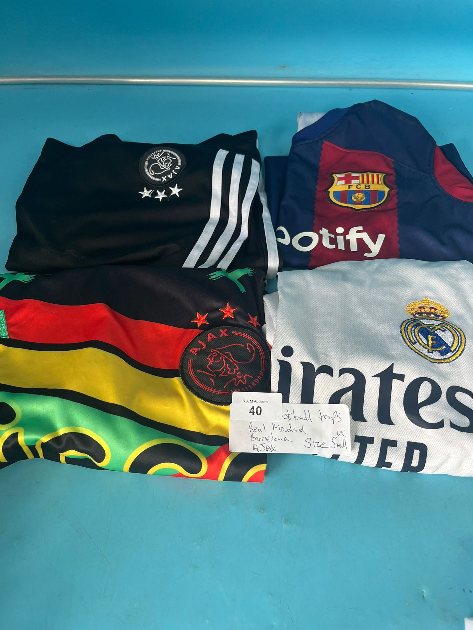 Football tops featuring Ajax, Real Madrid, and Barcelona club crests and branding.