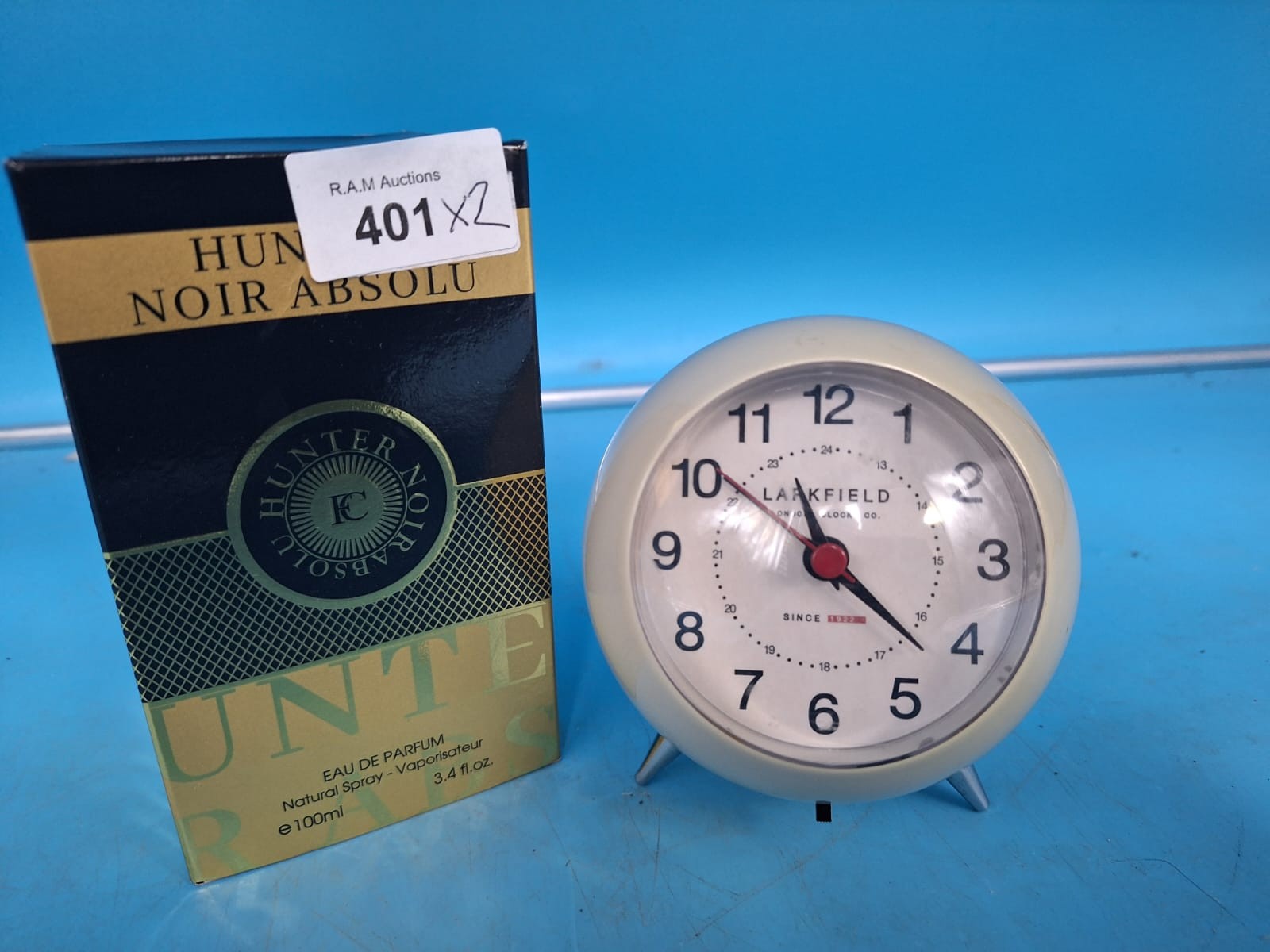 A cream-colored Laakfield alarm clock with silver-toned feet and a black perfume box for Hunter Noir Absolu Eau de Parfum.