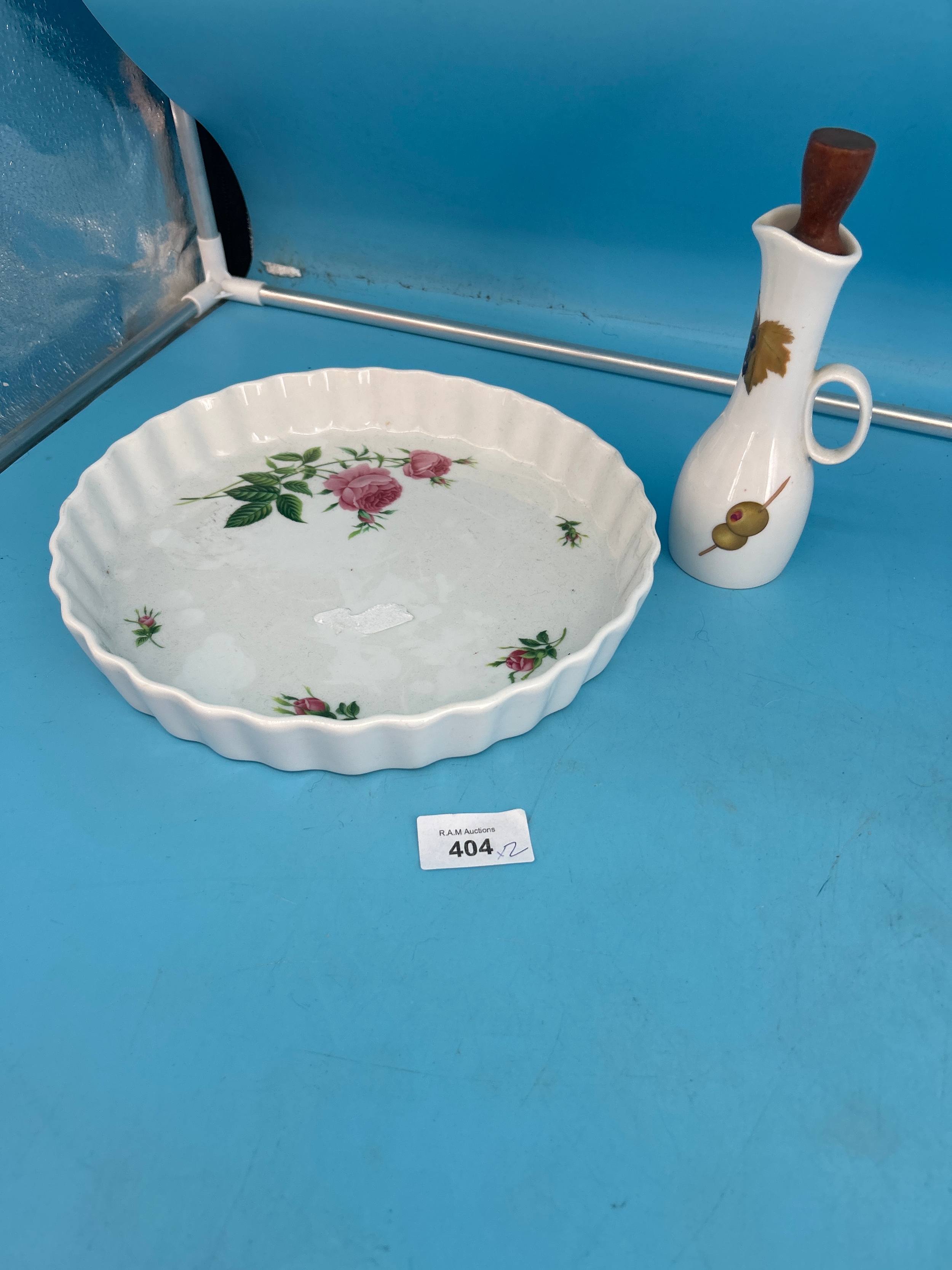 White porcelain fluted shallow dish with scalloped edge, painted pink roses and green leaves, and a narrow-necked bottle decorated with green leaves and olives, topped with a wooden stopper, featuring a crest and “Bochnim” on the base.