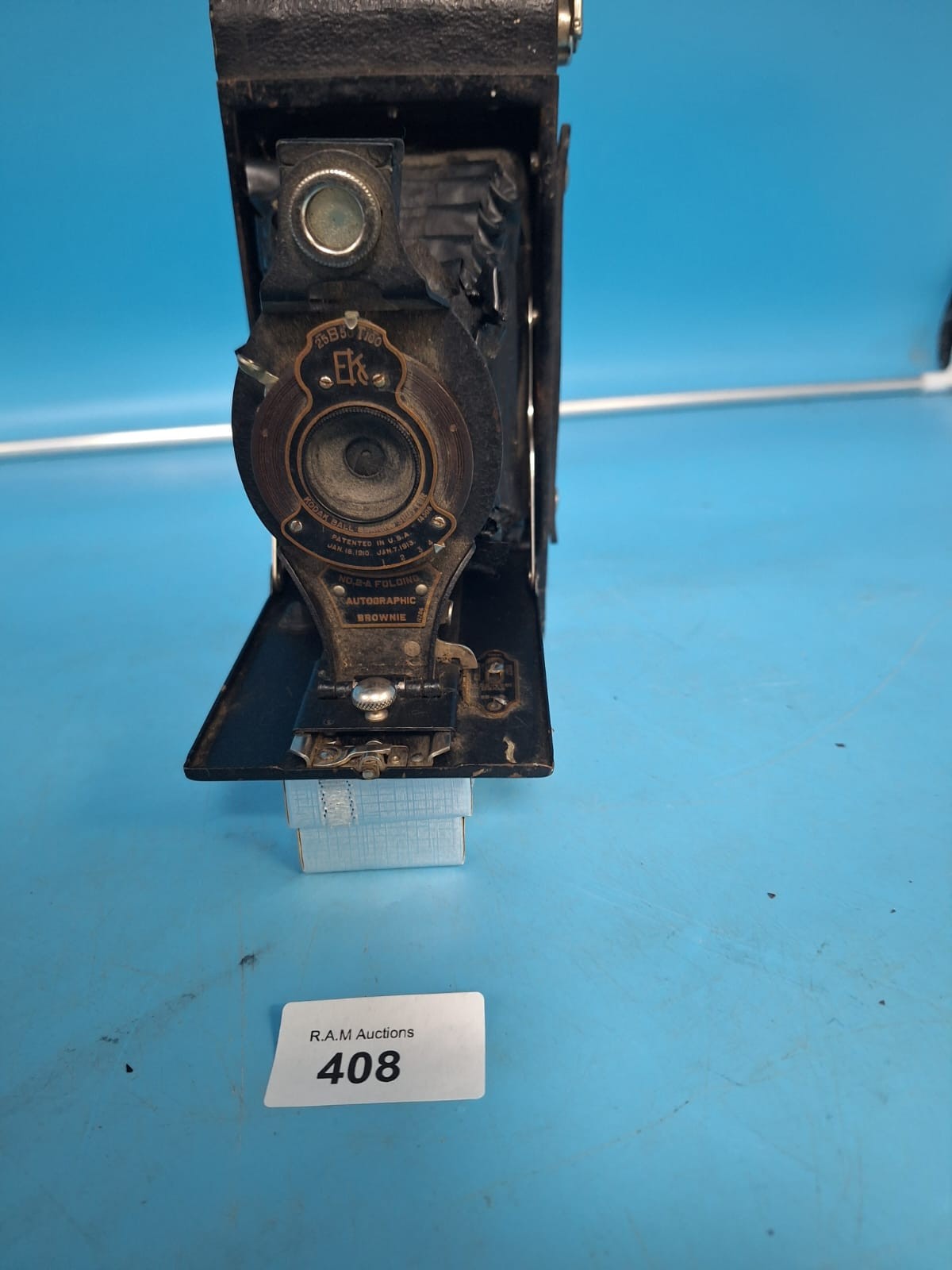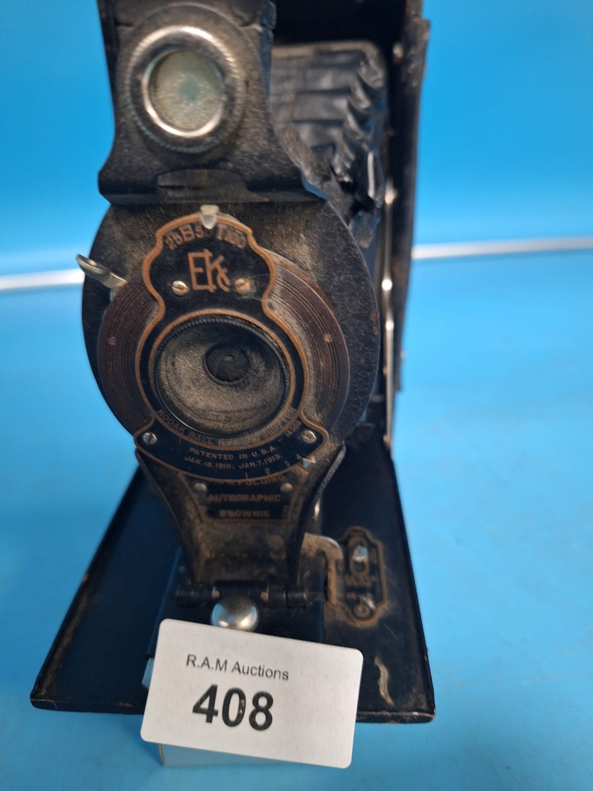 Vintage Eastman Kodak Autographic Brownie camera with metal body and bellows.