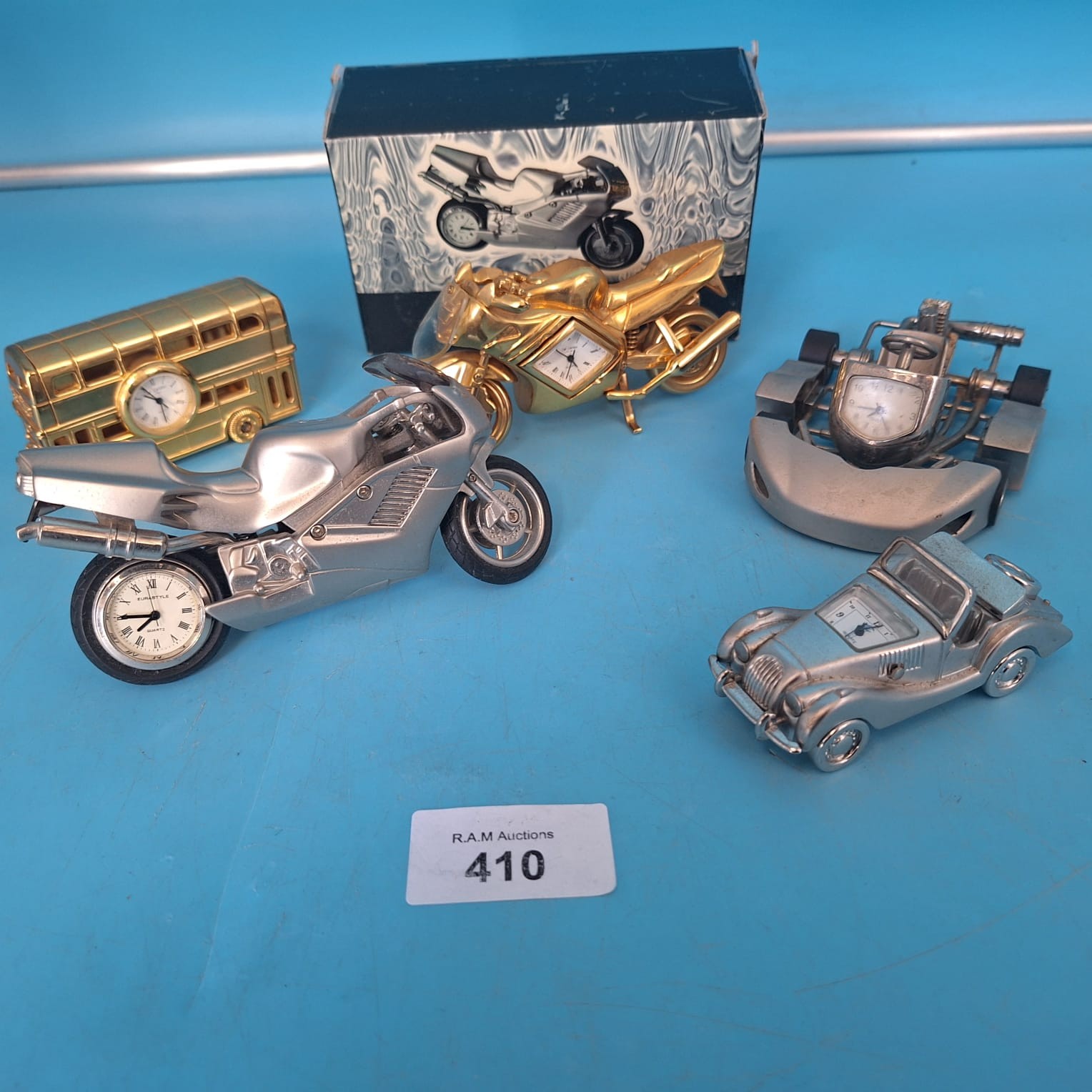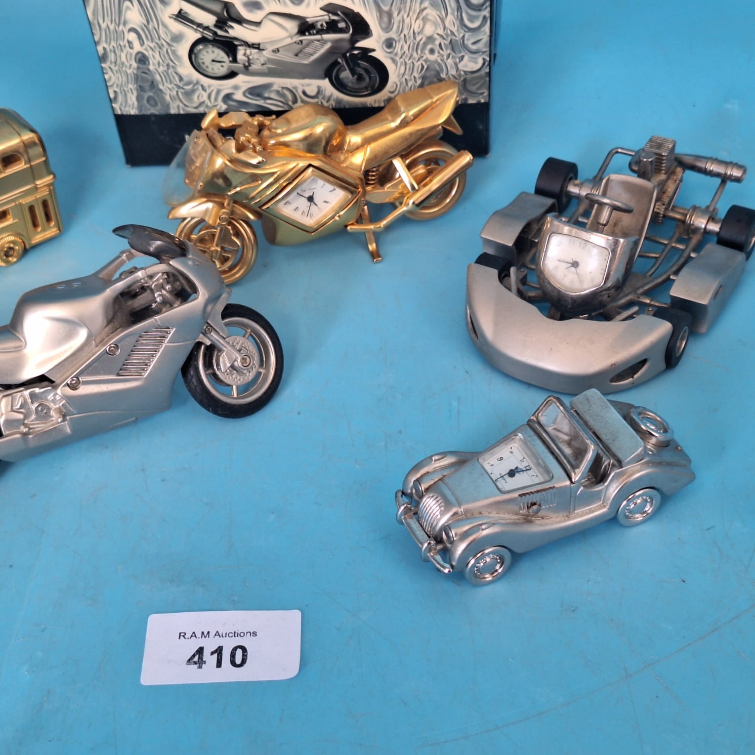 A collection of miniature metal vehicle clocks including a double-decker bus, motorcycles, a go-kart, and a classic car.