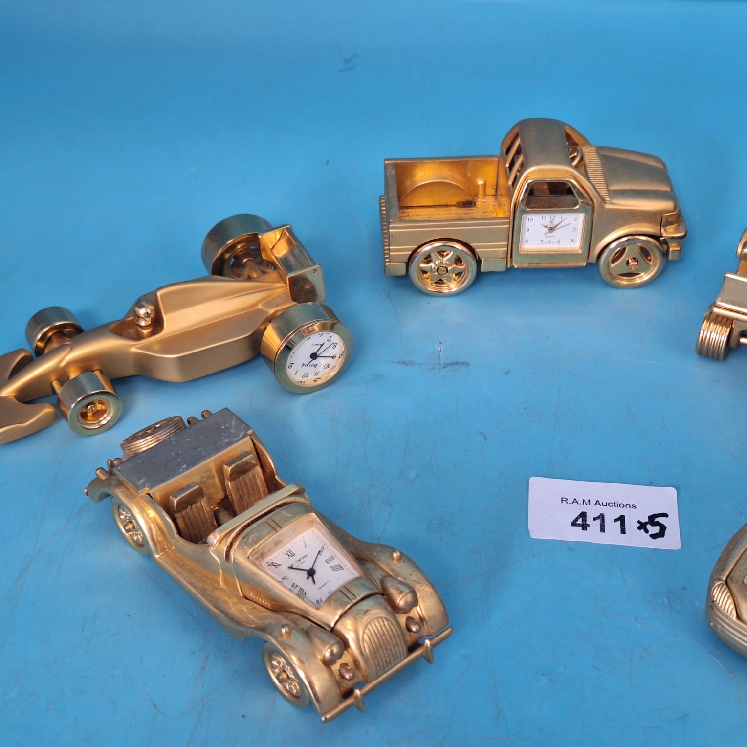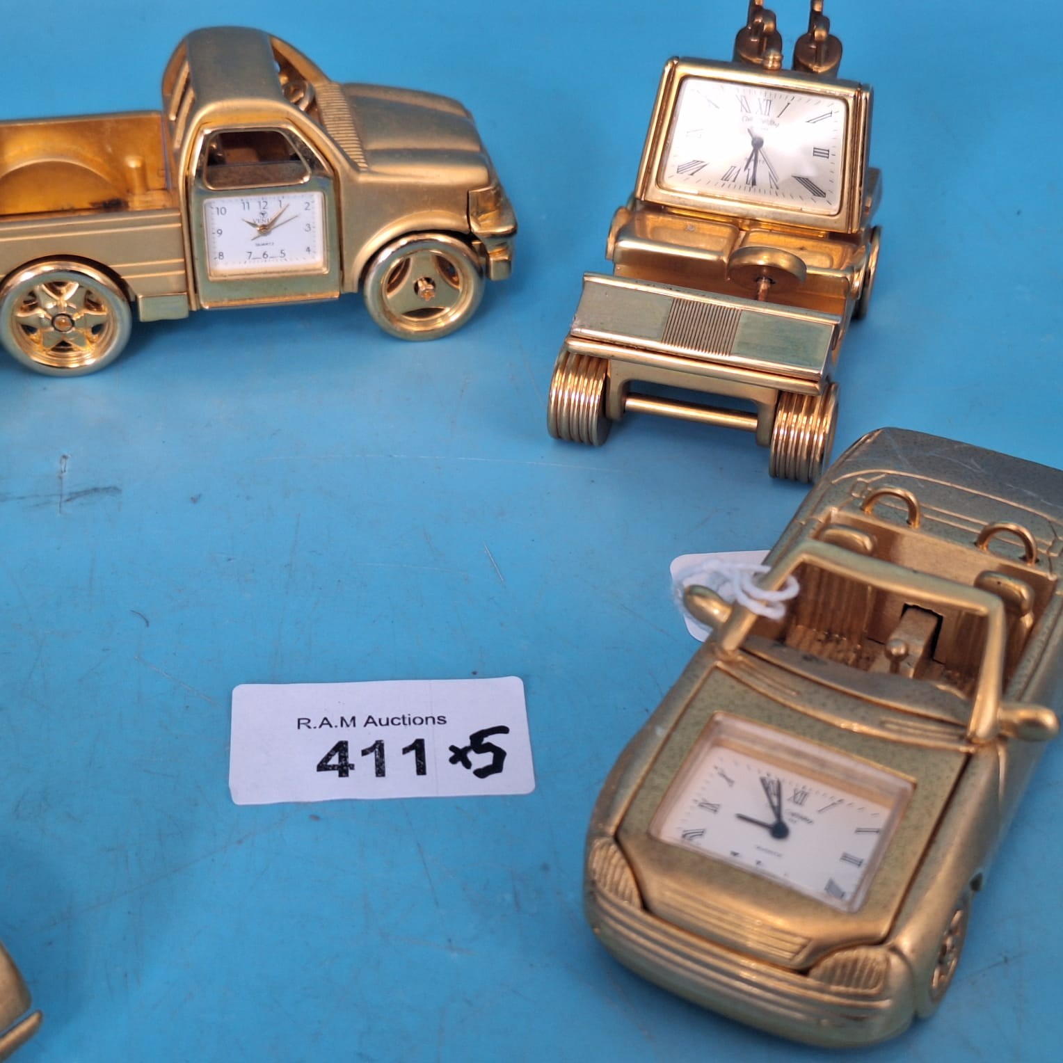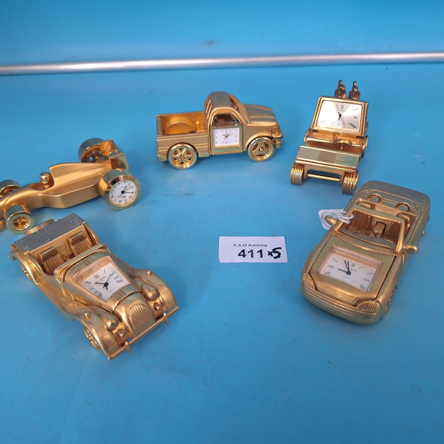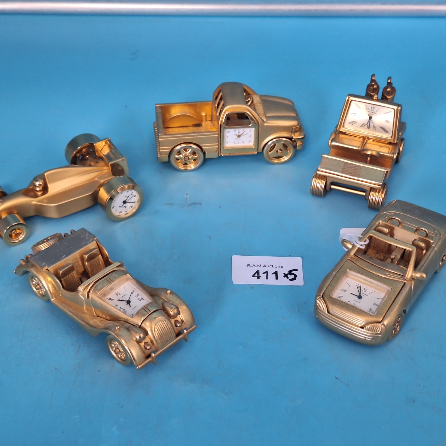 Lot of five gold-colored metal vehicles, each with a Roman numeral clock face.