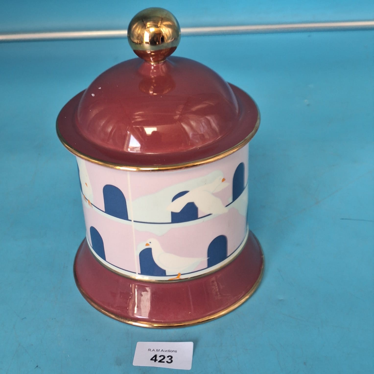 Cylindrical reddish-brown ceramic jar with a dome lid, featuring stylized white birds on architectural elements and gold trim.