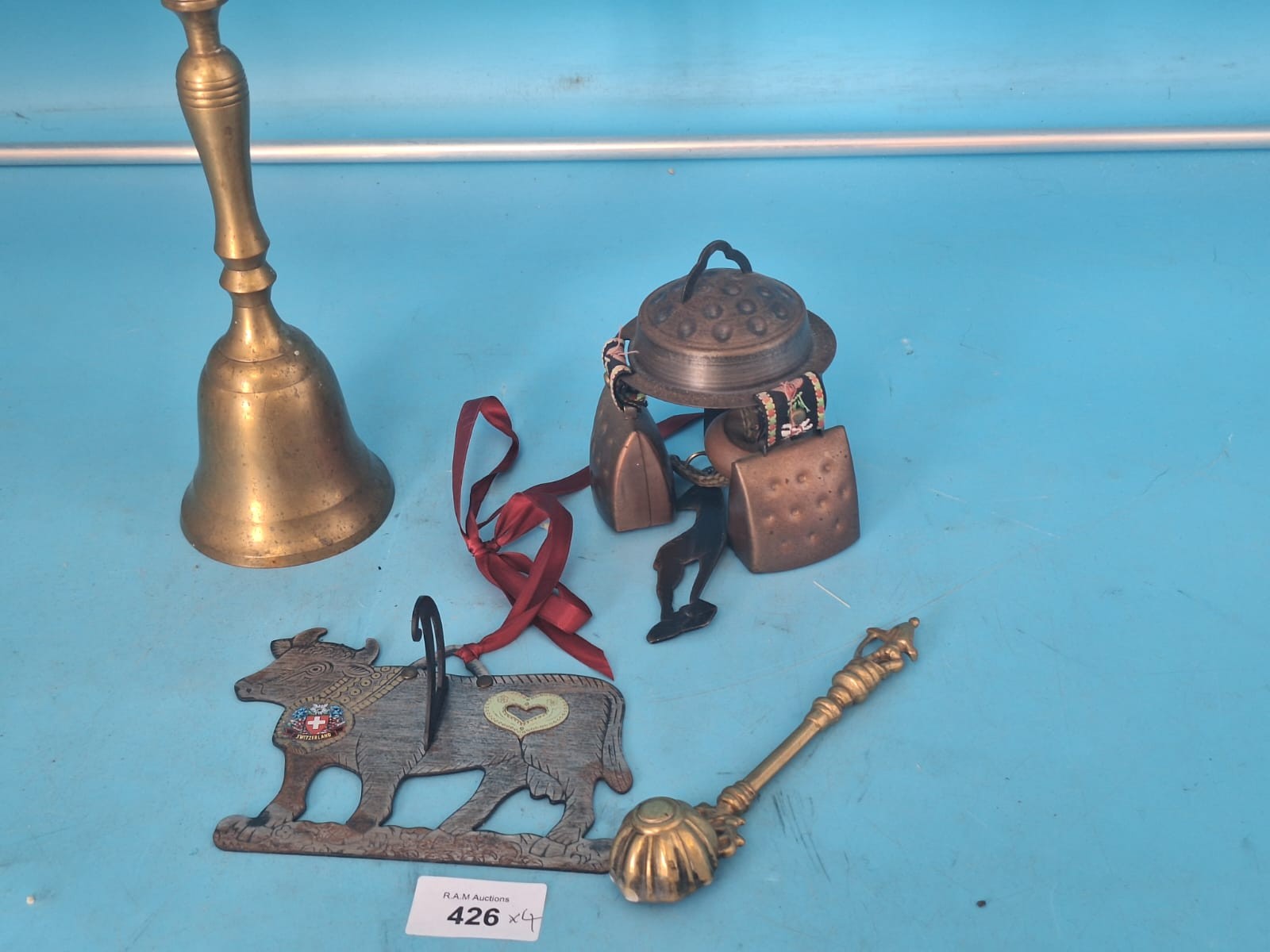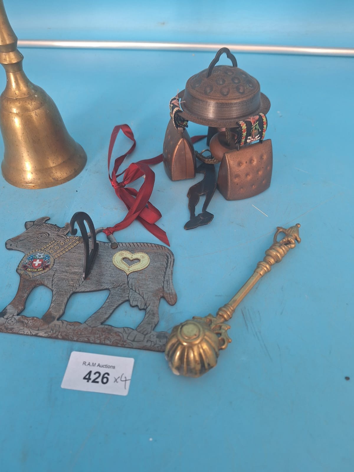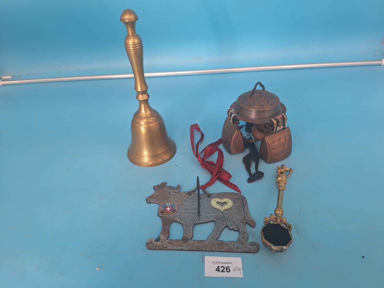 A brass bell with a slender handle, a cluster of small metal bells with a decorative element, a wooden cow figure with emblems, and a small ornate spoon.