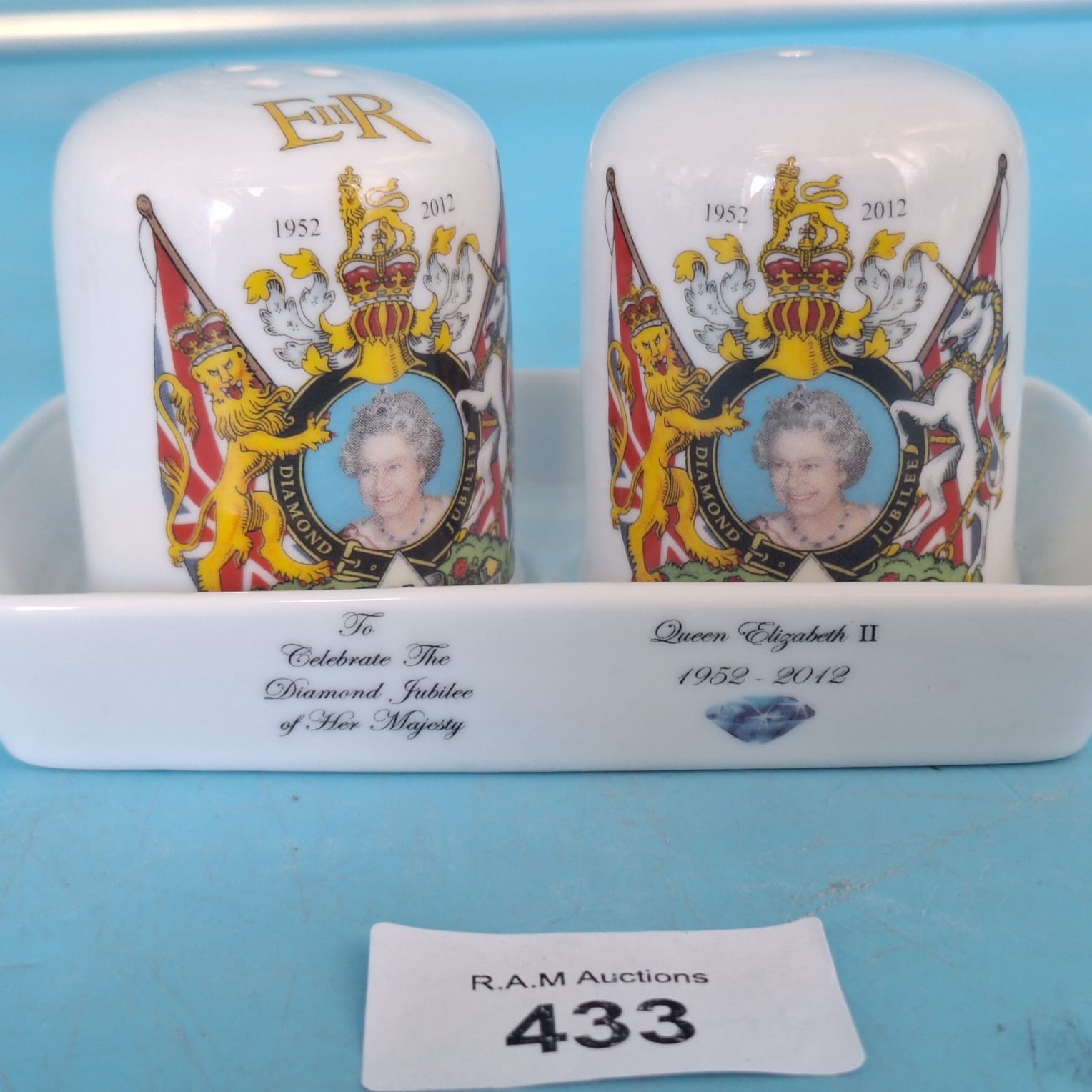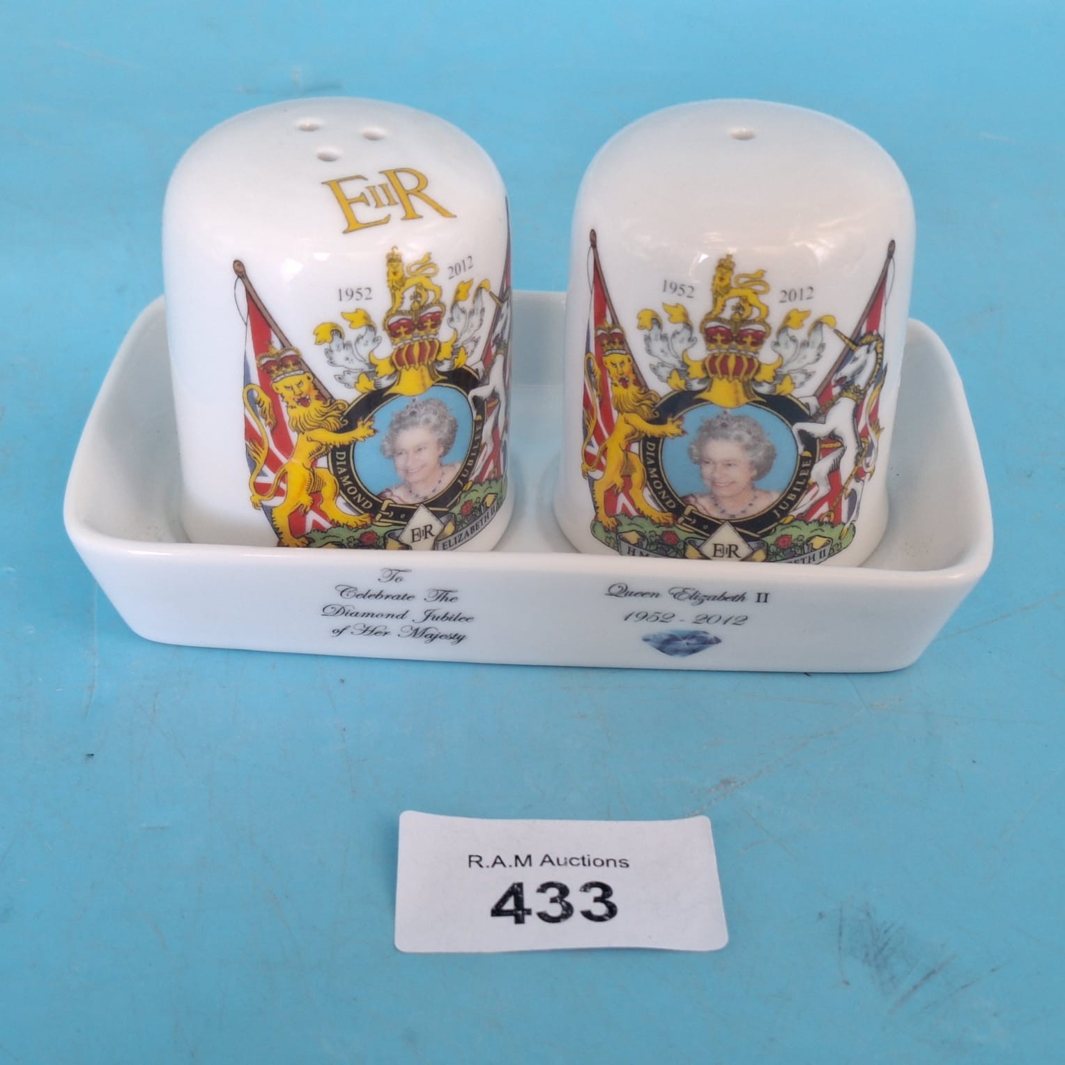 White ceramic salt and pepper shakers with a matching tray celebrating Queen Elizabeth II’s Diamond Jubilee.