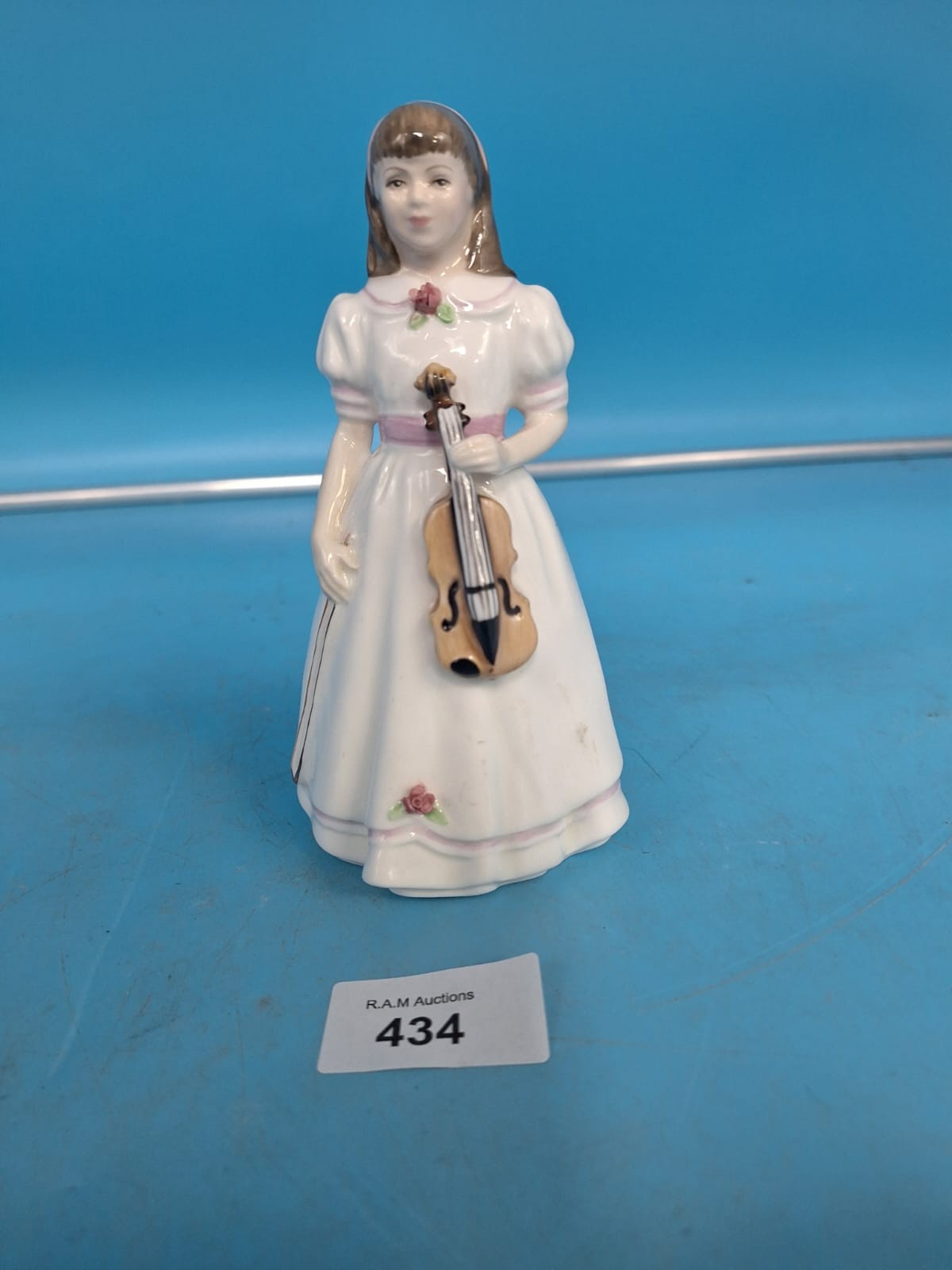 Royal Doulton porcelain figurine of a girl in a white dress holding a violin, designed by Peggy Davies.