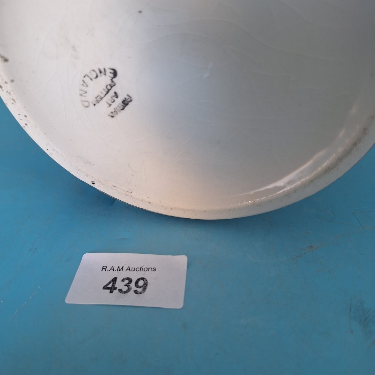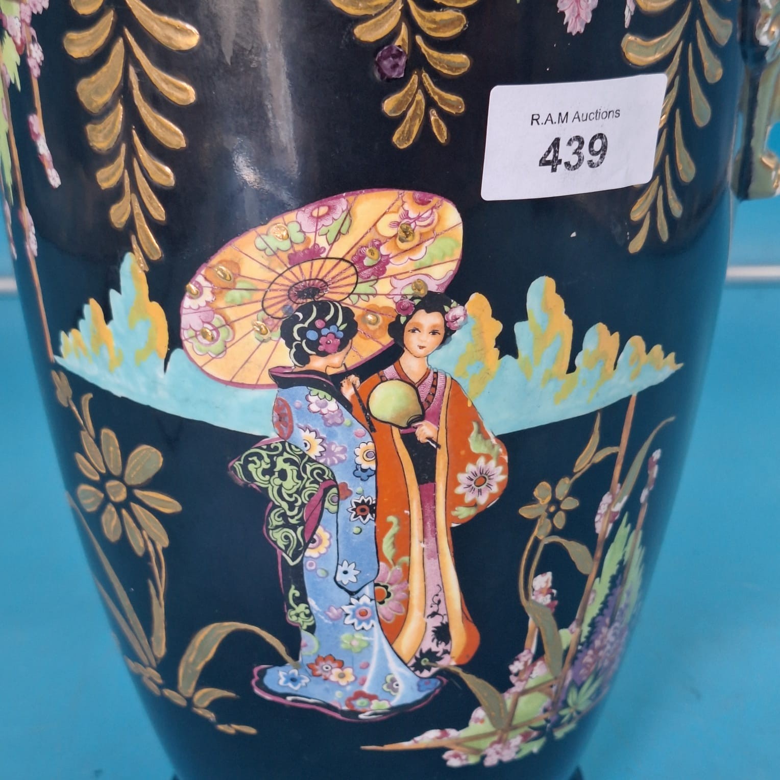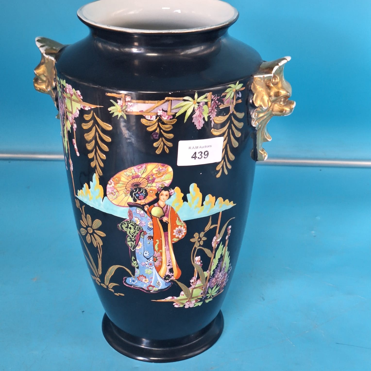Black porcelain vase with ovoid shape, gold lion-head handles, and a painted scene of women in kimonos with floral and architectural elements.