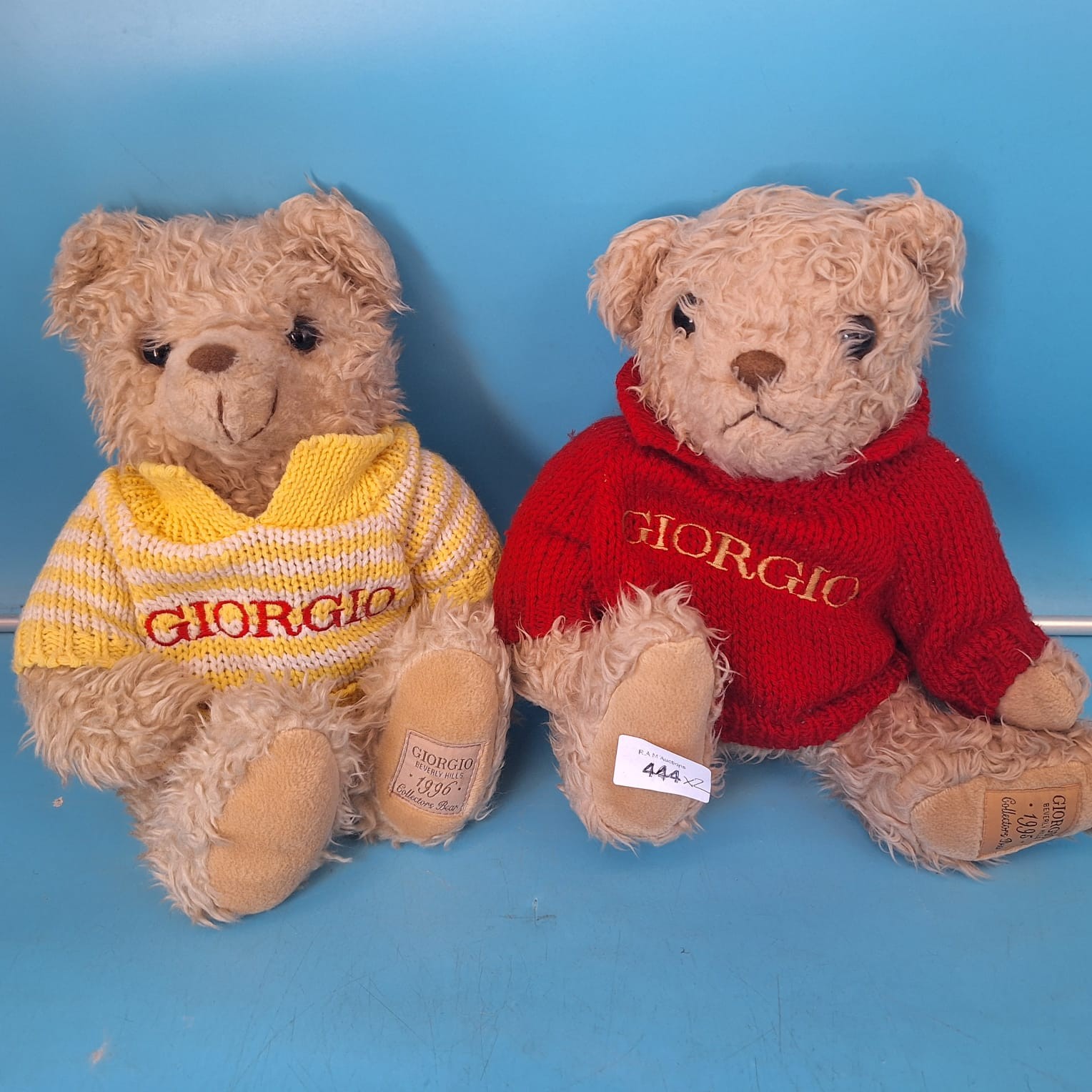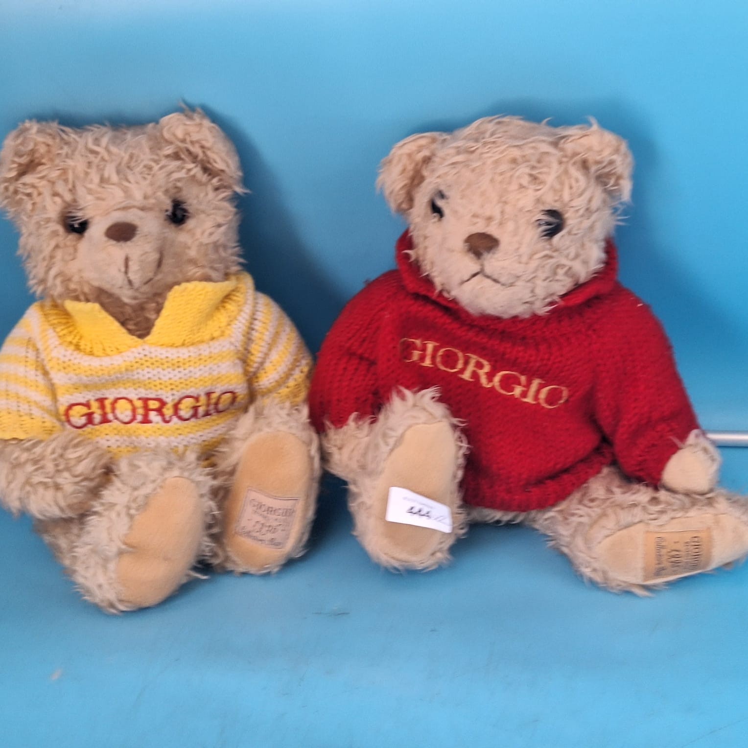 Light tan teddy bear with shaggy fur wearing a red knitted sweater embroidered with “GIORGIO”.