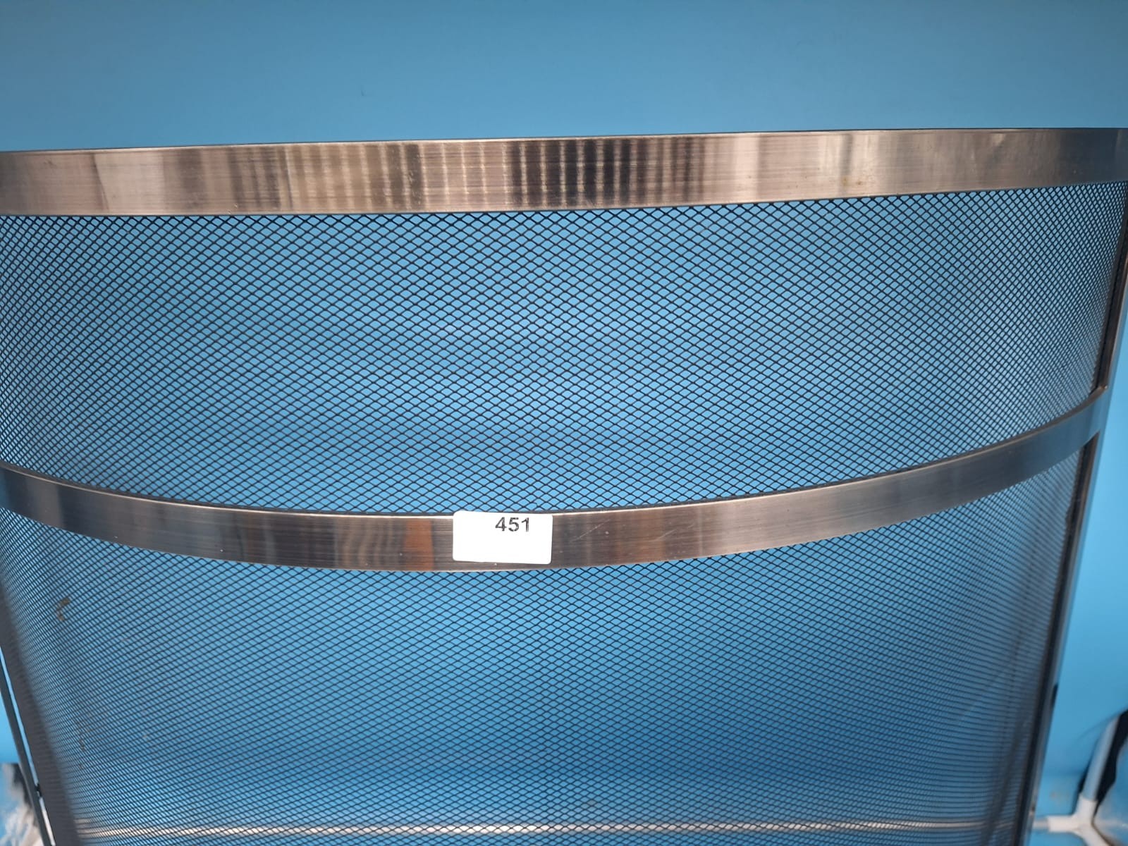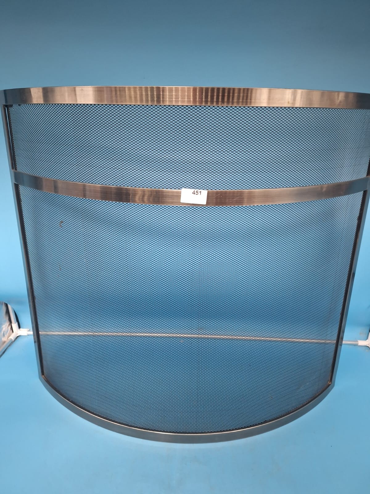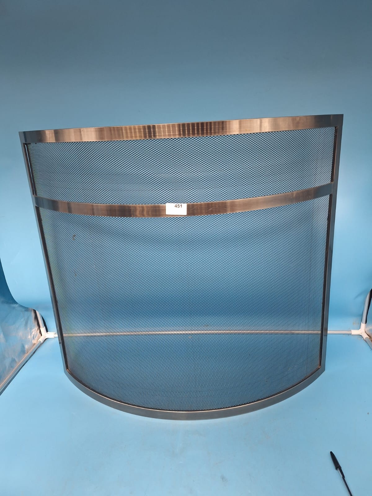 A semi-circular fireplace screen with a dark mesh center and a brushed bronze or gunmetal metallic frame.