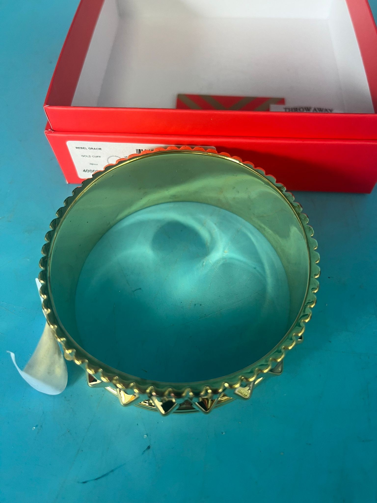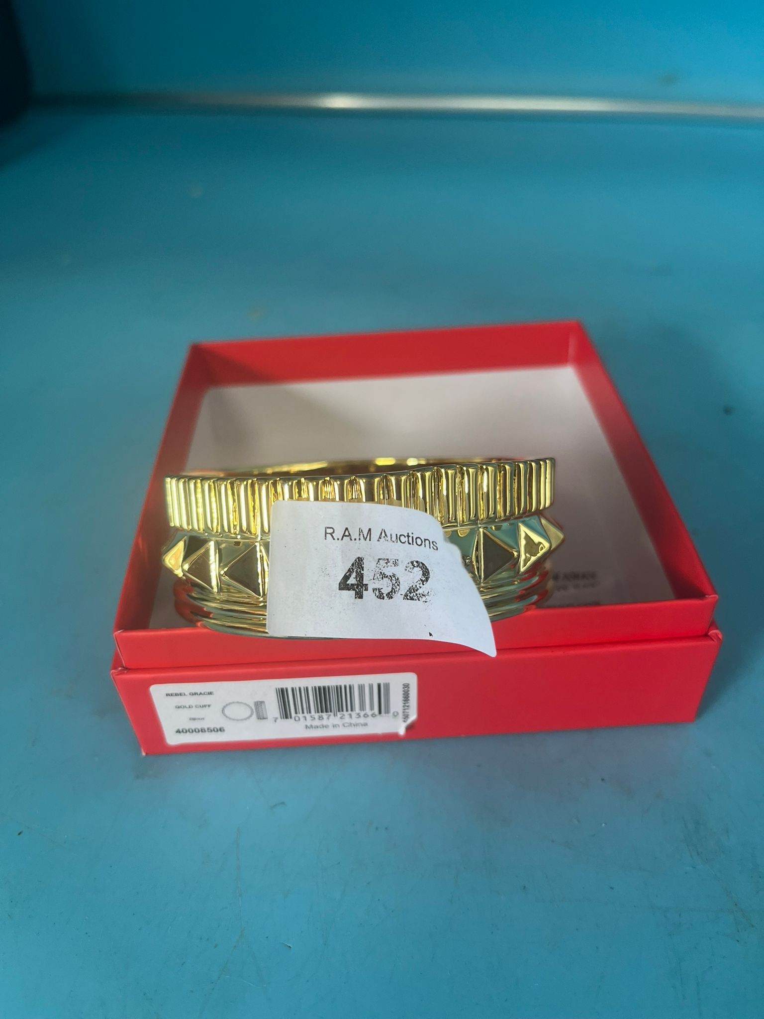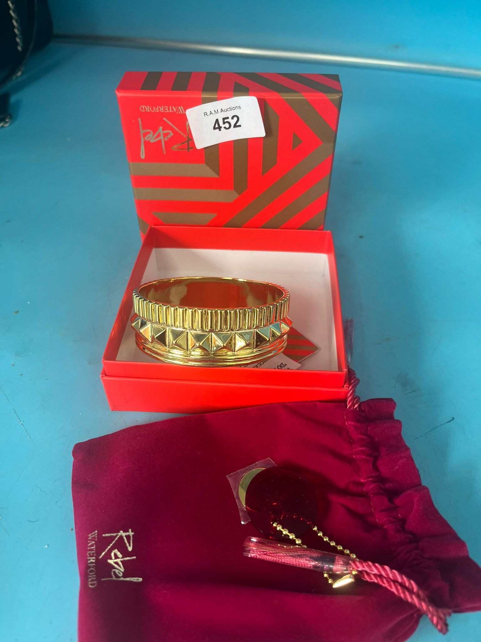 Gold-colored metal bangle bracelet with ribbed upper section and pyramidal studs, presented in a patterned red box with a drawstring pouch.