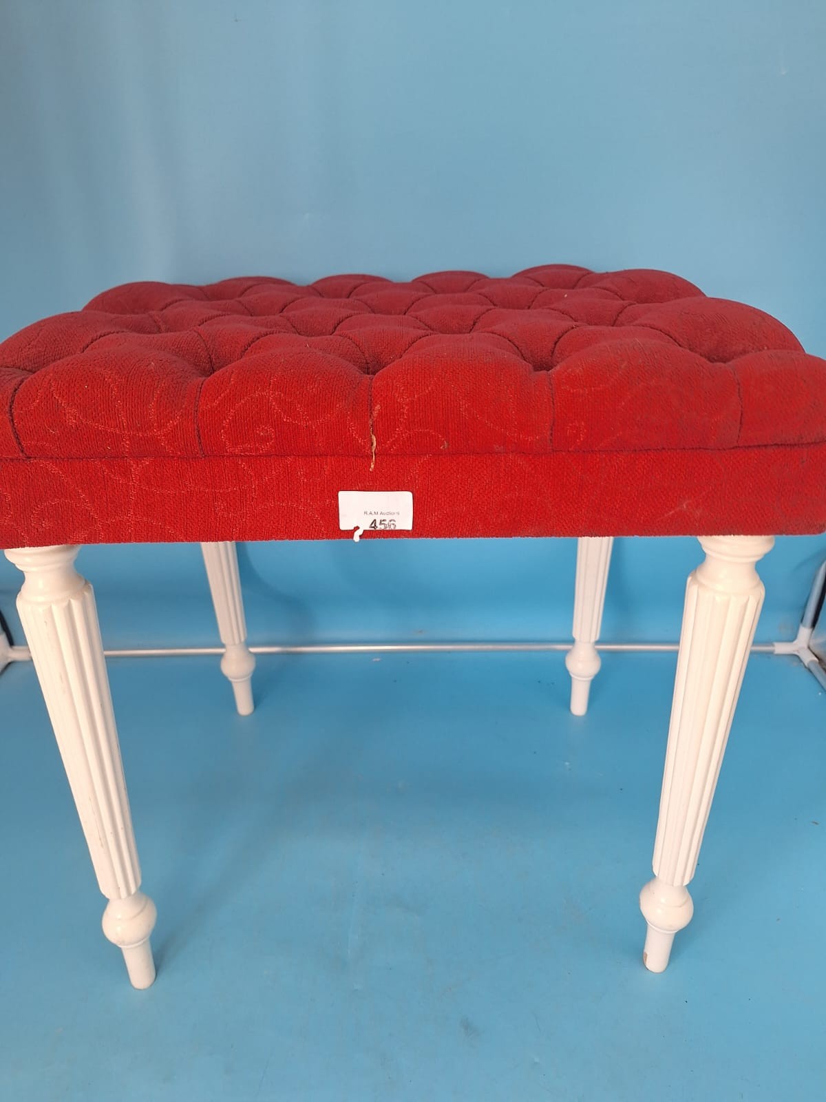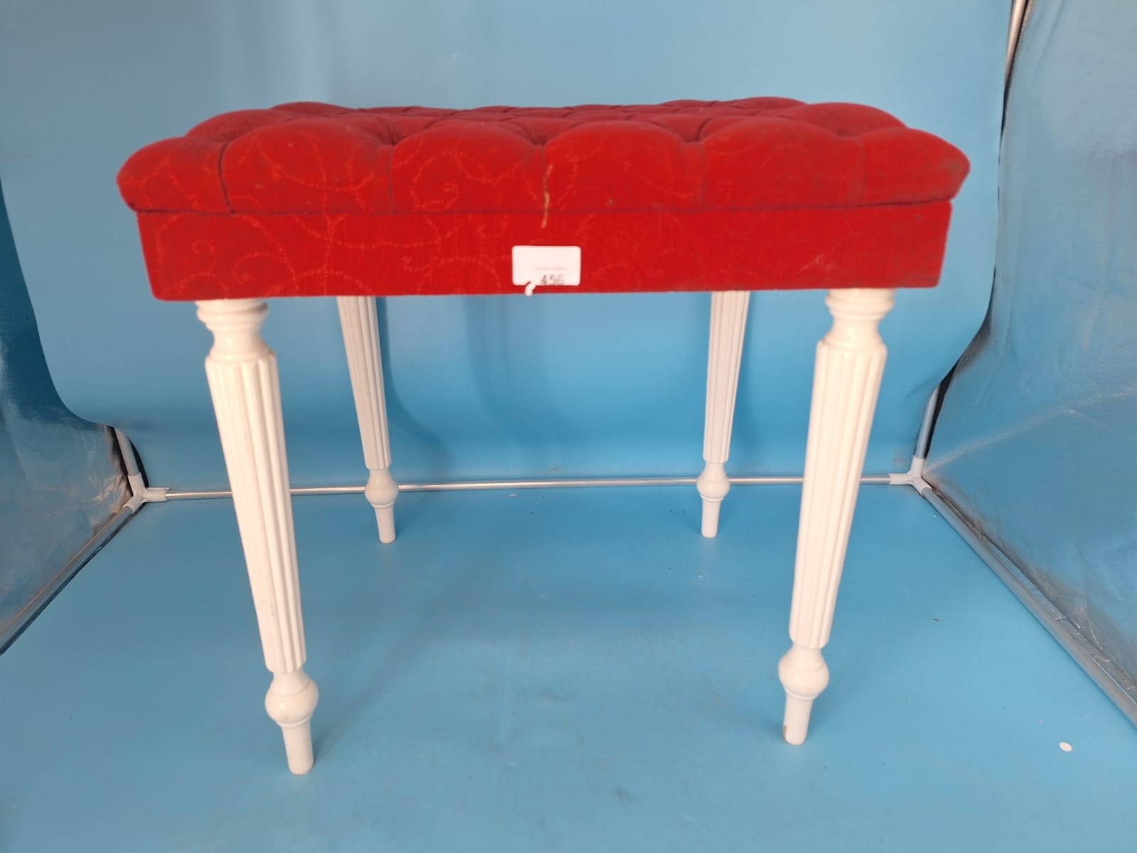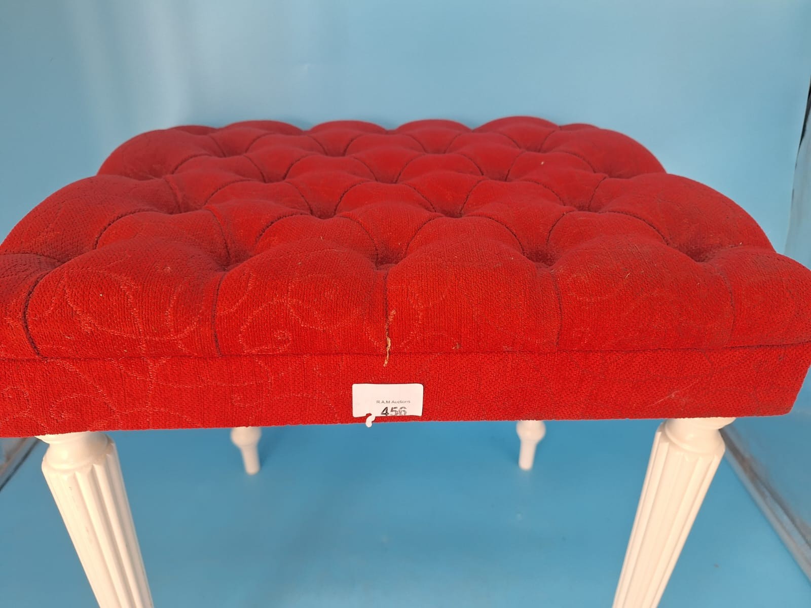 Rectangular upholstered stool with a red tufted fabric top and four white turned wooden legs.