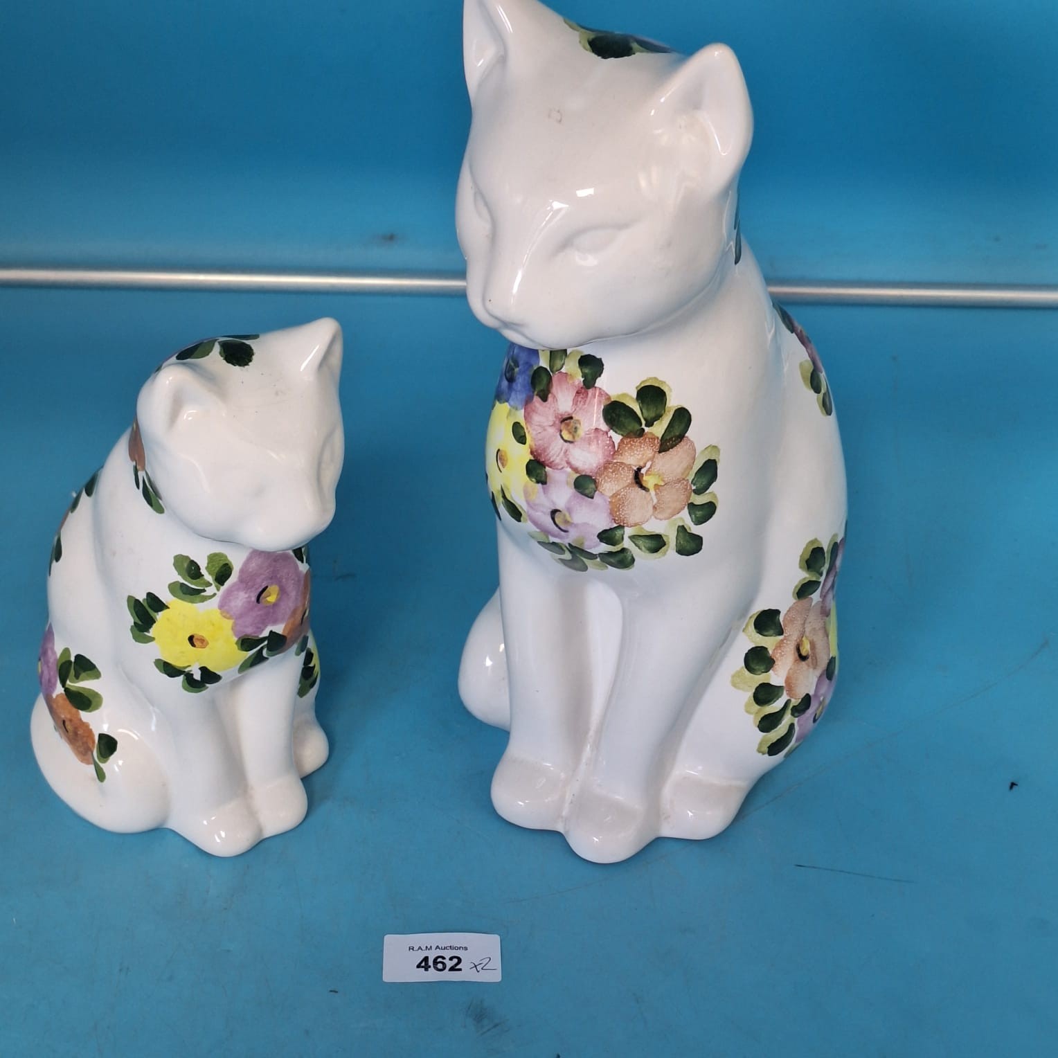 Seated ceramic cat figurines with hand-painted floral designs.