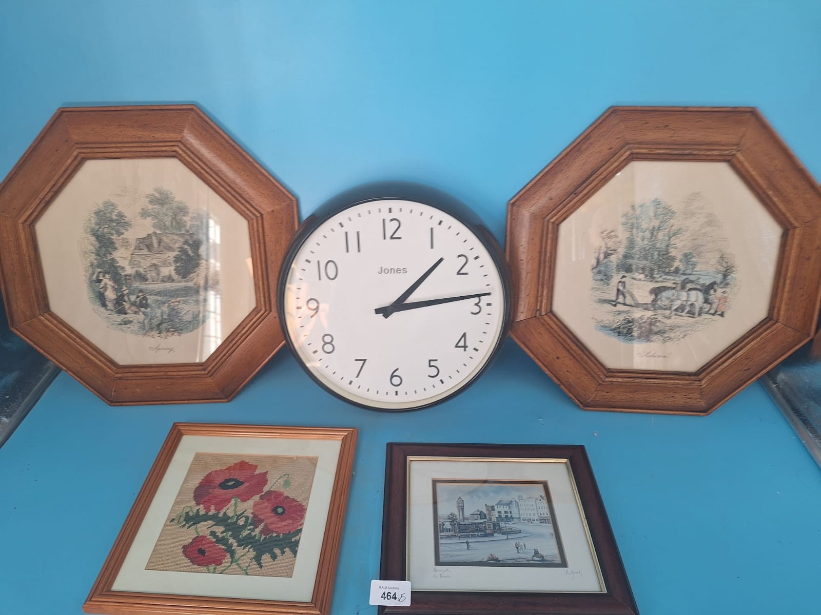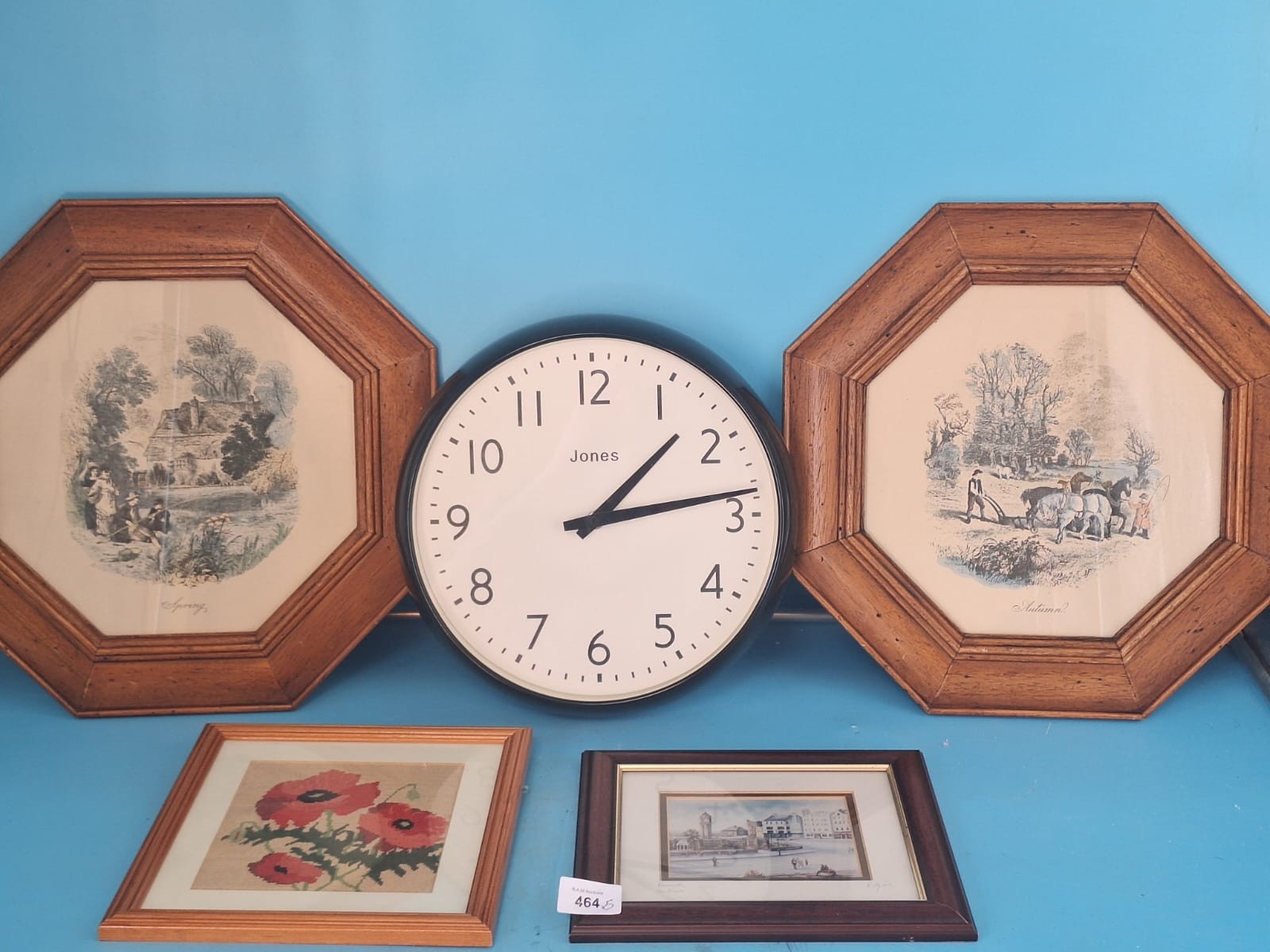 Round black wall clock with white face, octagonal wood-framed landscape prints, embroidered poppy picture, and sepia-toned town scene print.