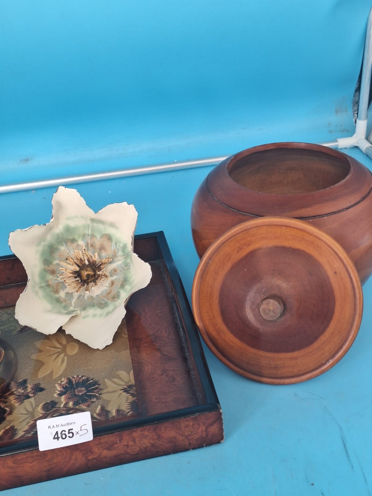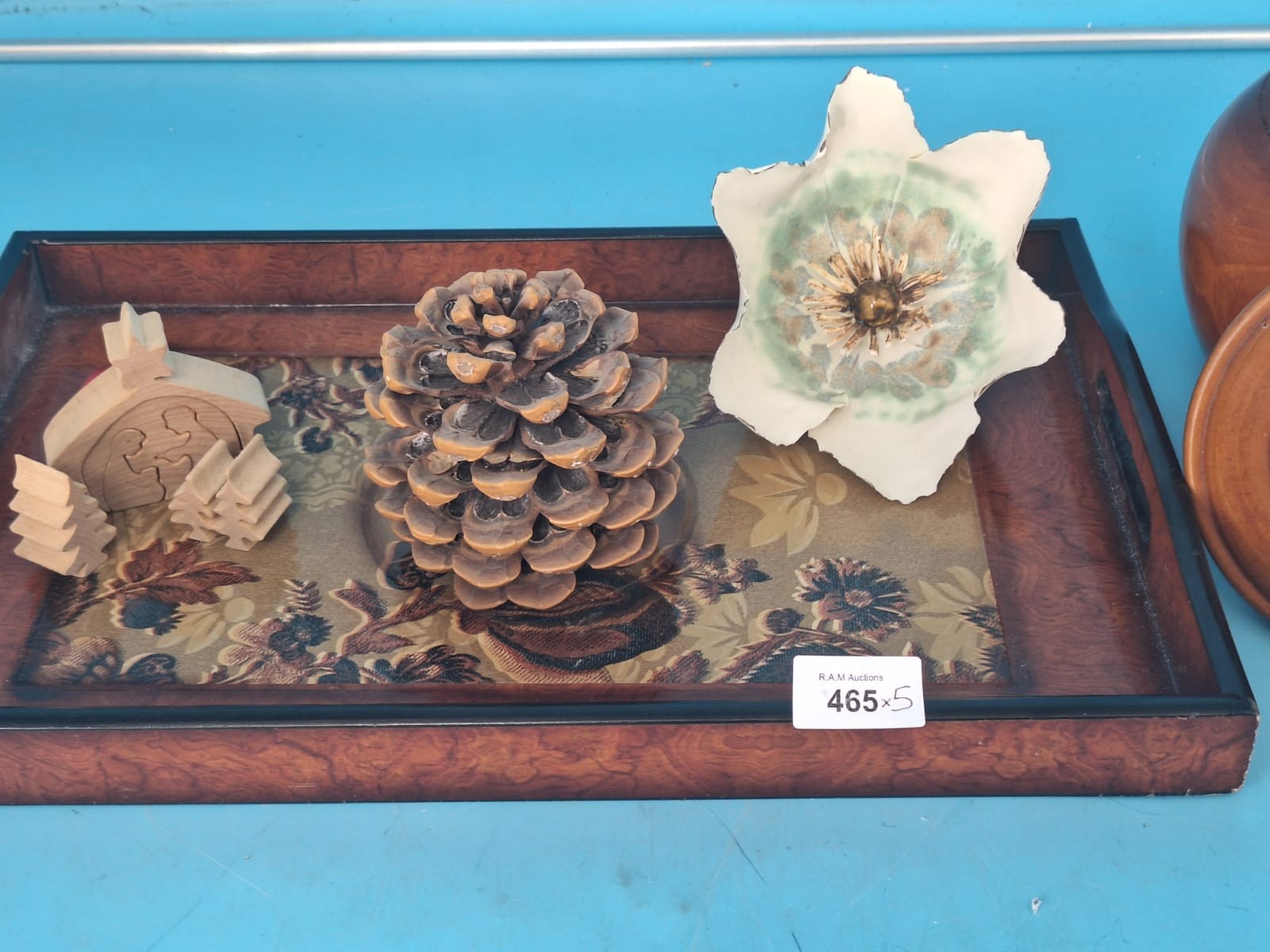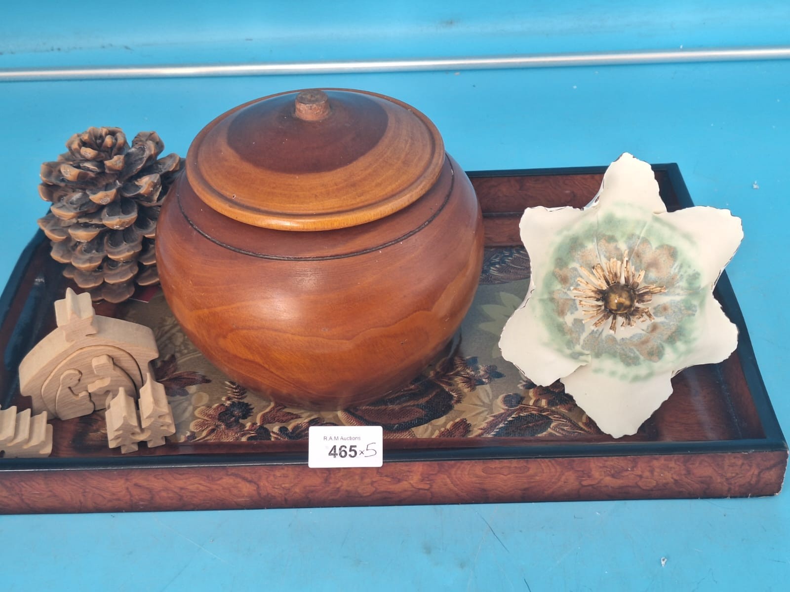 A wooden tray with a floral inset, a lidded wooden bowl, a decorative flower, a pine cone, and wooden puzzle pieces.