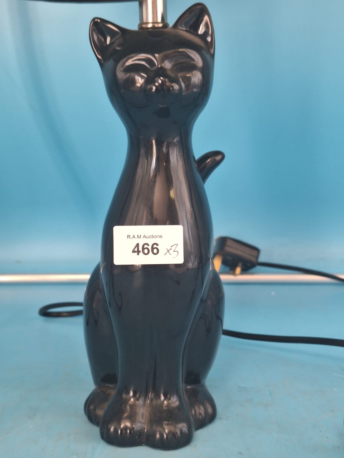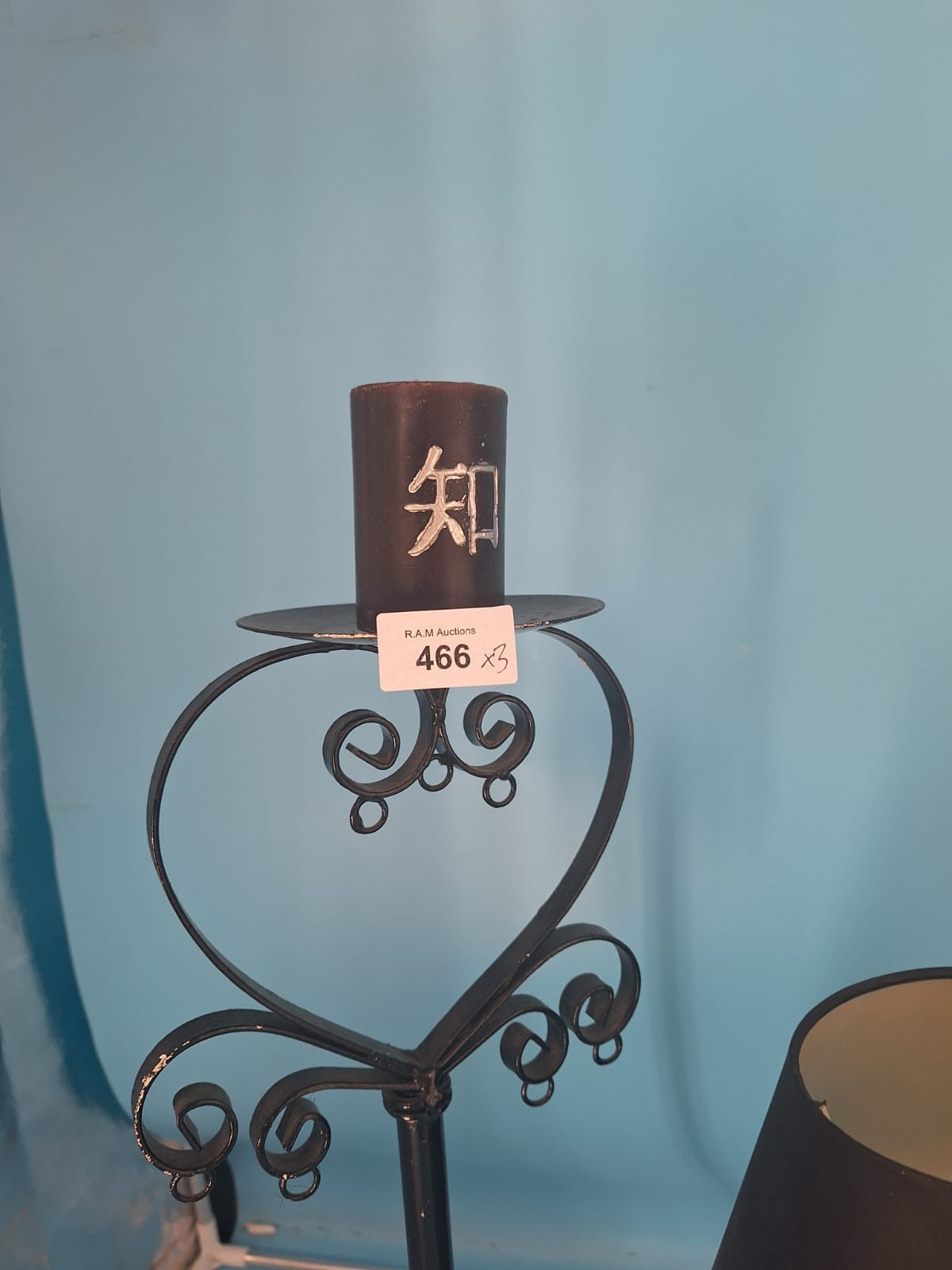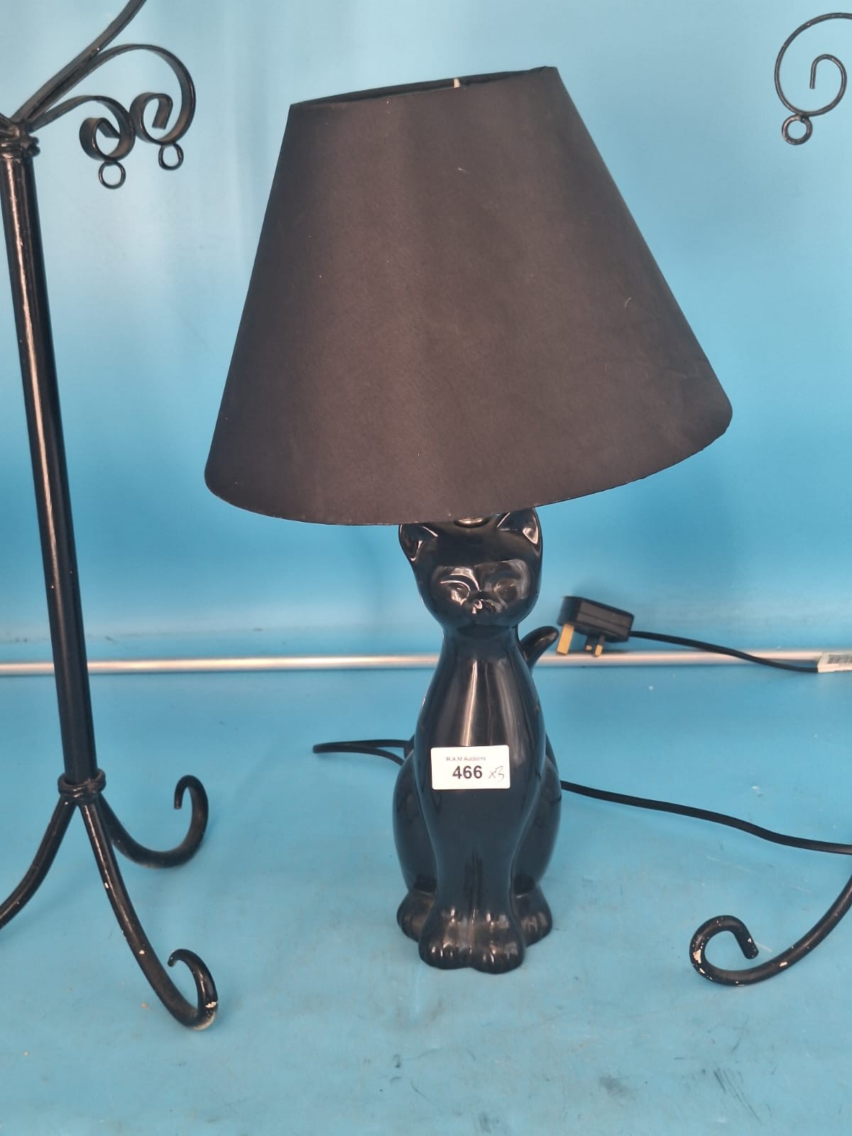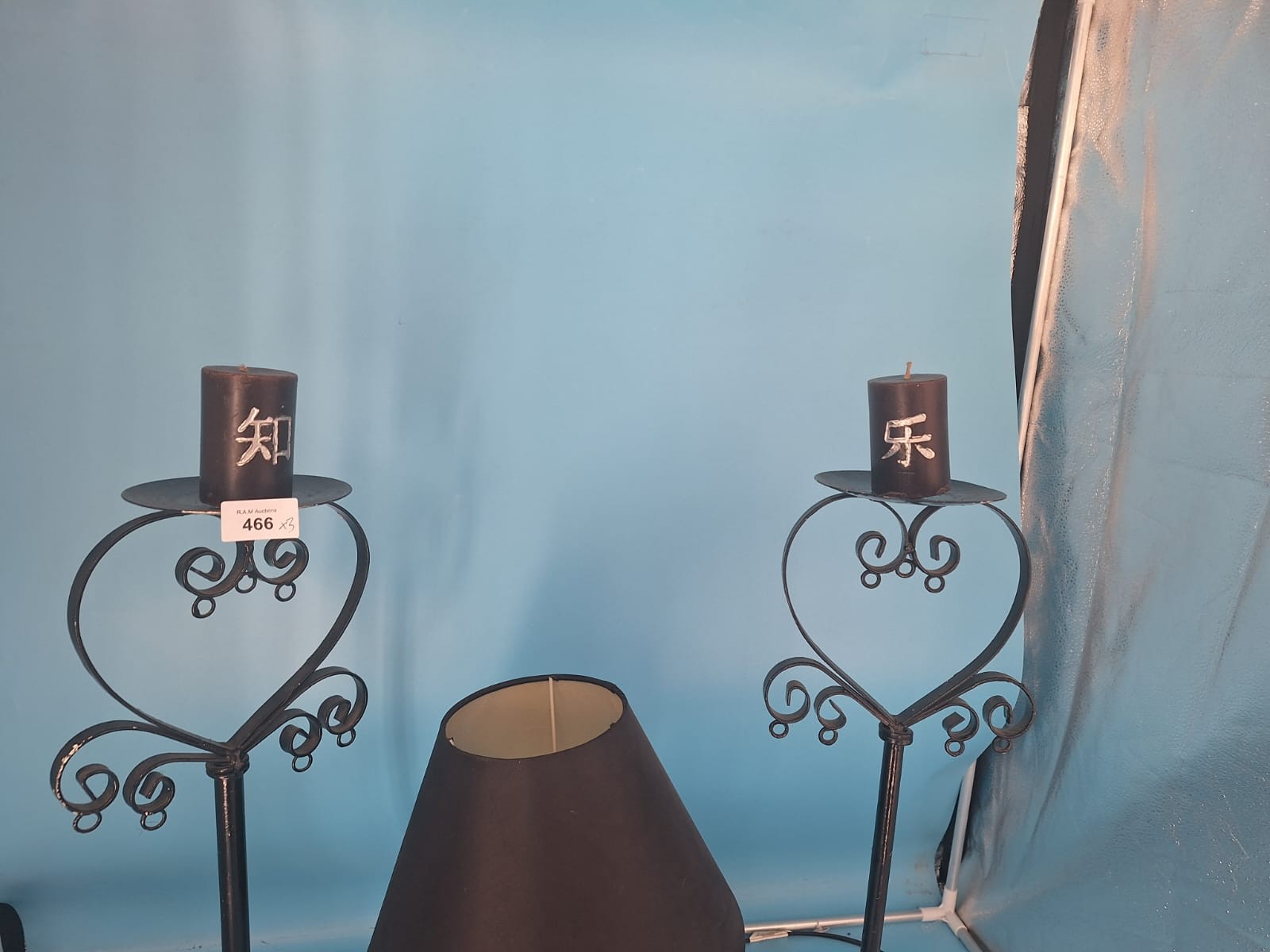 Black metal candle holders with scrolled heart tops and a black ceramic cat table lamp with a fabric shade.
