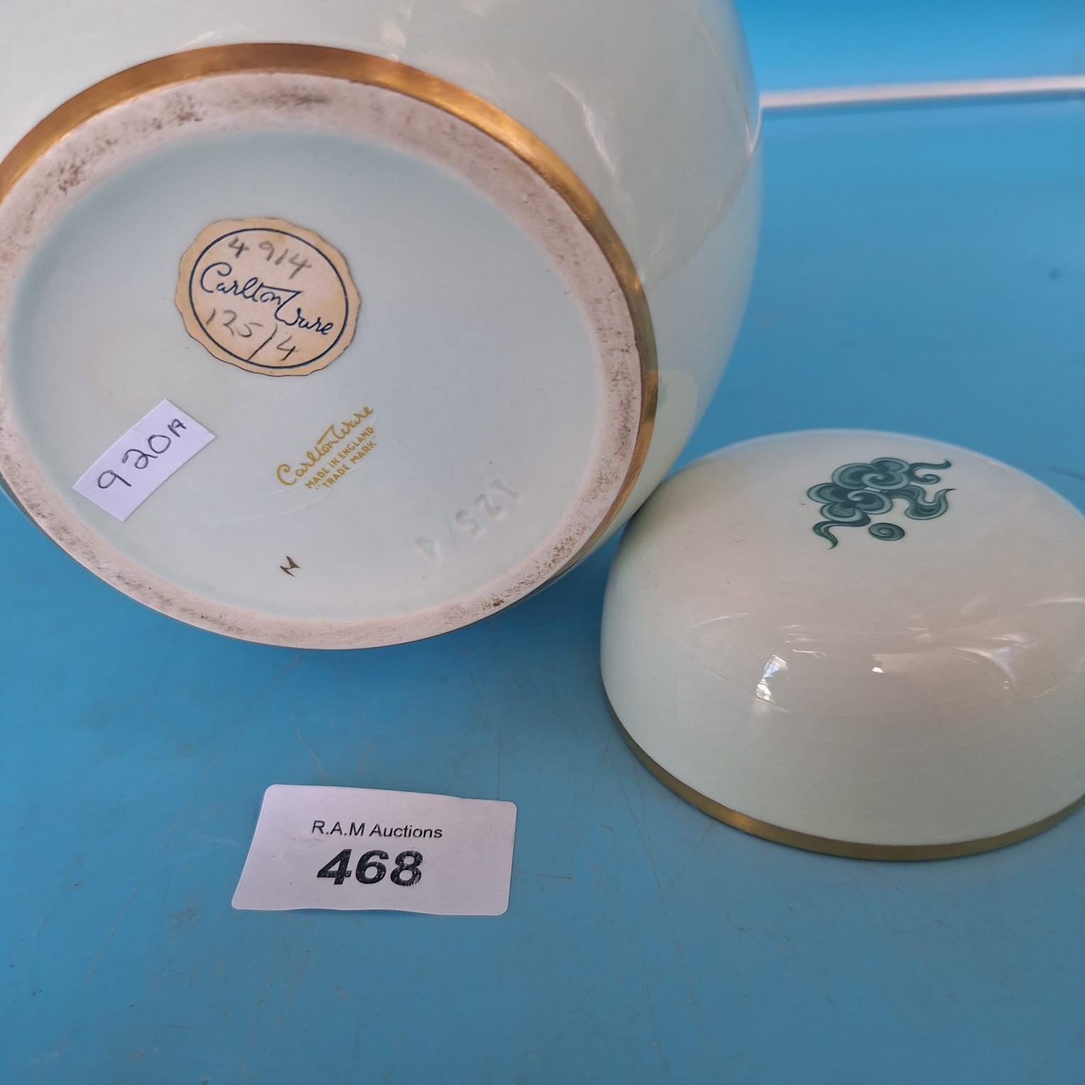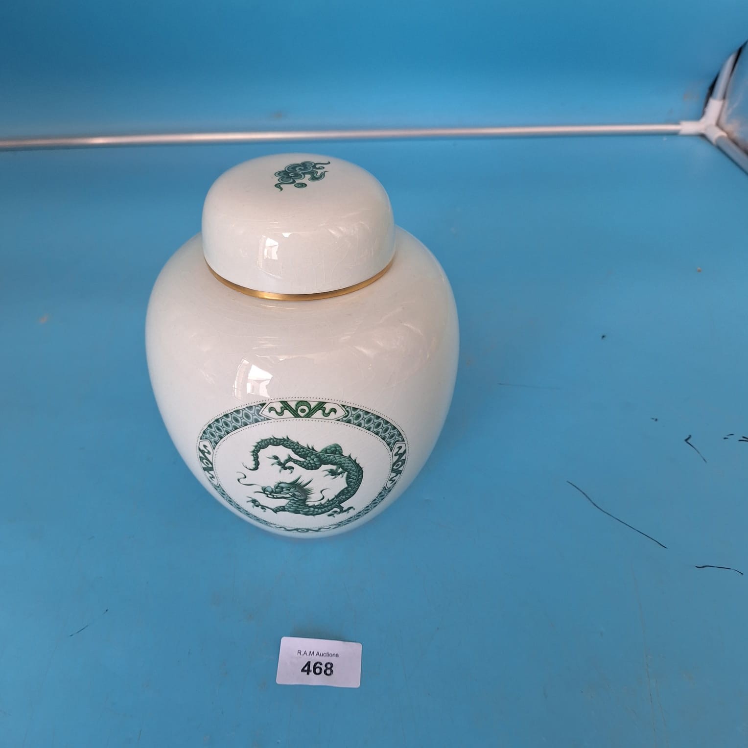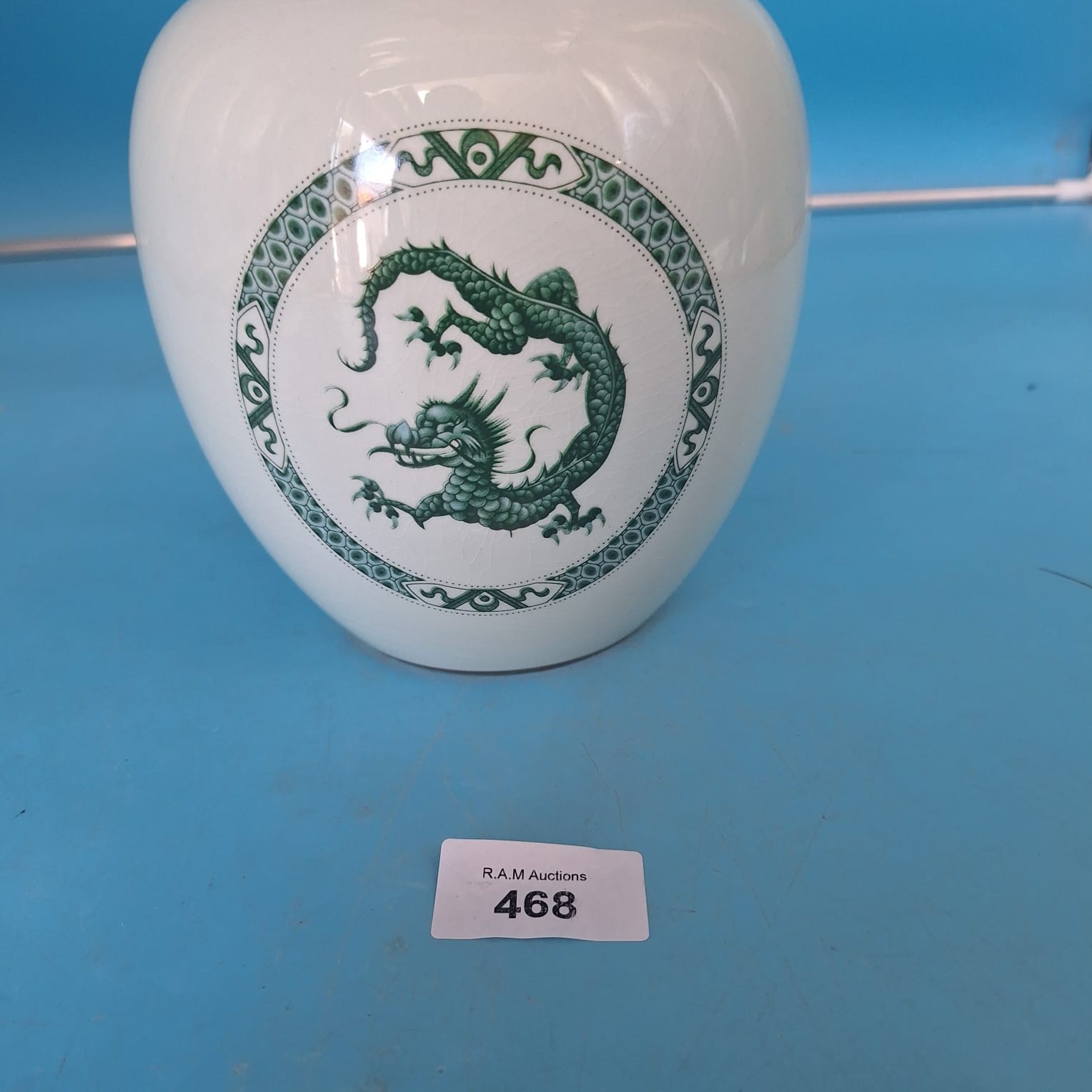 Off-white porcelain ginger jar with a matching lid, featuring a green dragon motif and gold bands.