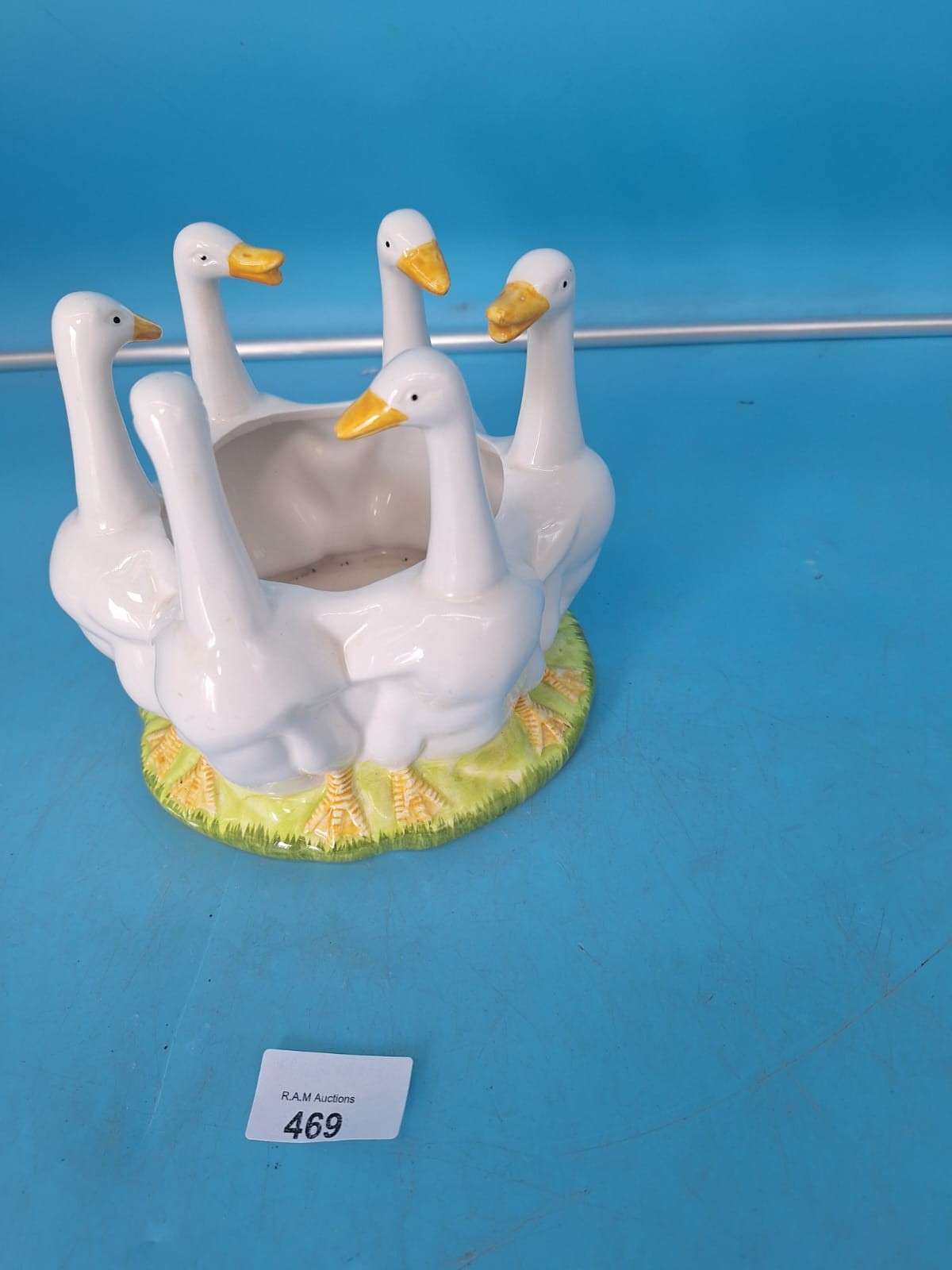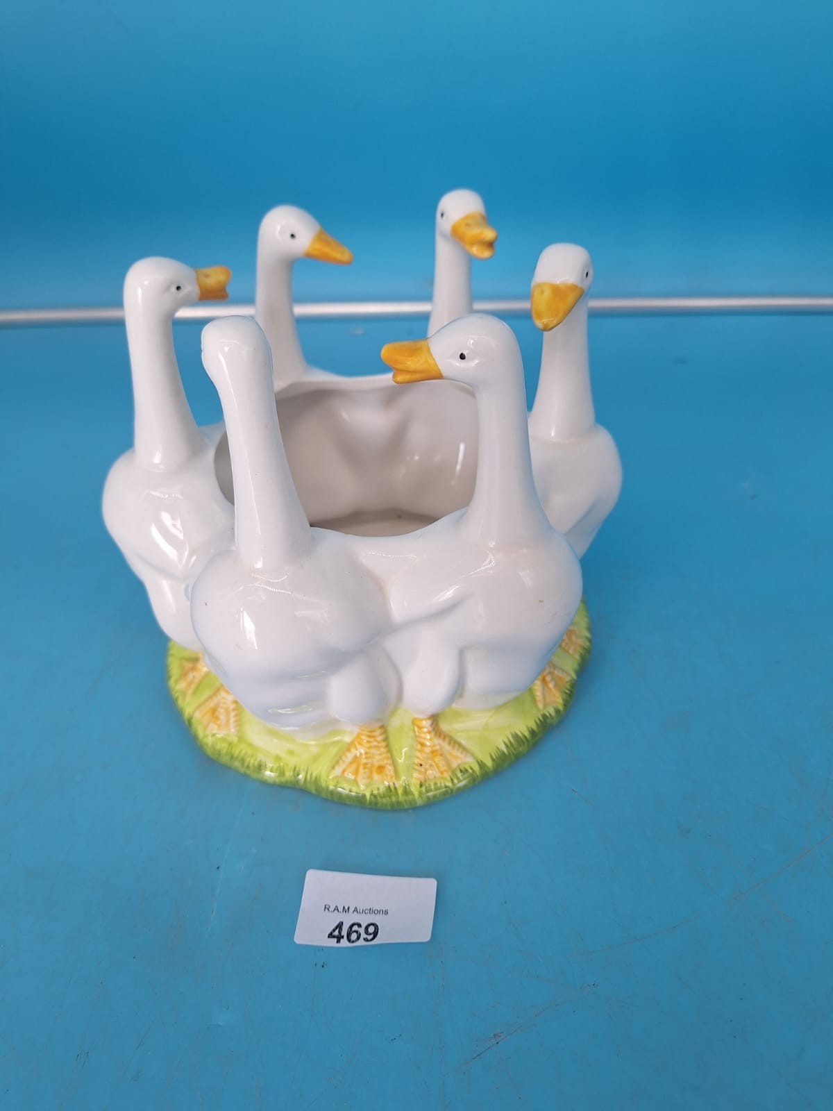 Circular ceramic planter with five stylized geese around a central bowl, featuring a green base band.