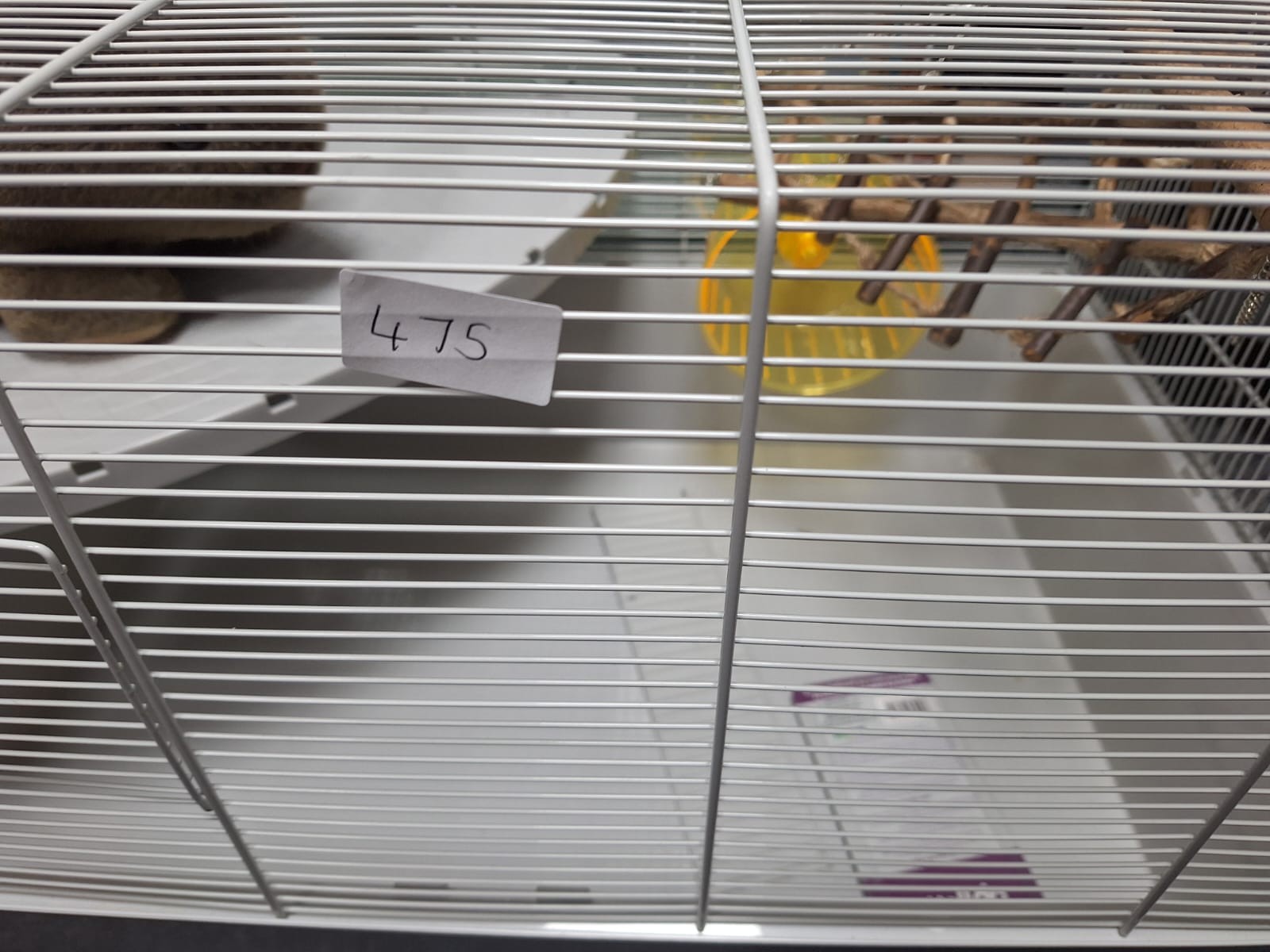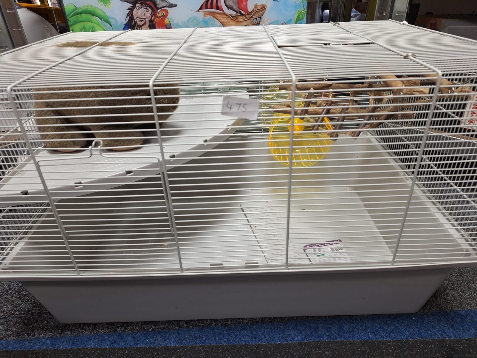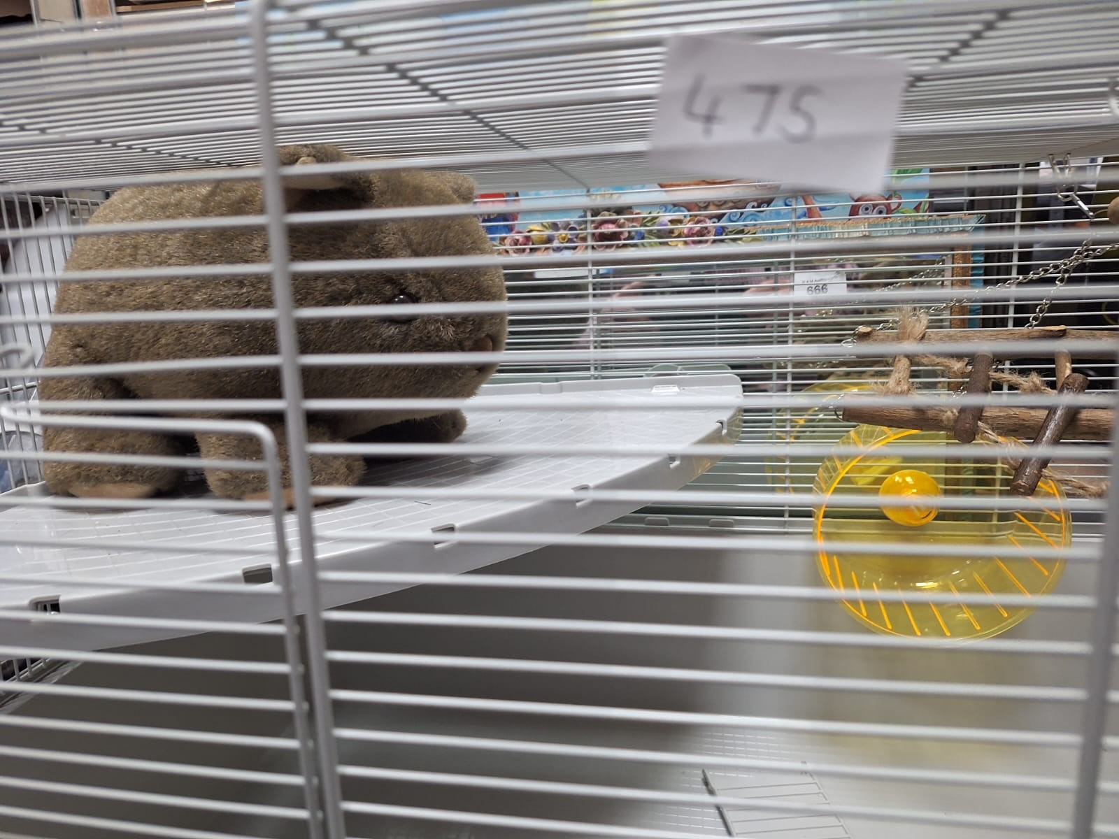 Rectangular wire mesh cage with plastic base, plush toy, exercise wheel, wooden branches, and ramp.